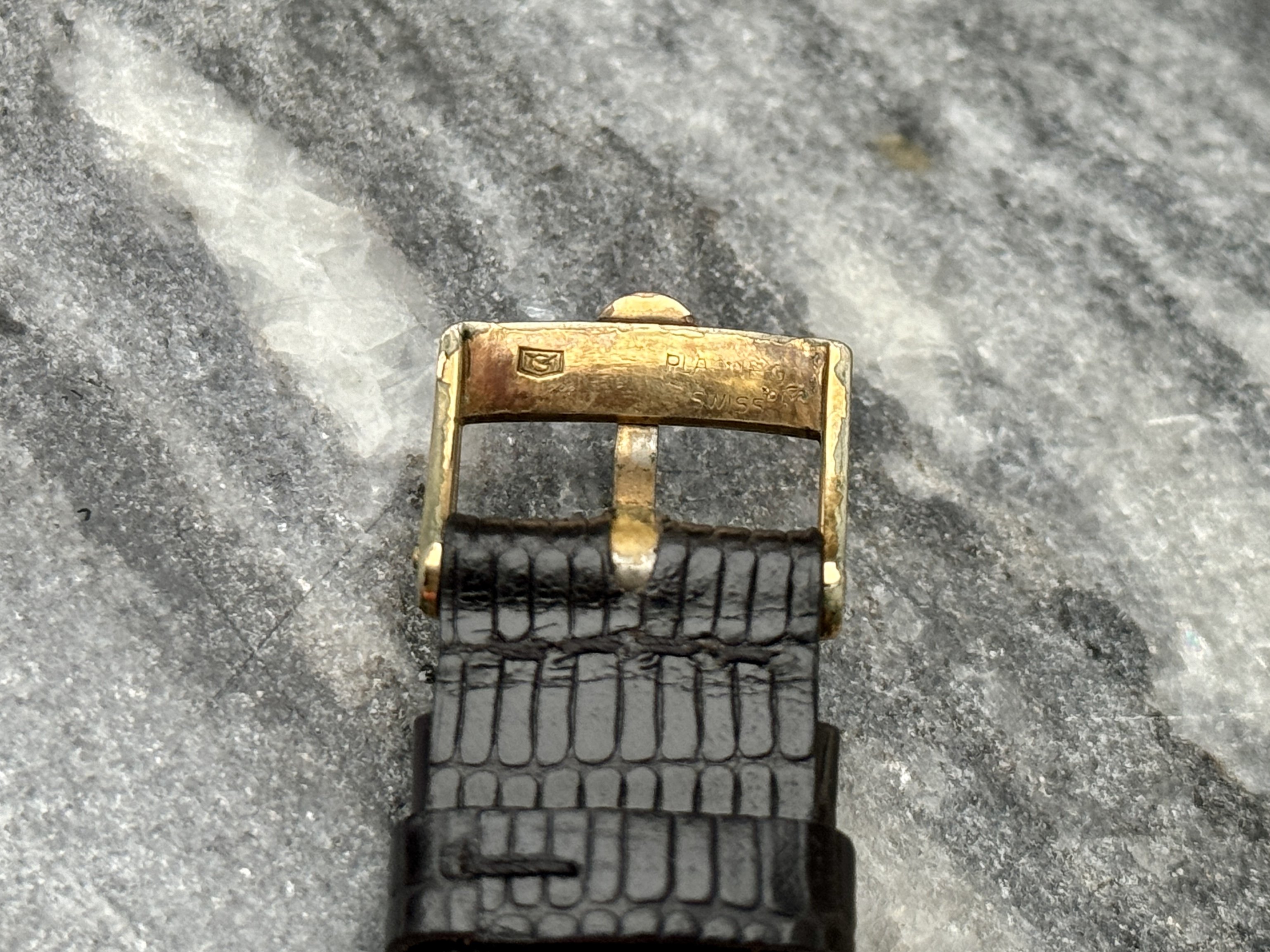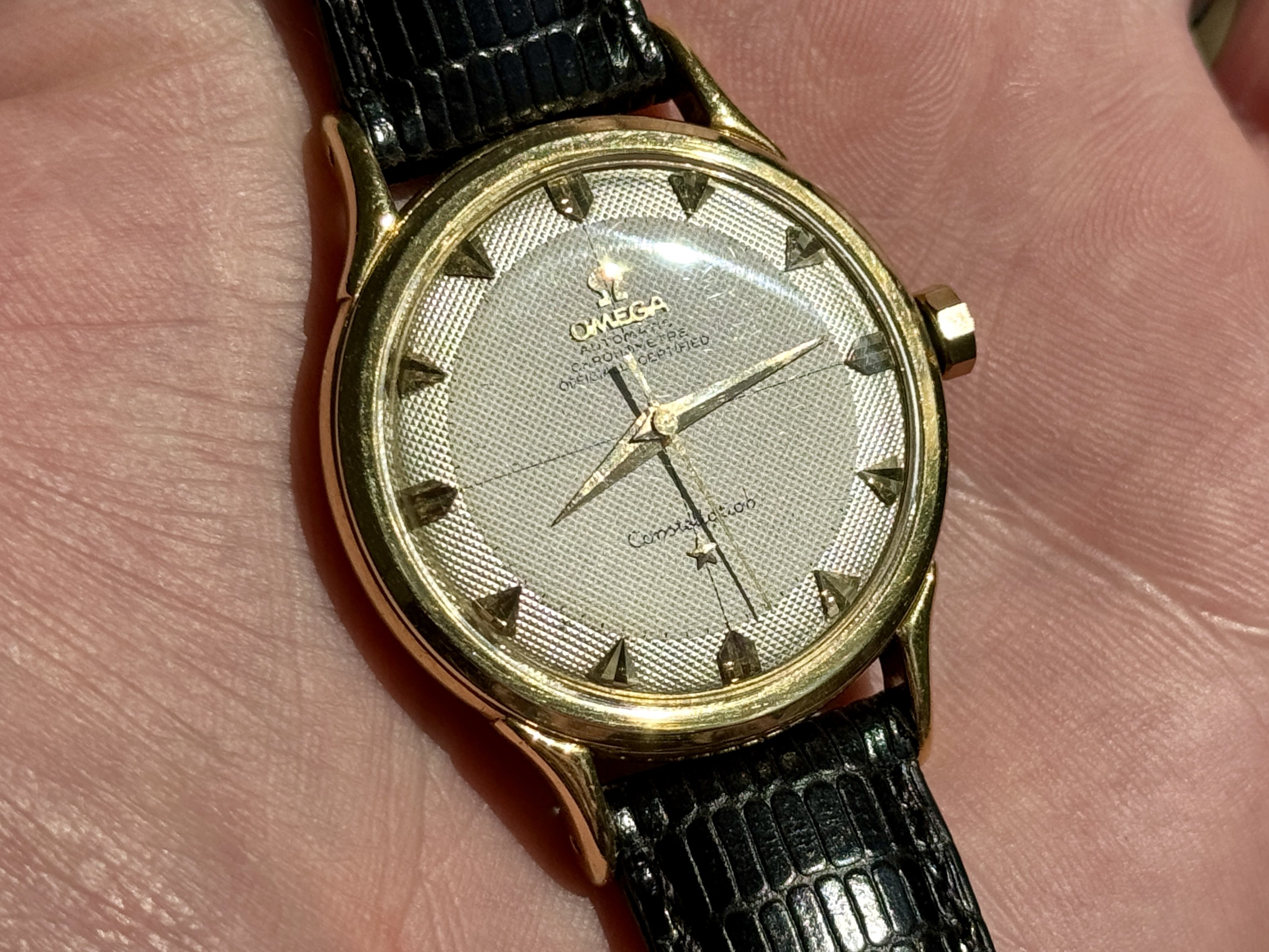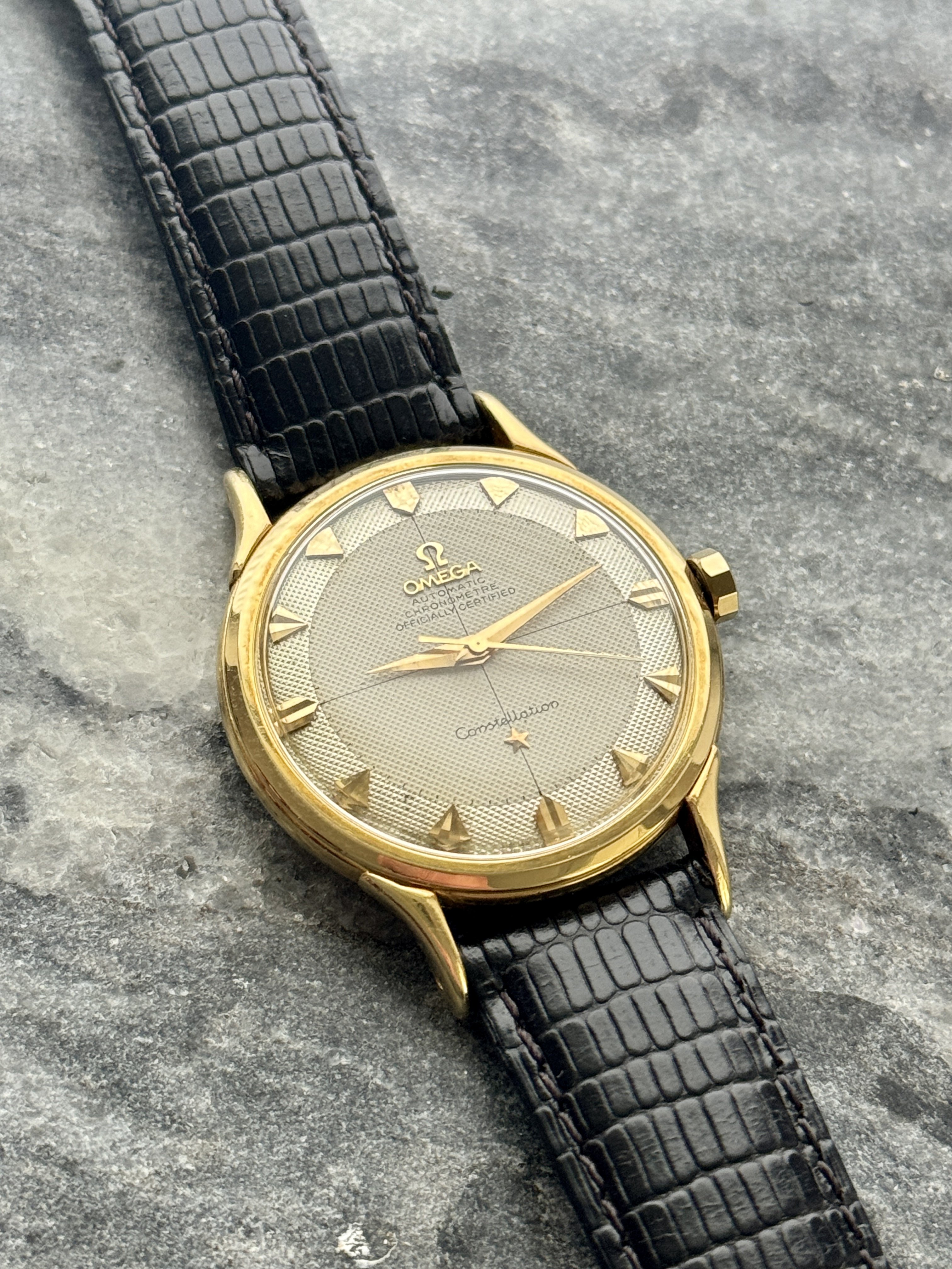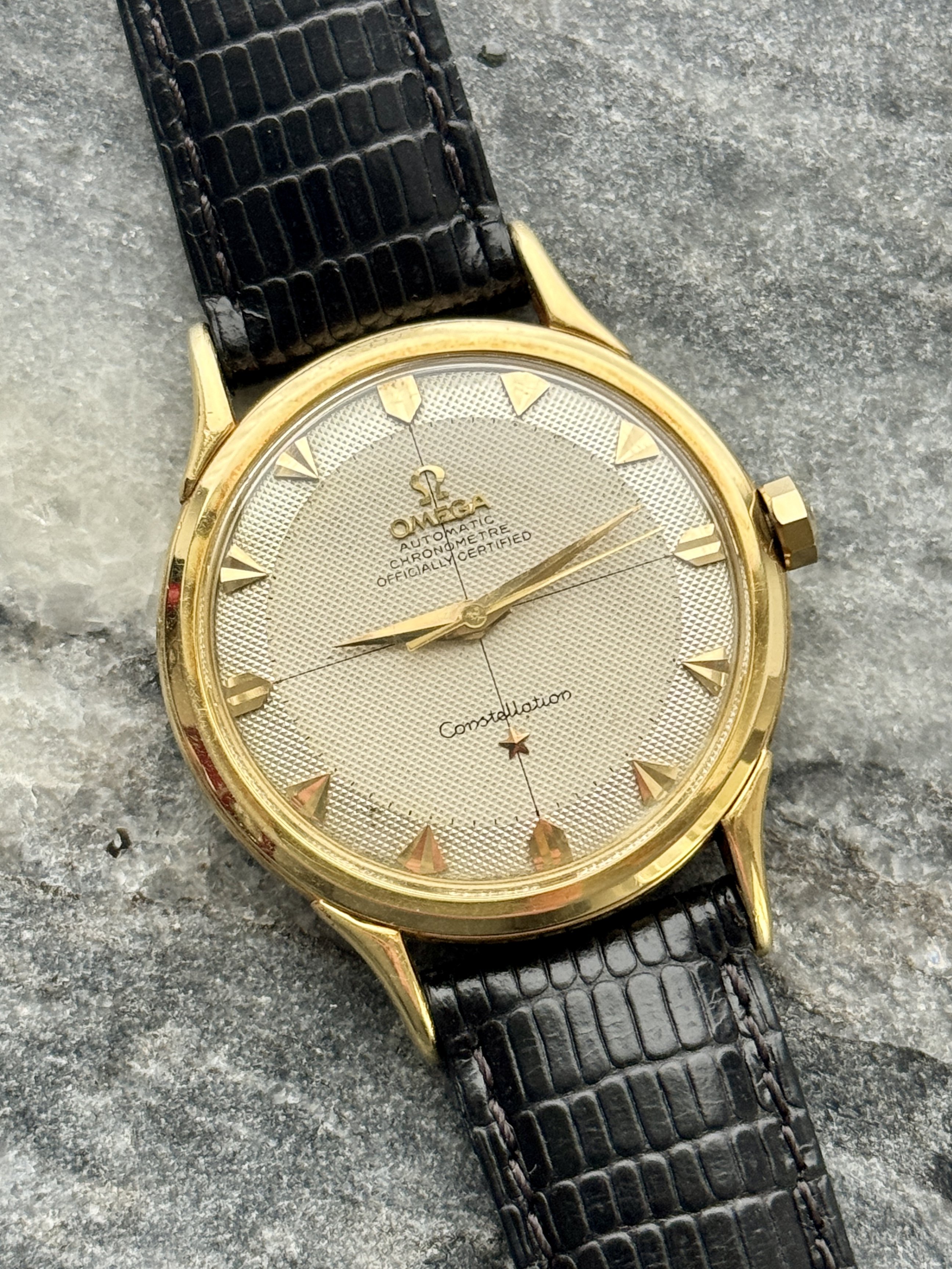 Strap & buckle: Black lizard strap, period-correct, gold-plated Omega buckle.