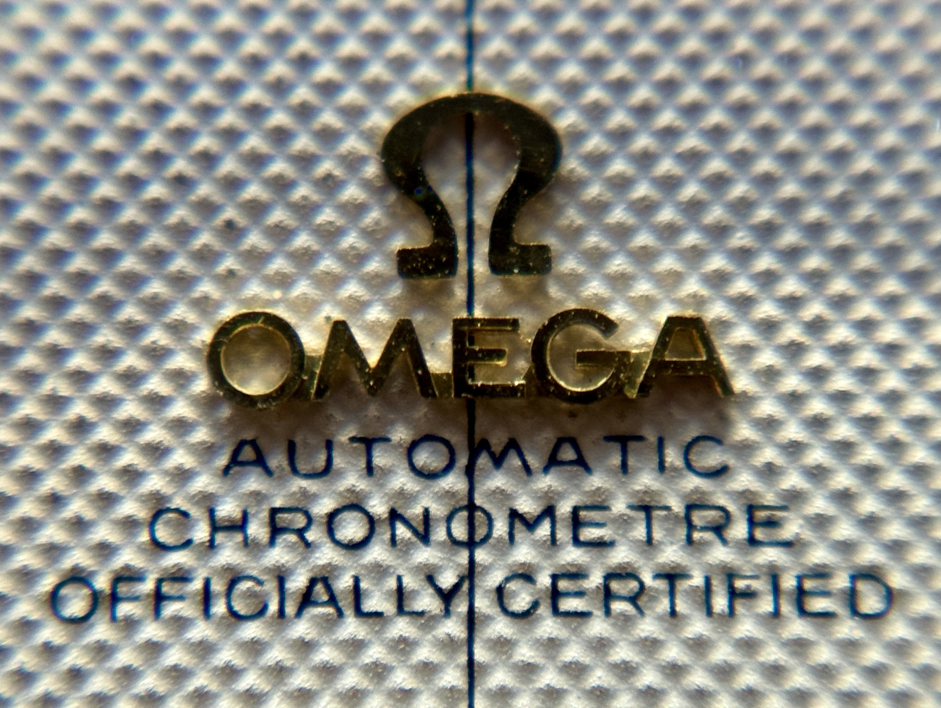 Dial: Original two-tone dome dial, honeycomb structure, solid gold arrowhead-indices, cross-hair, applied solid gold Omega logo and writing.
