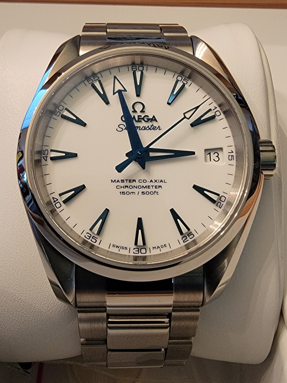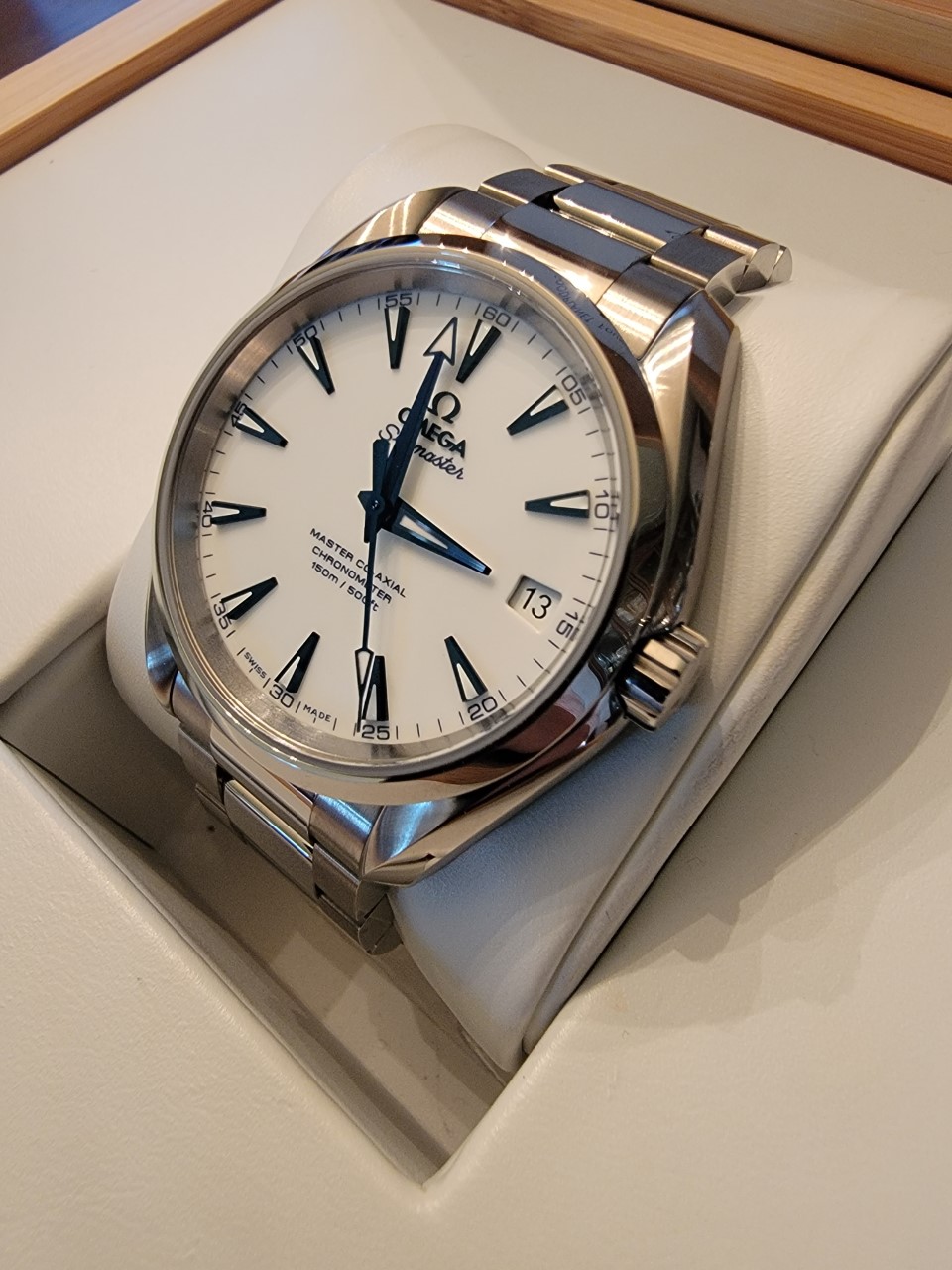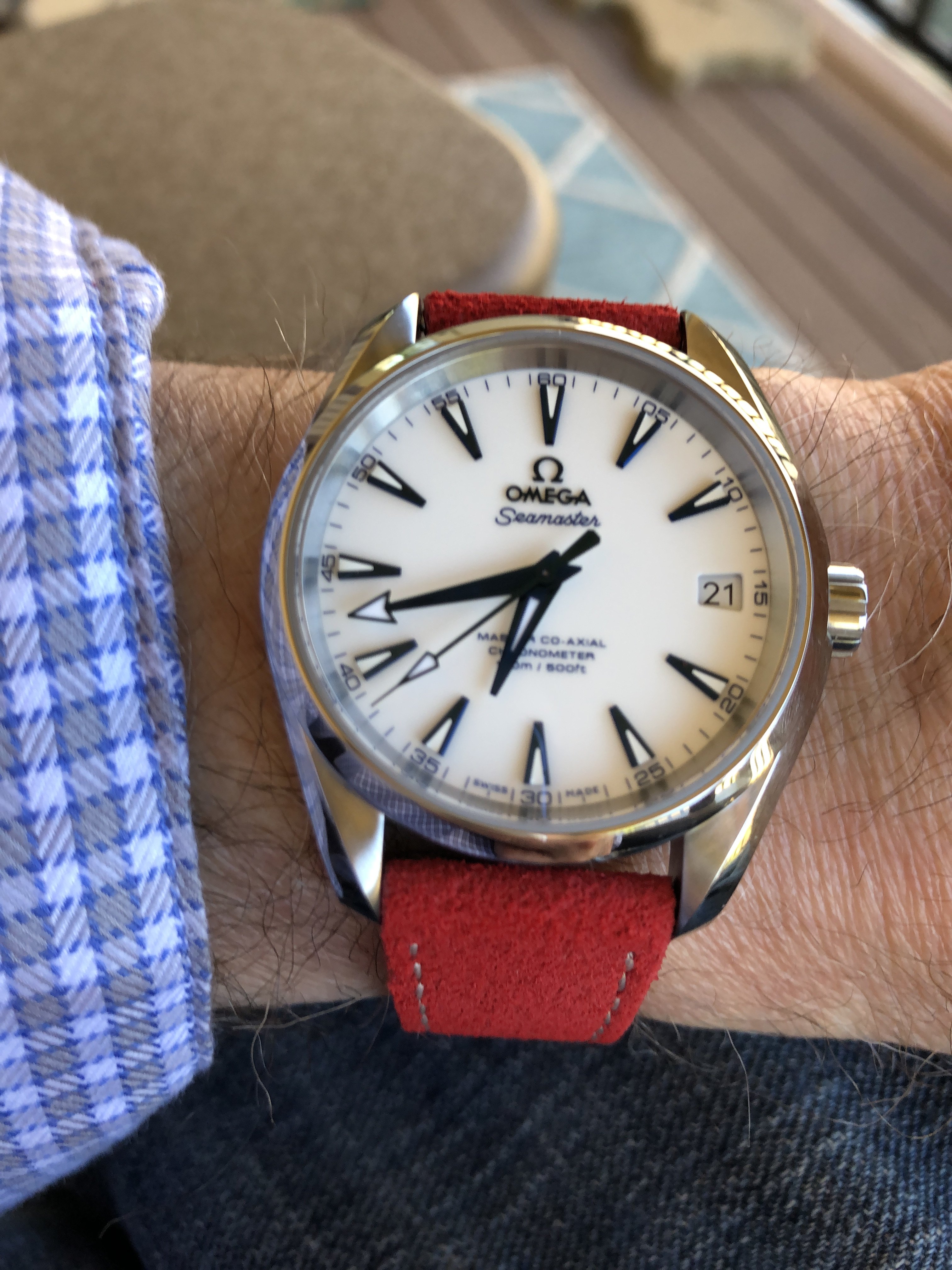 ·Recently I went to my local AD to browse. With the intention of purchasing either a 1861 or 1863 moonwatch with the big box. Both were in stock. I ended up leaving with something completely different. I tried on the moonwatch. Maybe my expectations were raised due to the near mythical status of the Speedy pro. But as much as I love the look of it in photos. On wrist it just felt ok. I looked over the vintage seamaster 300 and 41mm Aqua Terras. Then I saw a watch I'd never seen in person. In the case was an unsold 2016 titanium 38.5mm Aqua Terra Goodplanet Edition. And it was discounted for clearance at 35% off. After trying it on, I knew I was buying it. It wore so comfortably. The dial and hands look amazing in the light. So this became my first AD purchased watch. A speedy is still most likely a purchase for down the road.