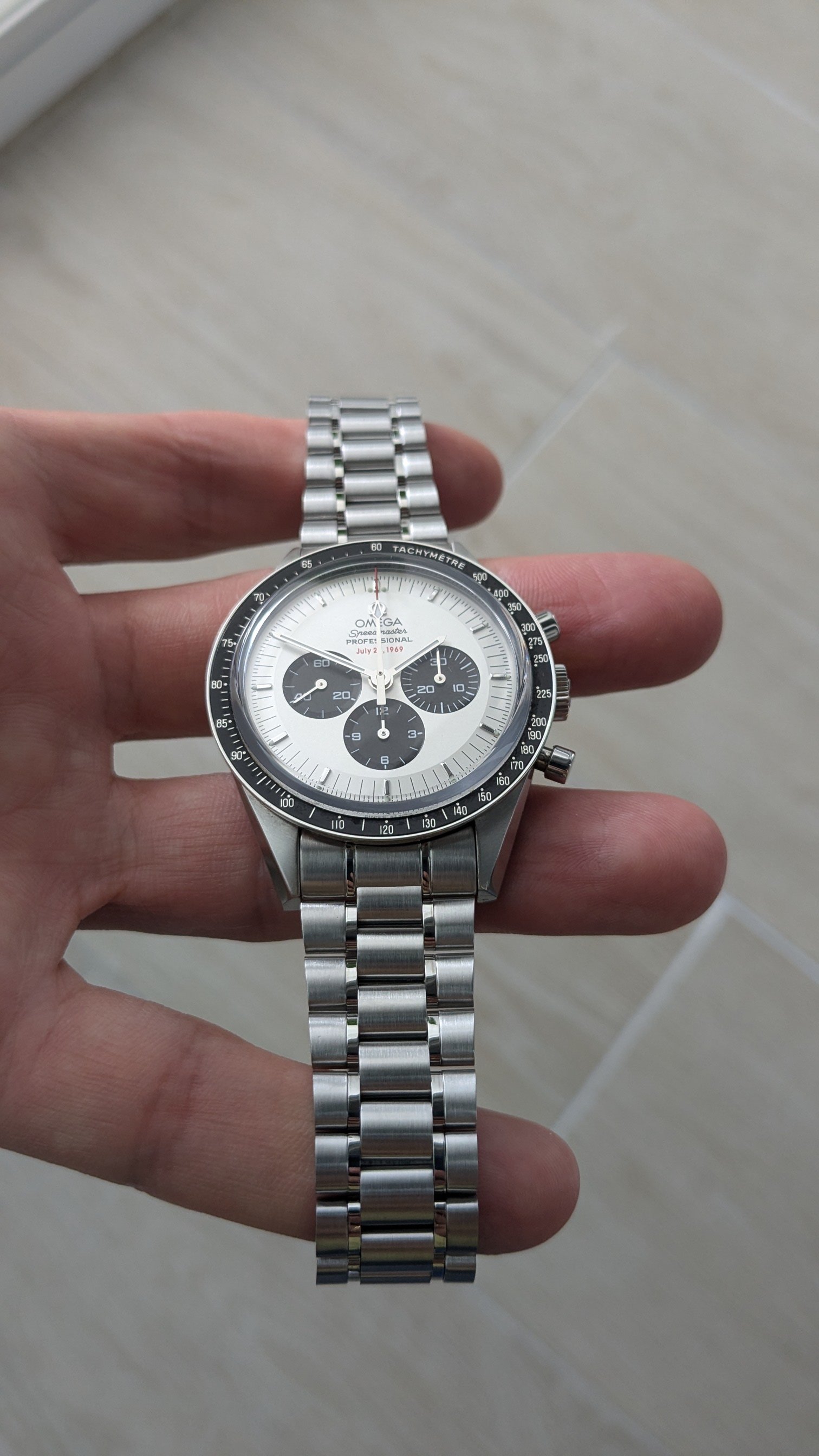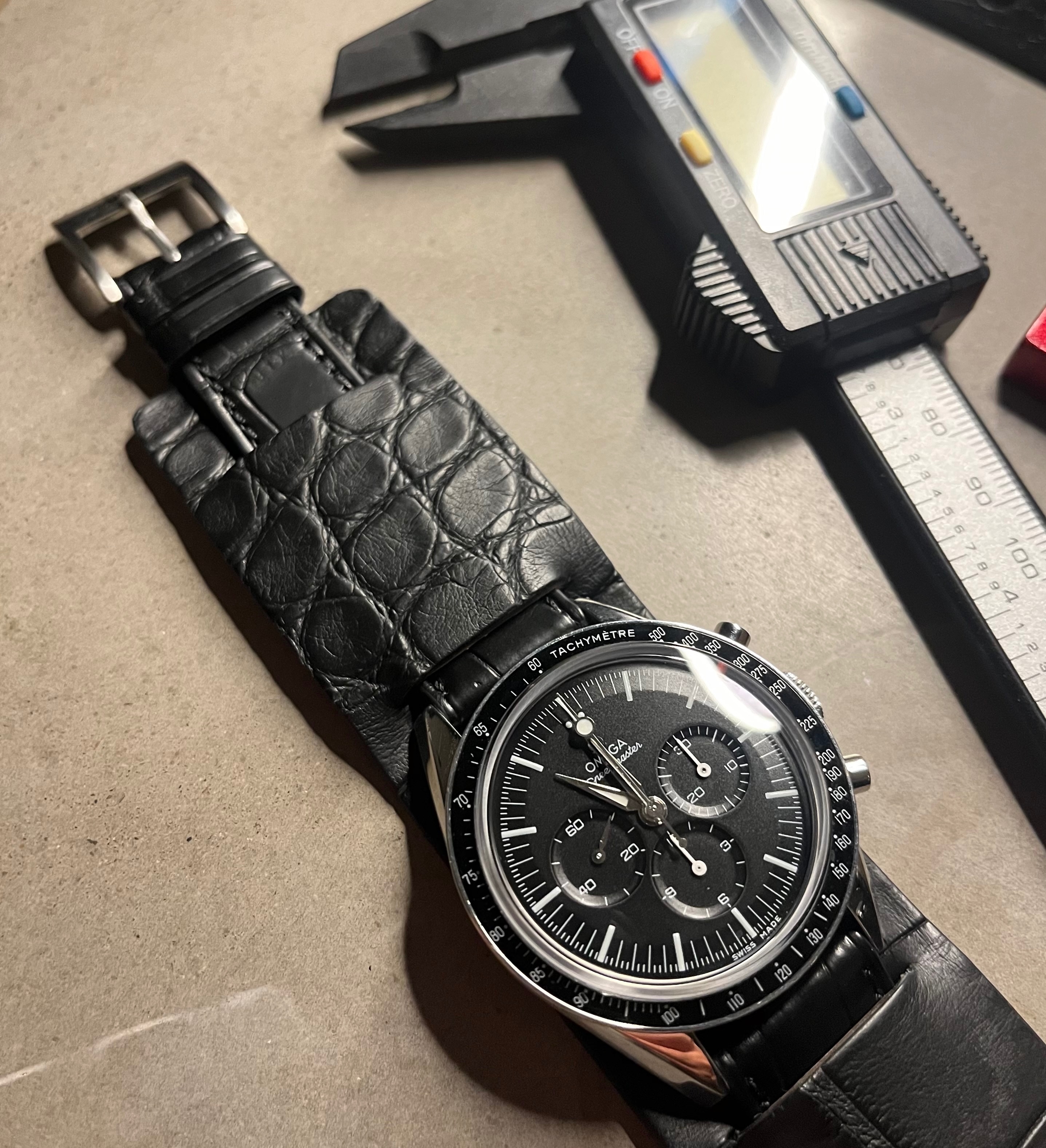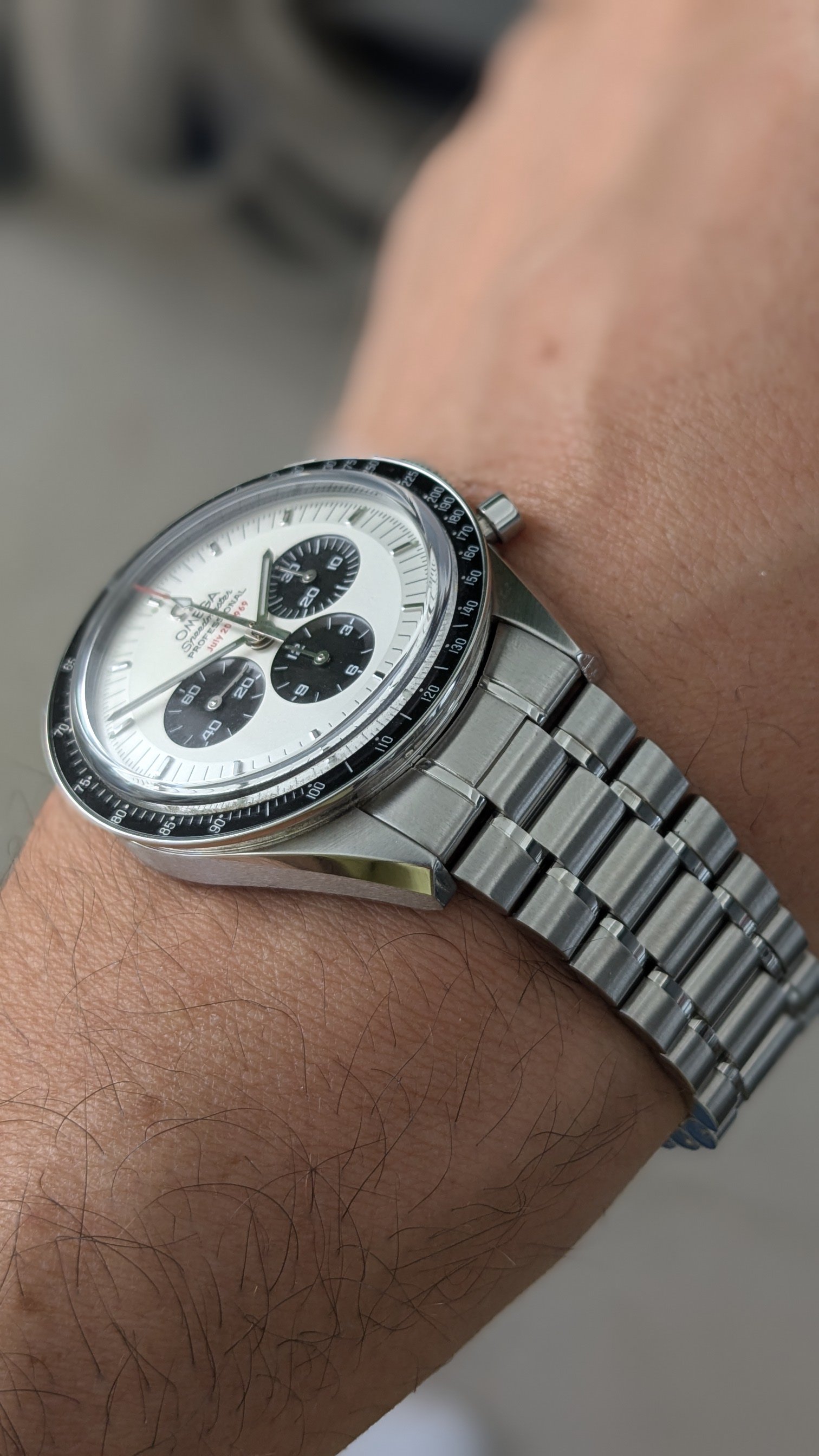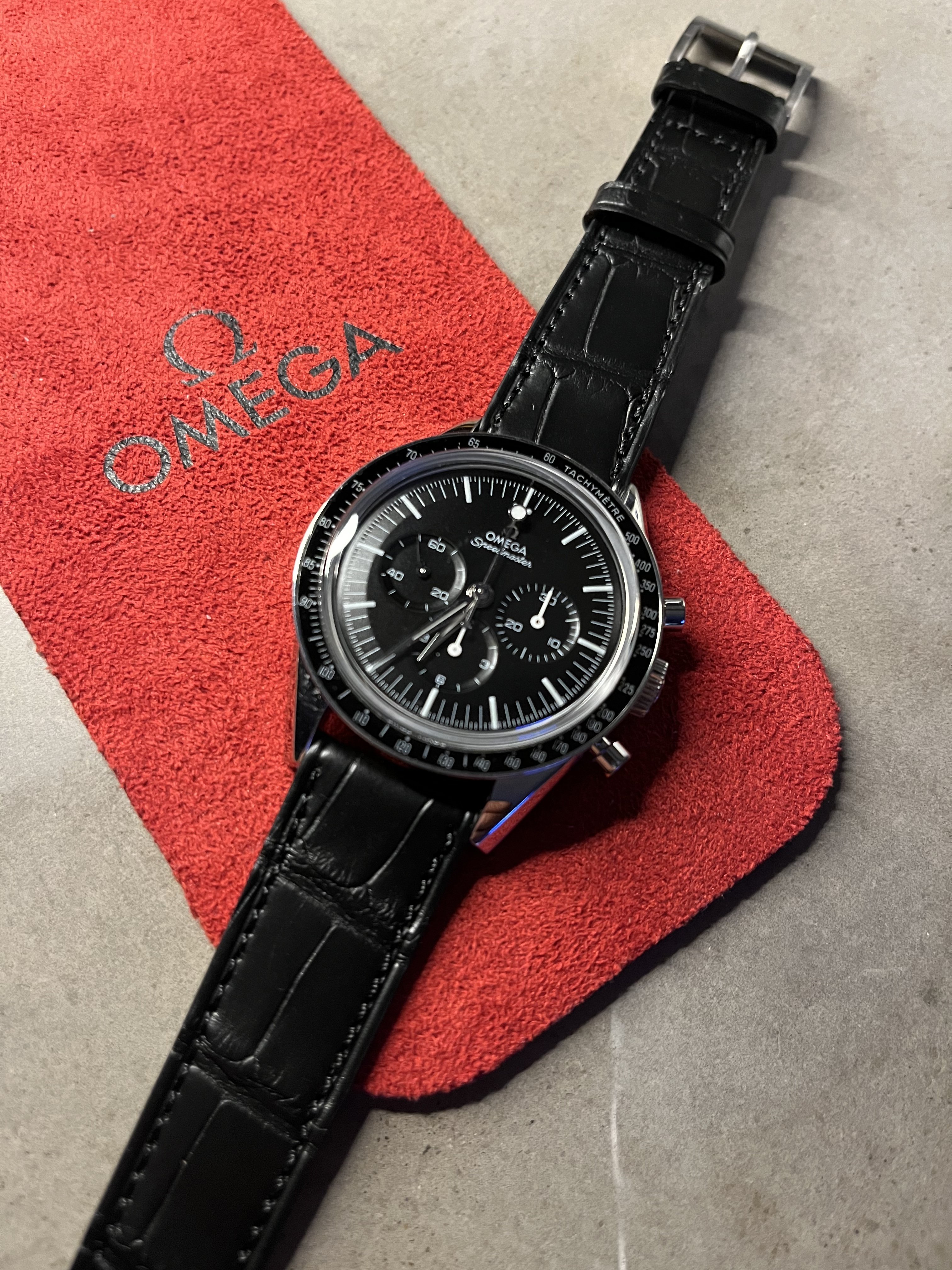 The 57 Omega dial has the correct CK2998 applied logo, correct Speedmaster script, and correct number of sub minute markers. I also like the vintage look of the matte dark gray dial, especially when juxtaposed against the deep black aluminum bezel. One of my favorites more than I ever expected.