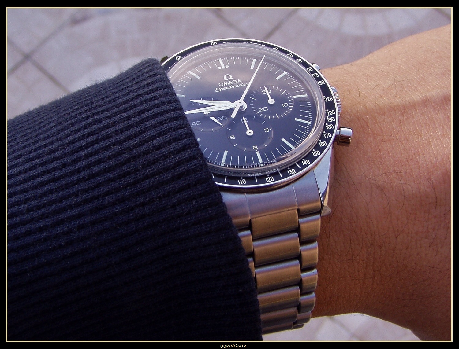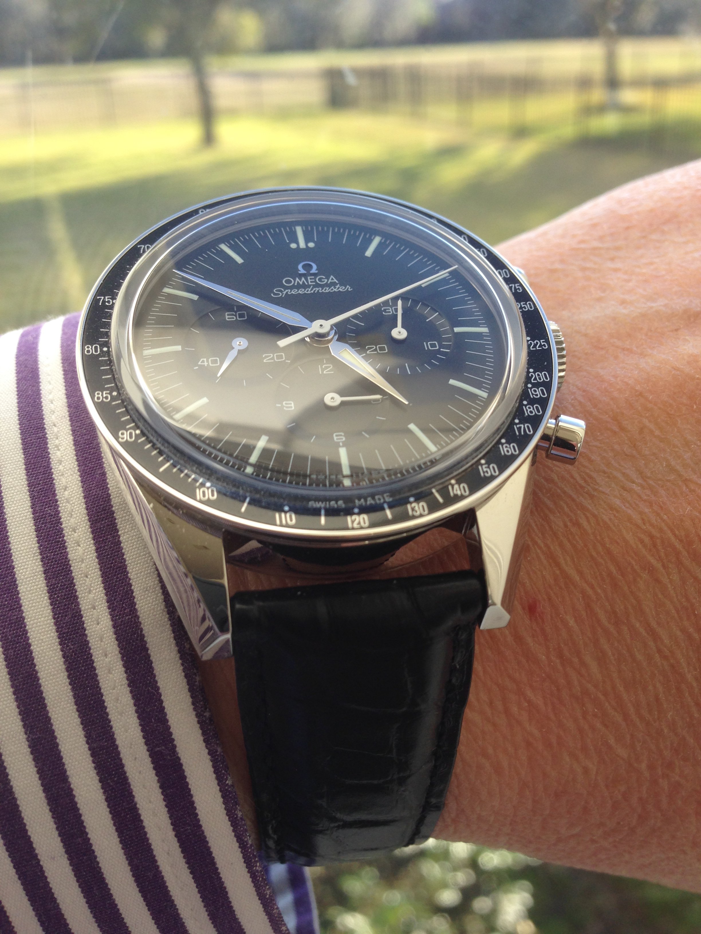 ·Truth is, all Speedmasters really only wear as large as their bezels. The Pro case is 42mm but the bezel is closer to 39-40. There's not much visual difference, size-wise, between a vintage straight-lug and a Pro - and even the modern Dark Sides wear much smaller than their 44mm size. My advice would be to go try it on next to a regular Pro and see which one speaks to you more.