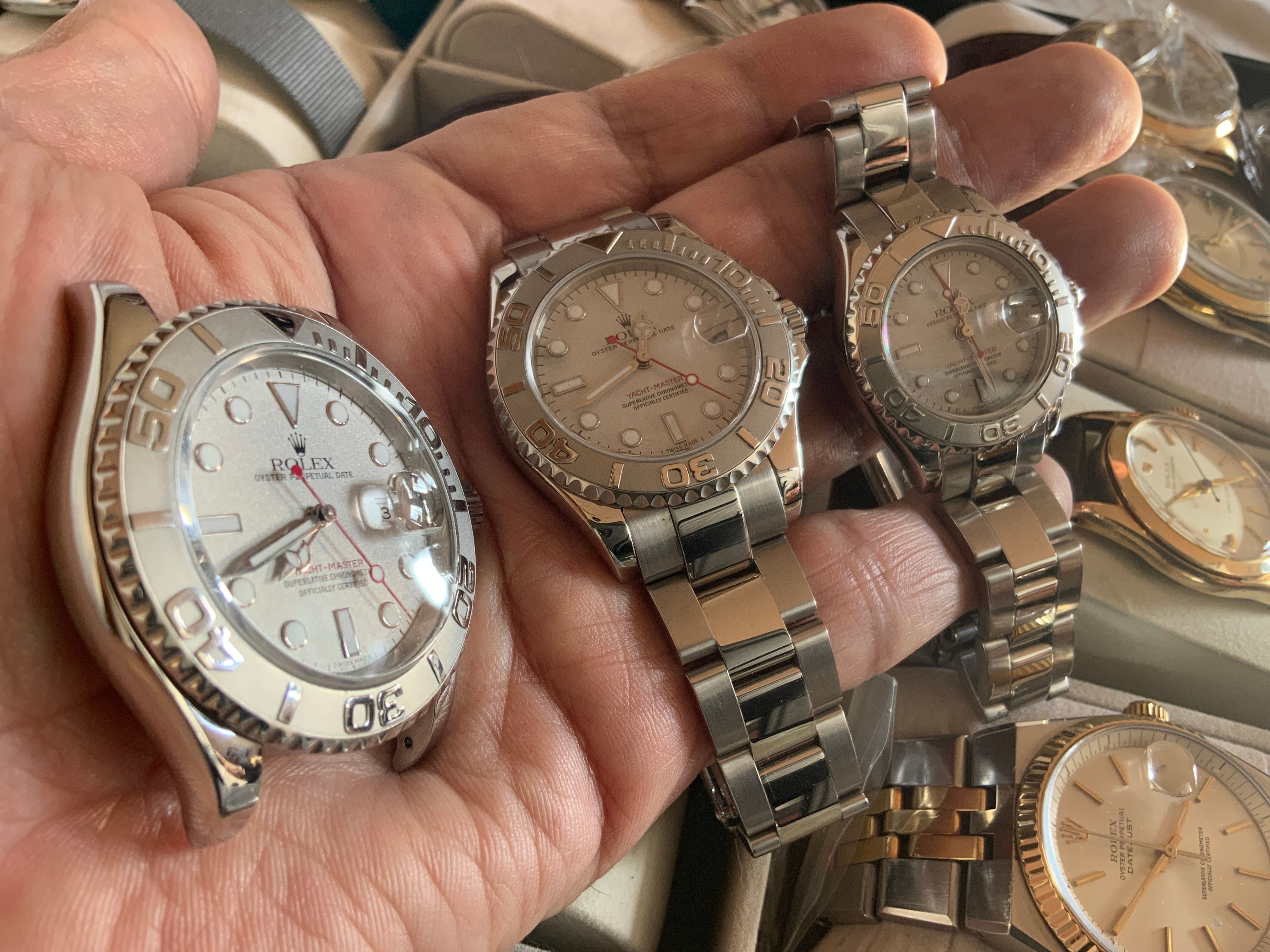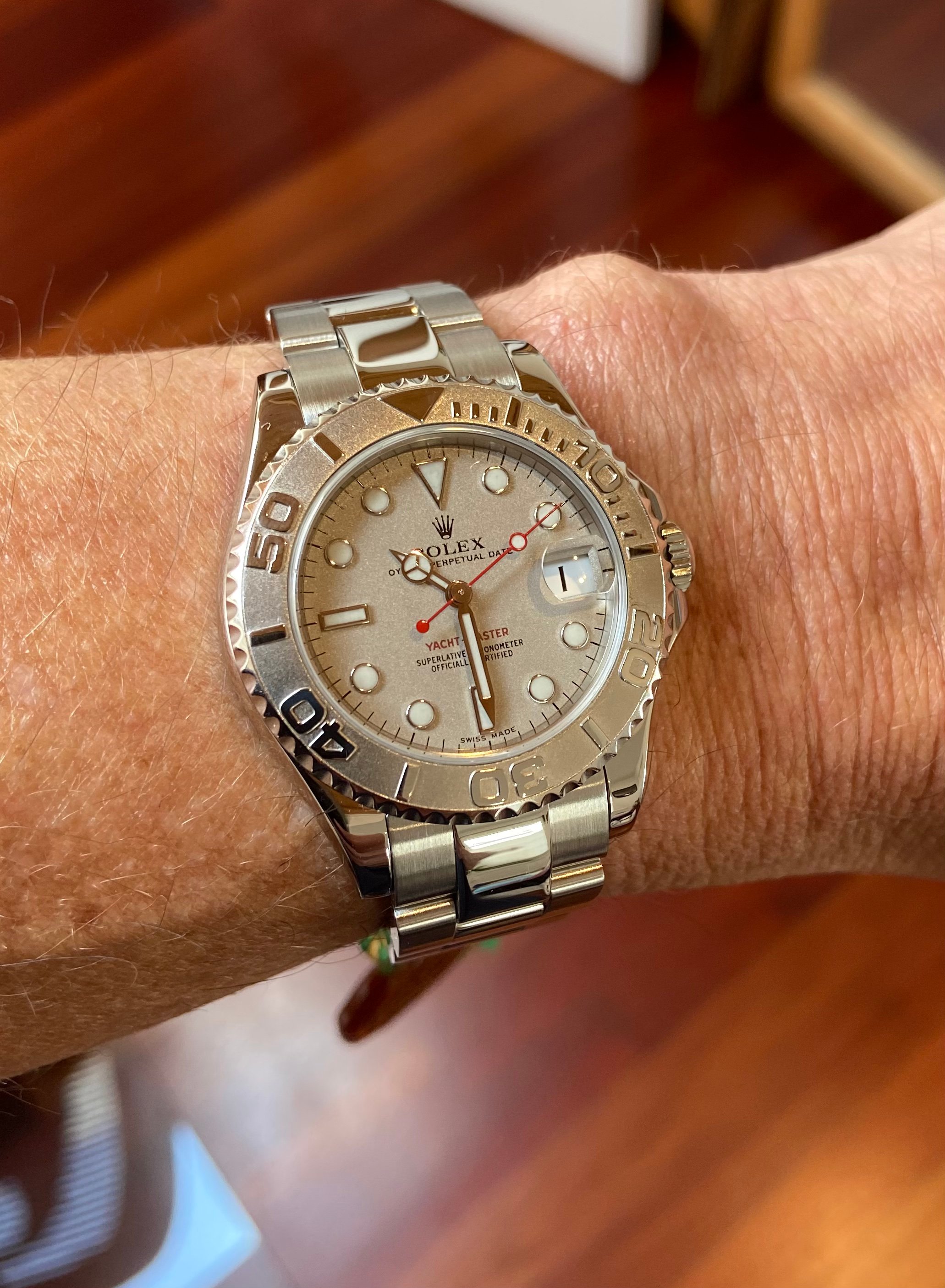 ·I've been an Omega guy since I first changed from collecting pocket watches to wrist watches and have always avoided Rolex for multiple reasons, mostly social. I've tried dragging my wife on my Omega Path but she likes her life-style brands and was always keen on having a Rolex one day. She owns a business with a nautical name, and she is a classy-sporty woman, so I decided a 35mm Yacht-Master was going to be the right watch. After a lot of careful research and shopping I settled on this one which I just received and will give her next month.