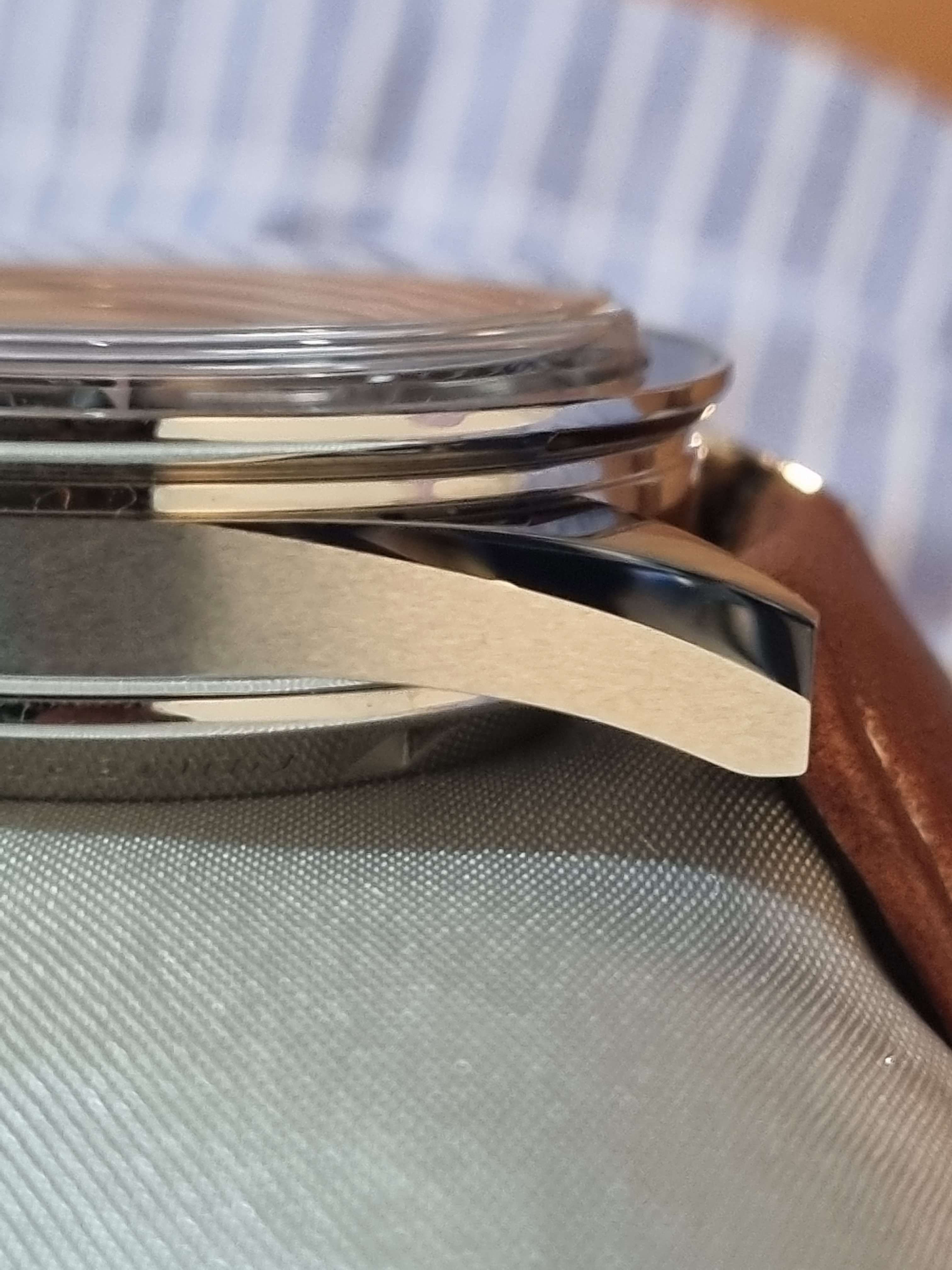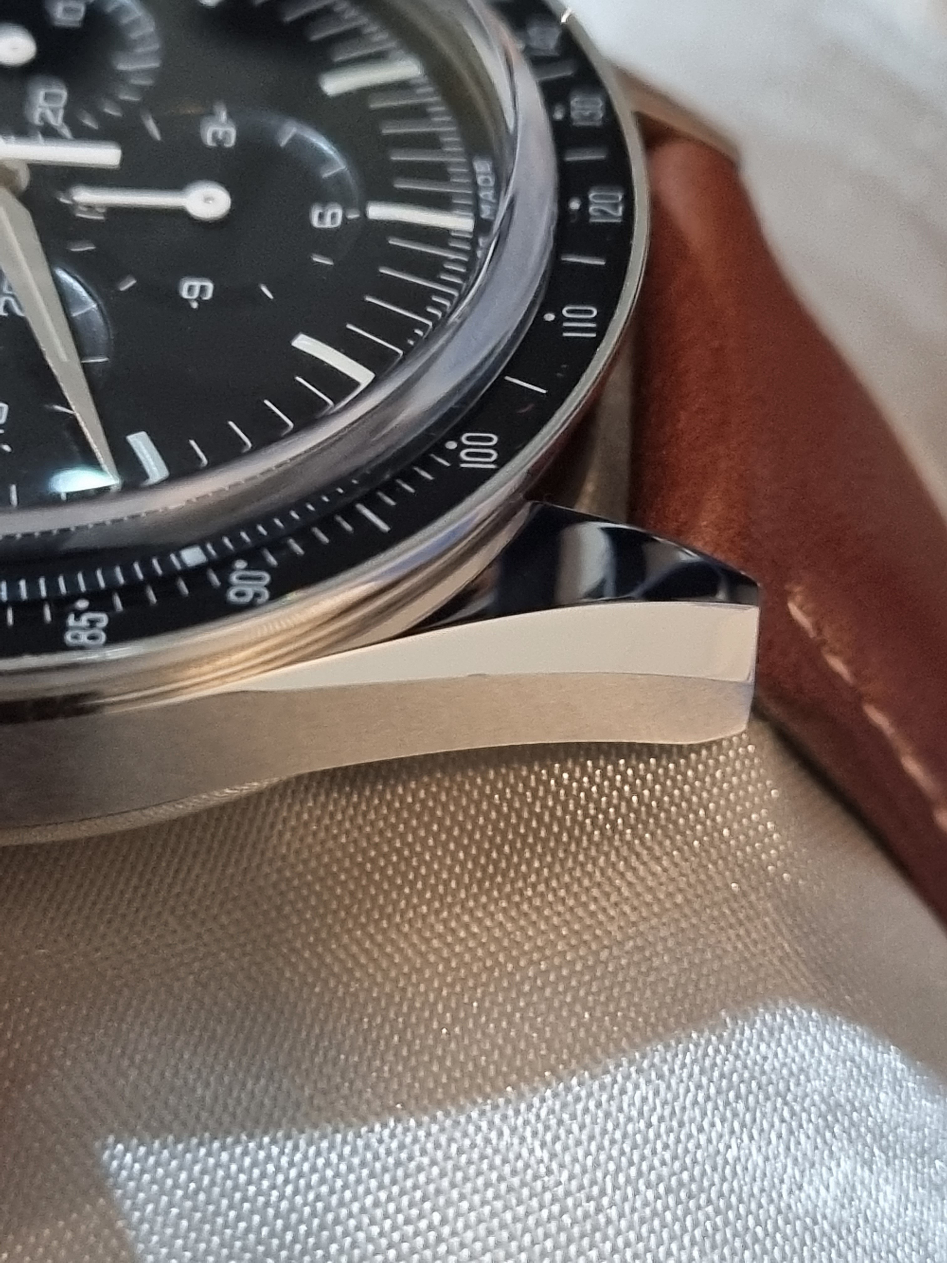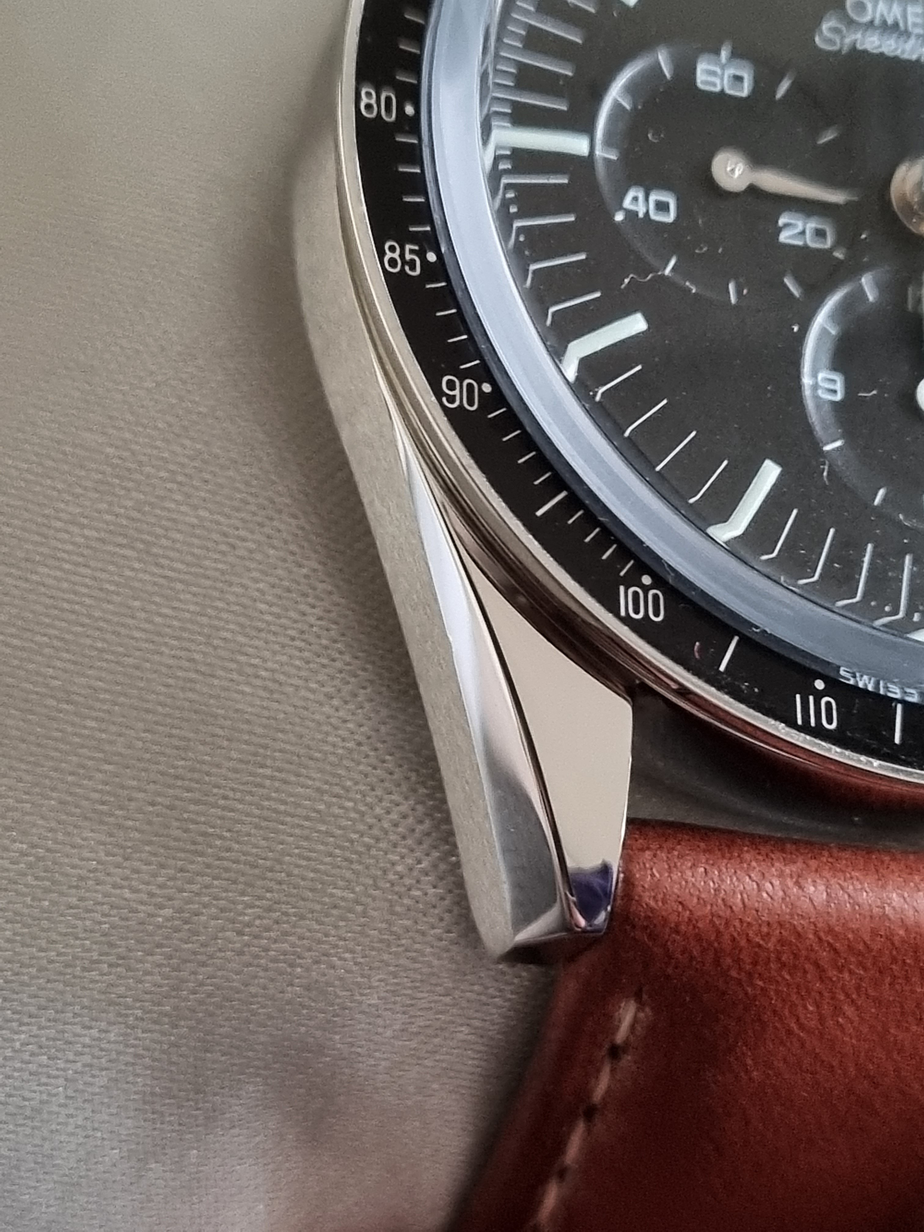 On a scratch/ding like this, it’s difficult because you are right on the line between a polished and a brushed surface. It takes some skill to do this and I am again advising you not to attempt it on a brand new Speedmaster. Chances are you will make it worse and more noticeable. It is very minor in the grand scheme of things. Nobody is going to notice it but you. Just live with it.