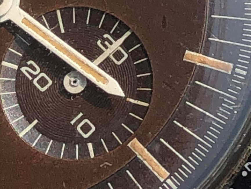 My own observations about the chocolate dials (like this one) are that the lume on such dials is often damaged, if not totally fallen off or washed. It's VERY rare to observe a chocolate dial with intact lume. Nevertheless, I have already observed this sort of "toothpaste" lume. Either it was applied that way (and usually covers quite well the white line), or it dried up, lume partially fell off and the remainder looks like above.