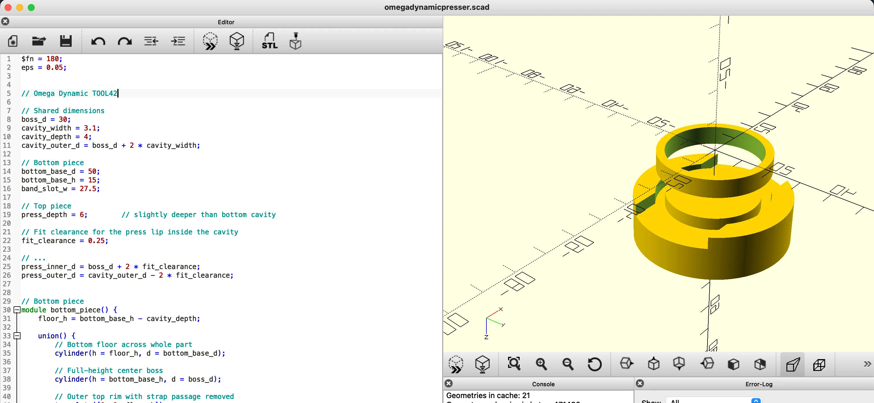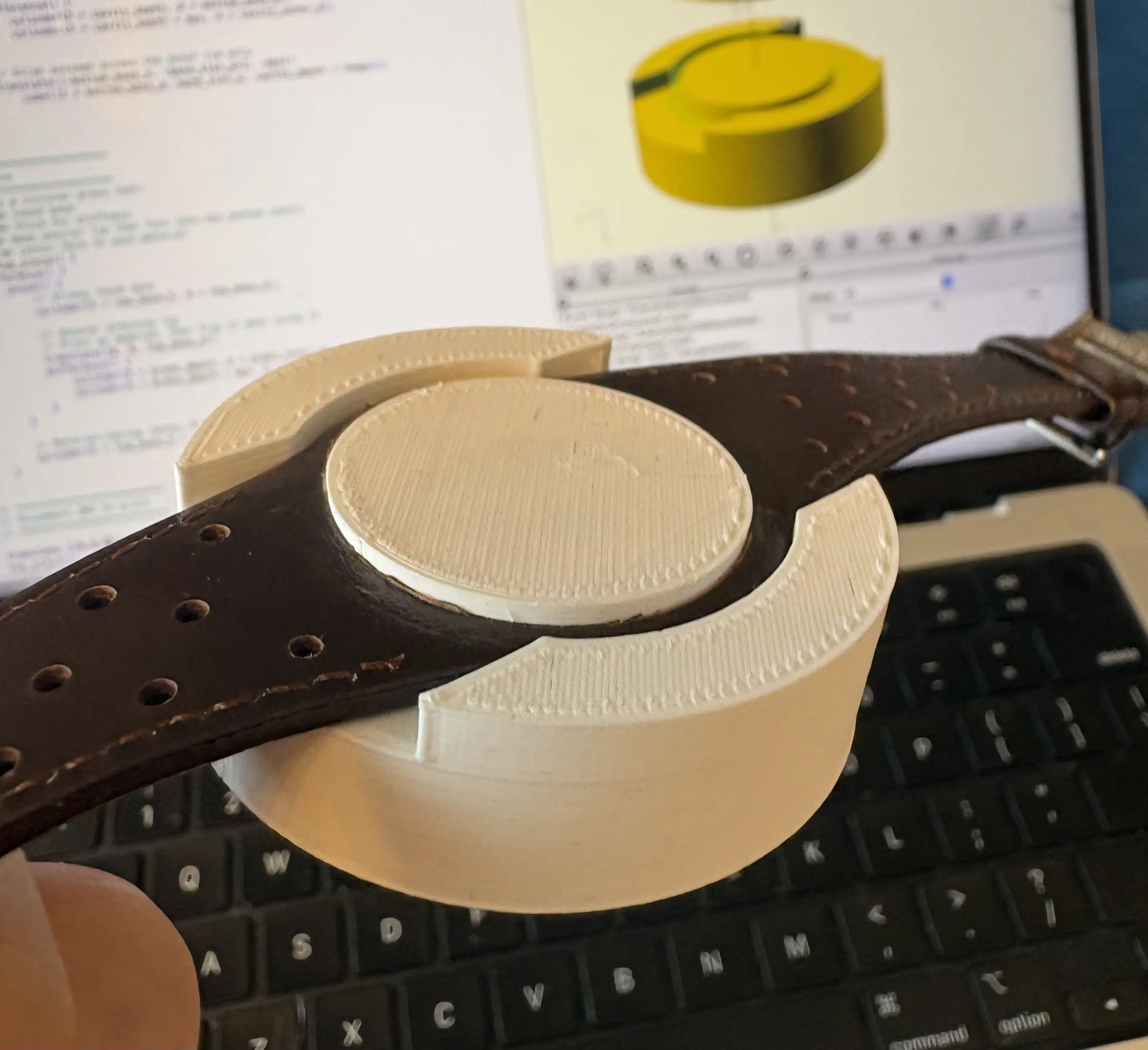 I purchased from EBay an aftermarket leather band for a Geneve Dynamic. Alas, it was too thick and I didn't have a courage (or wisdom?) to try and force the ring to close so that it would have been anywhere near flush with the caseback. As a solution I 3d printed a small tool that allows compressing the leather band as to make it fit better and allow the ring to be tightened without excessive force. Please see below OpenSCAD source code if you want to play with this.