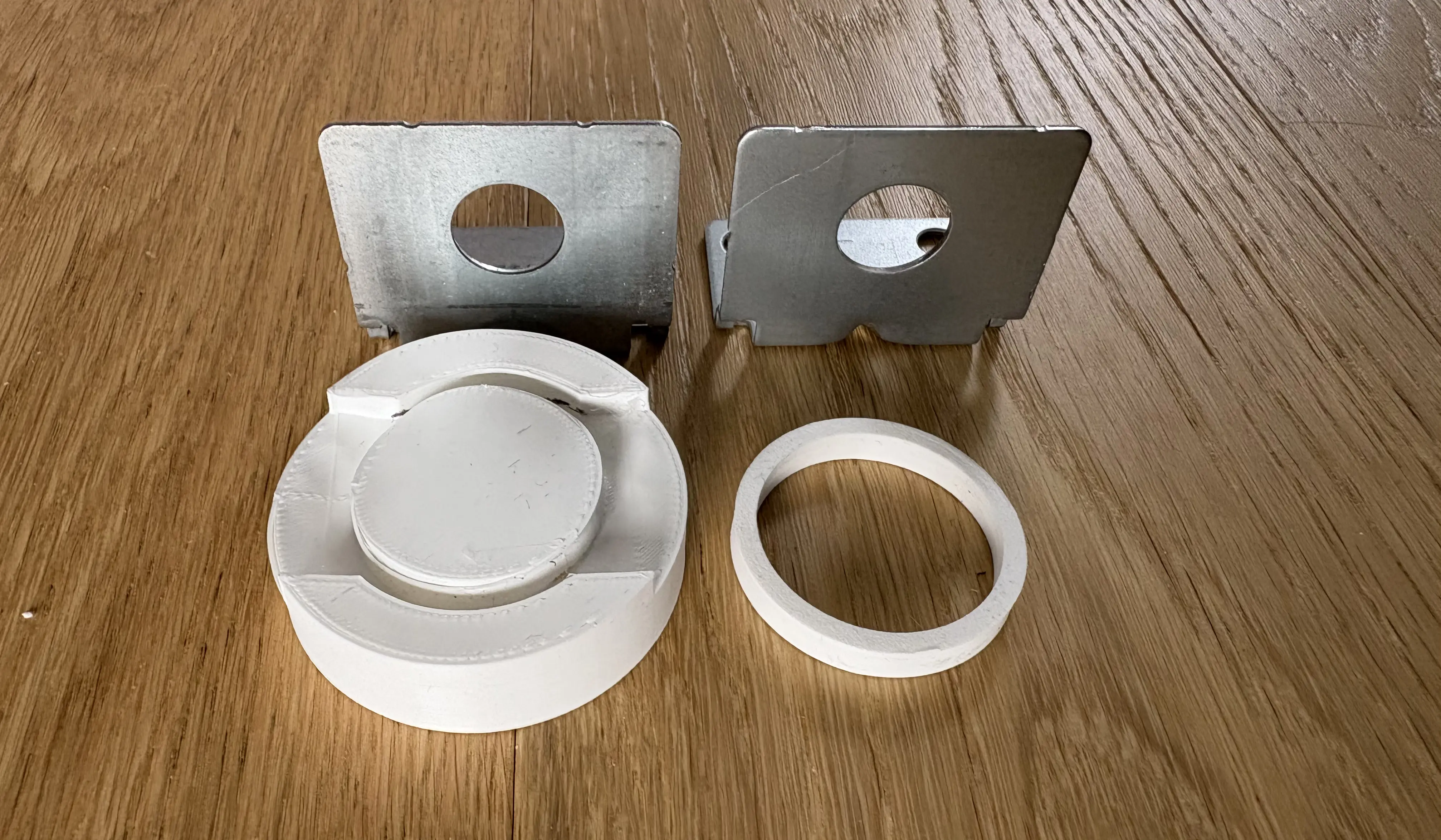 This is how the parts look with and without the band in them (note that in the photo with the clamp the top is my first attempt and is now replaced with ring only; its stronger that way). Metal brackets are from IKEA shelf and were used to apply pressure from the clamp more evenly.