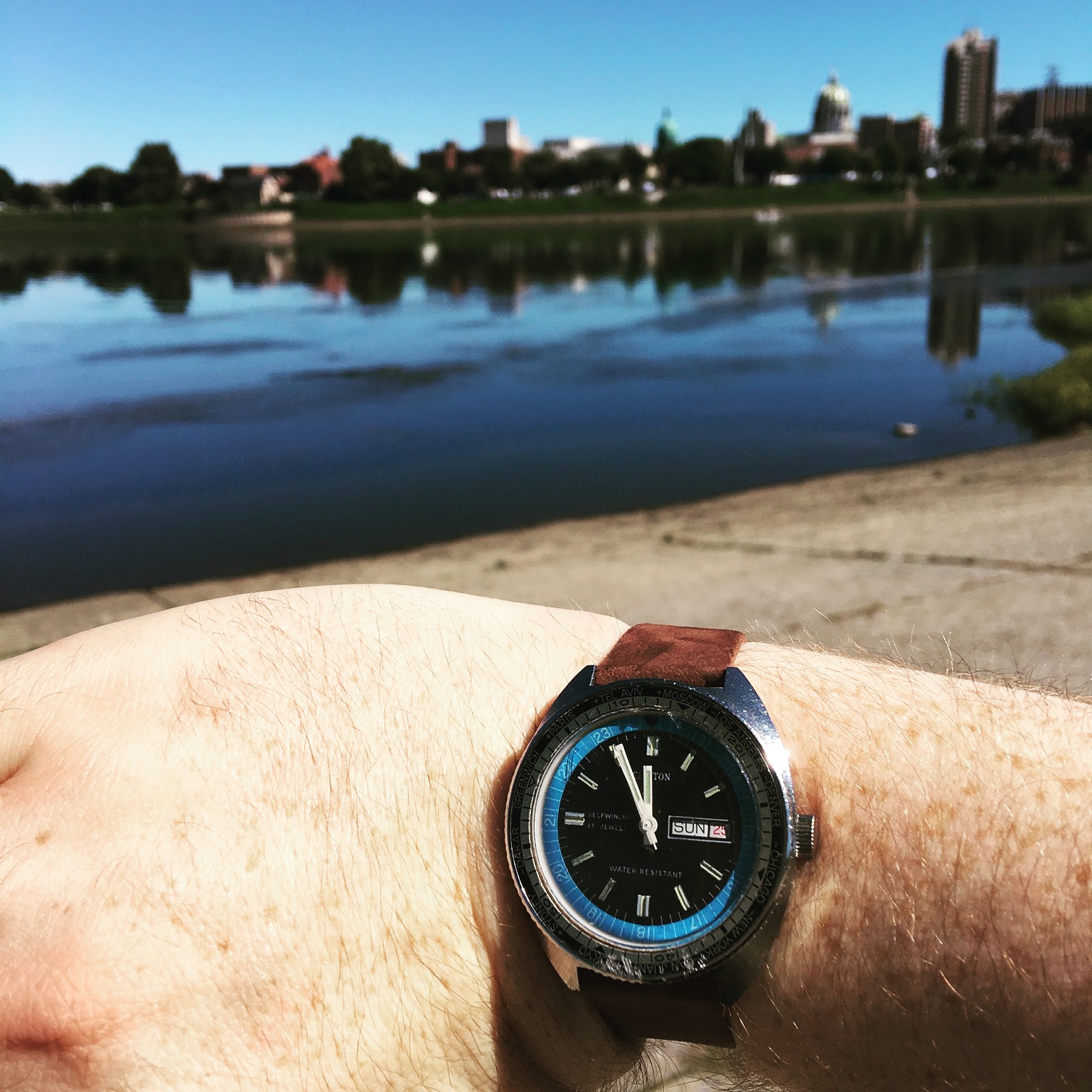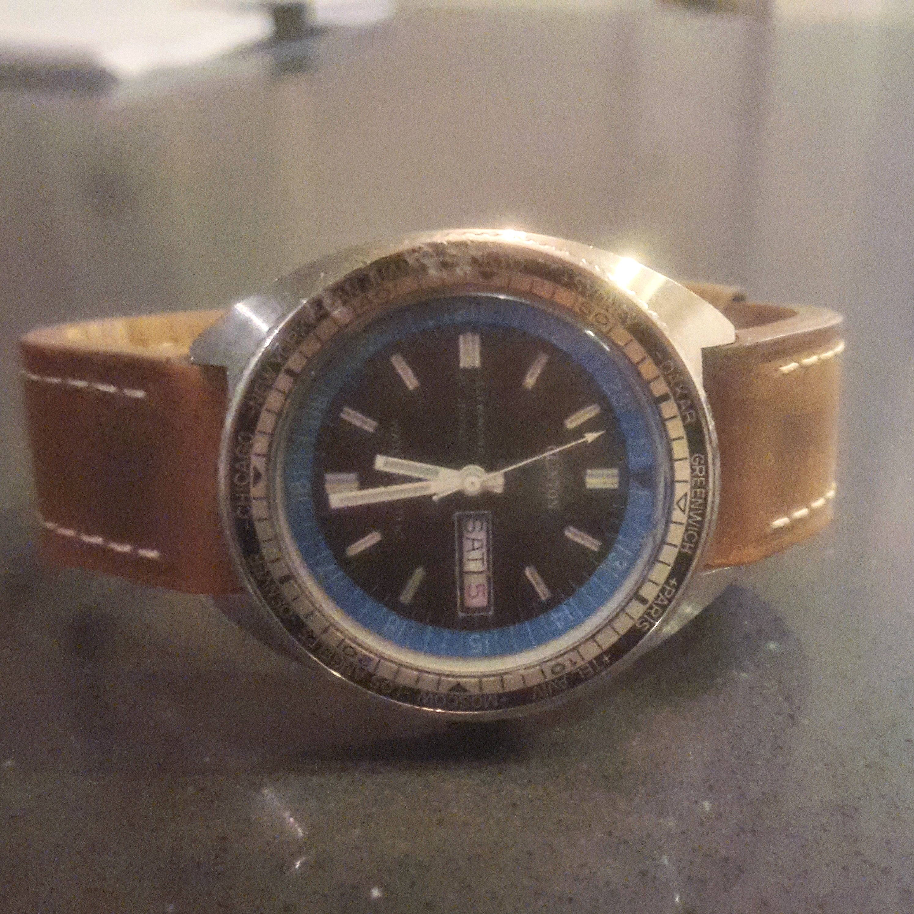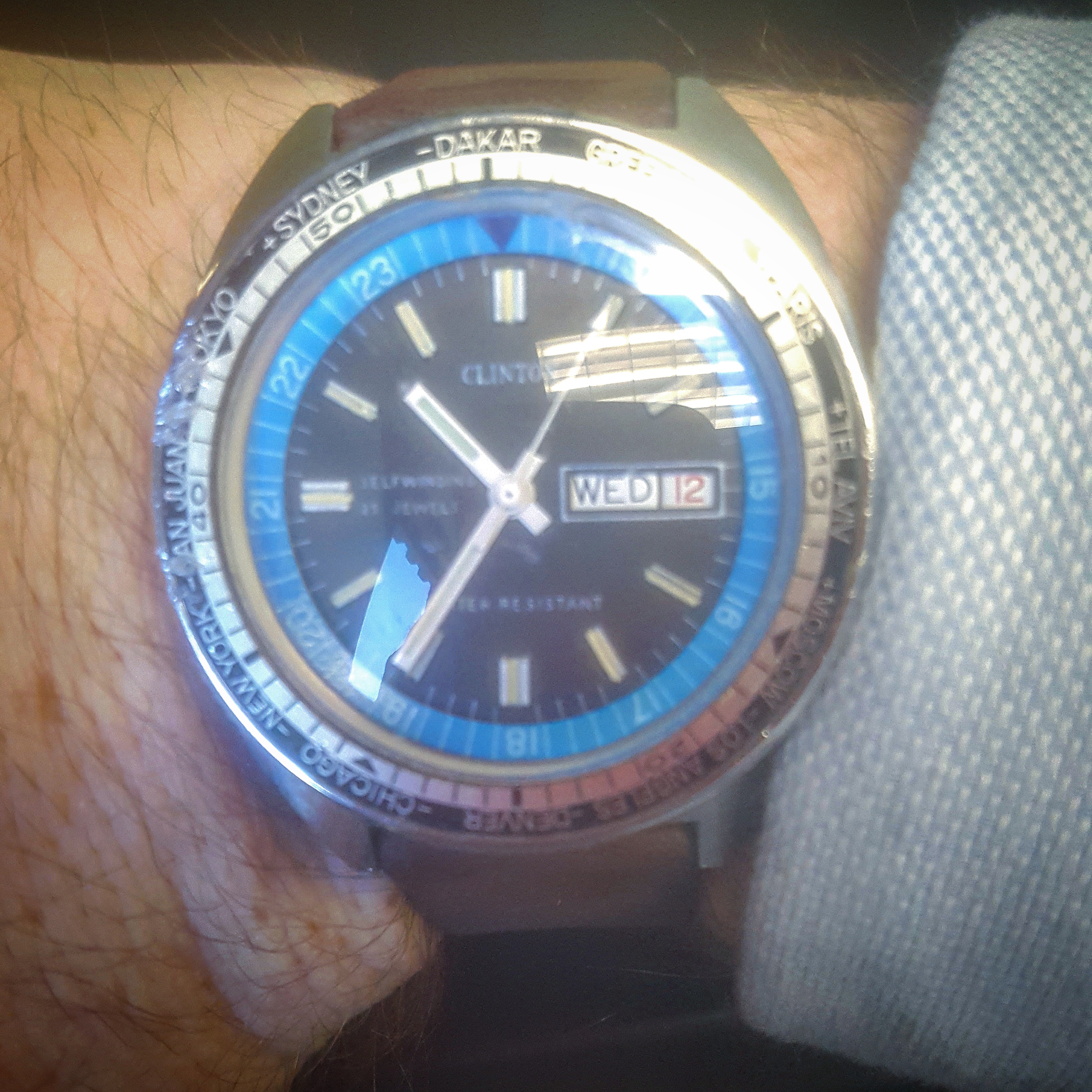 I have the Clinton World Timer Diver watch, which has proven to be phenomenal buy at about 30 bucks. It has a retro cushion solid stainless steel case with a 25J movement. My wife and I recently took her grandfather's watch to a local watchmaker, and I happened to be wearing the Clinton watch that day. I showed it to the watchmaker and he informed me that they have all tend to have Swiss movements. The watchmaker was employed as an Omega technician at one time and stated that a watchmaker friend of his cased Clinton watches years and years ago in NYC. I think its a true "sleeper brand" with some pretty sweet finds. This is the first time that I have seen the Skydiver. The red and white calendar watch is also something special.