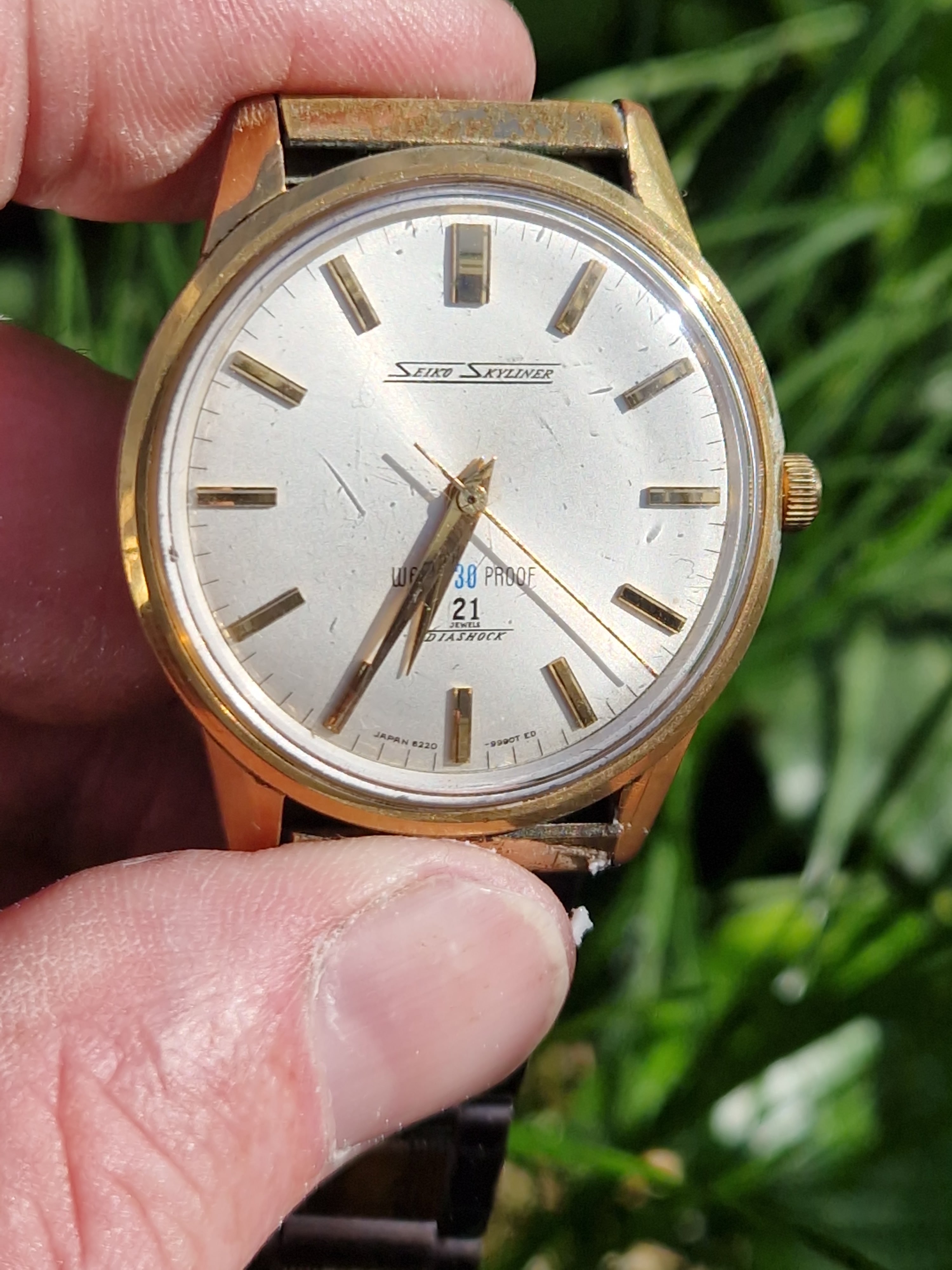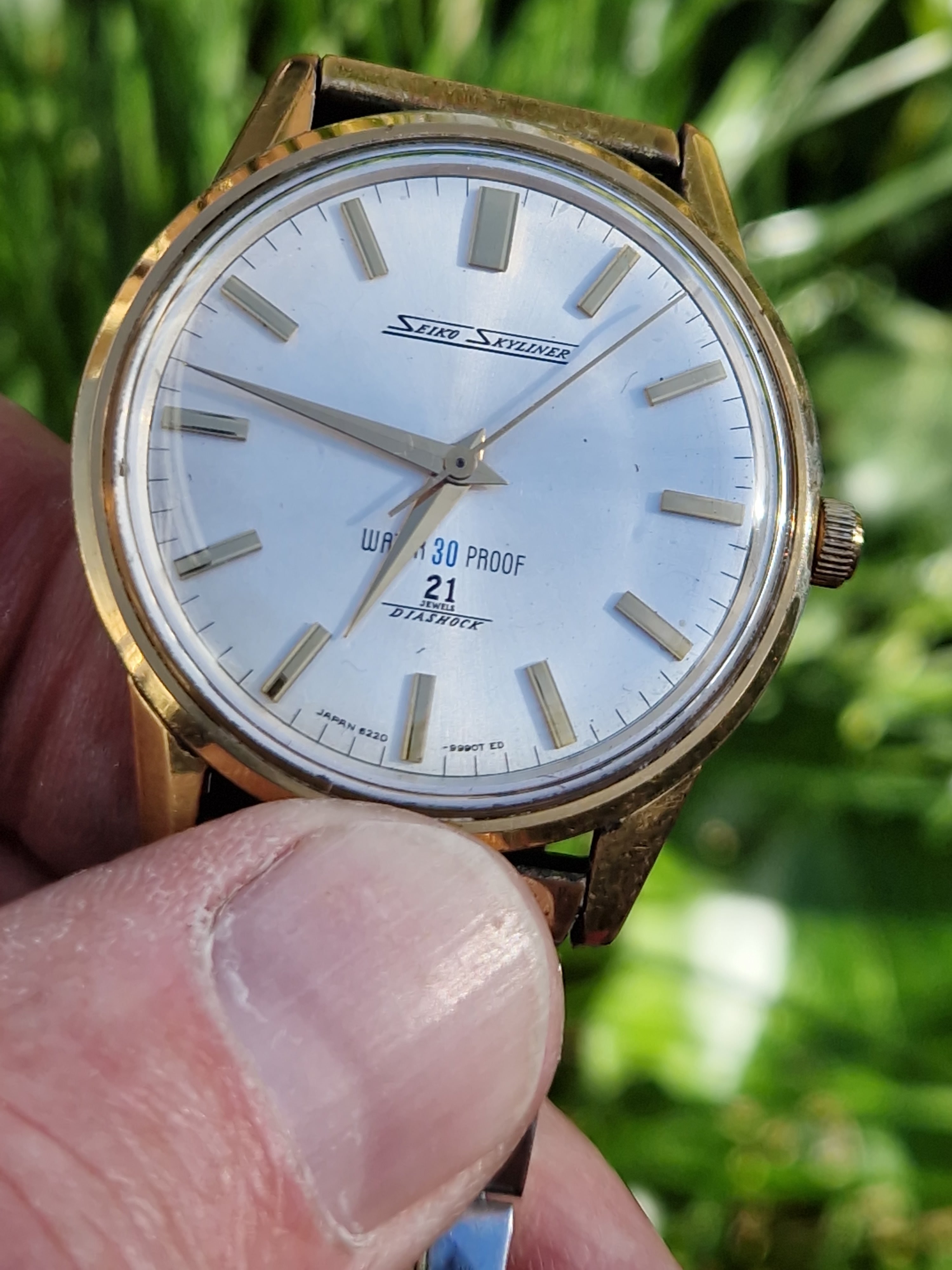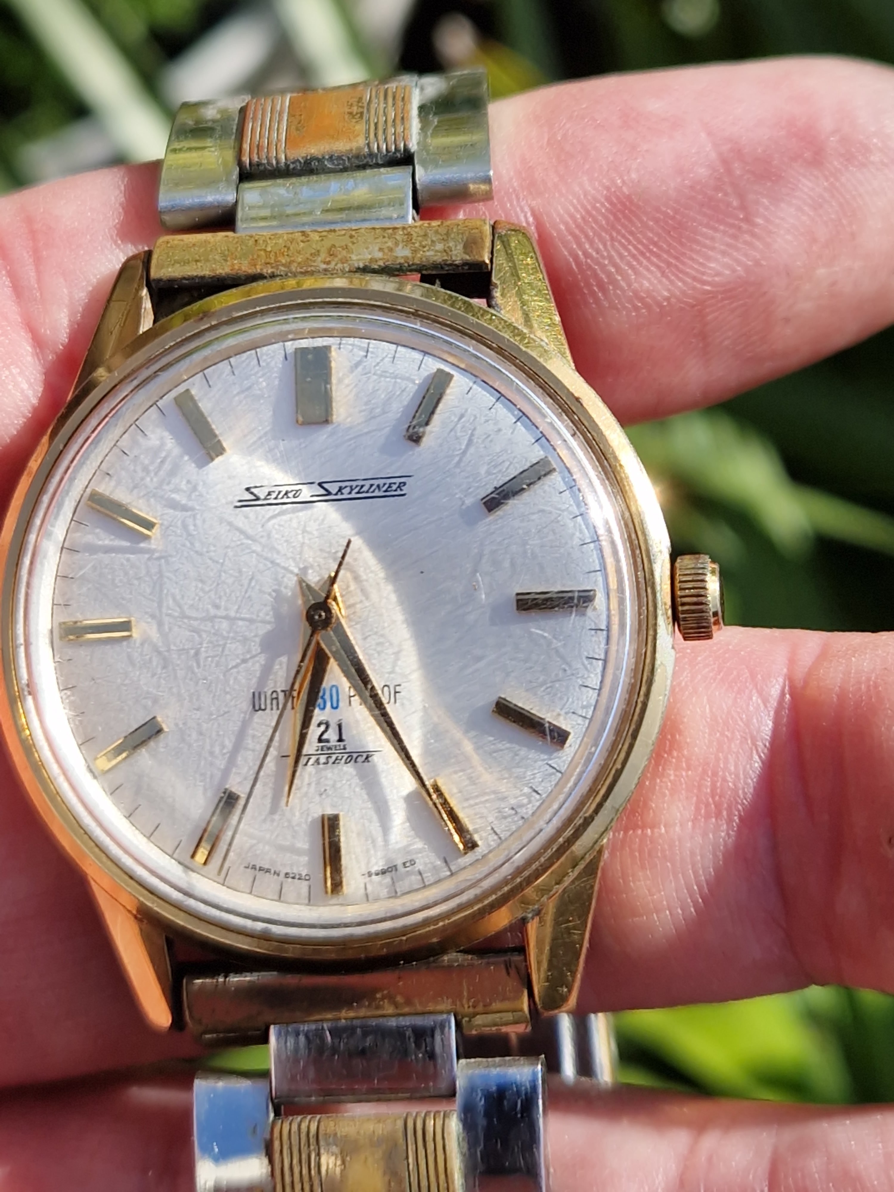 ·I bought this Skyliner in a sad condition, The bracelet was aftermarket and a mess the case was very dirty and I thought scratched en the crystal looked like it needed to be replaced..... But as you can see if you look at the hands, it took not long to make it look like a real watch. I never use watch products to polish a crystal or a case so maybe that is why it looks so good (I do use "meguiars" that is a car product) On the last picture the Skyliner sits on an Horween strap looking like a million bucks.