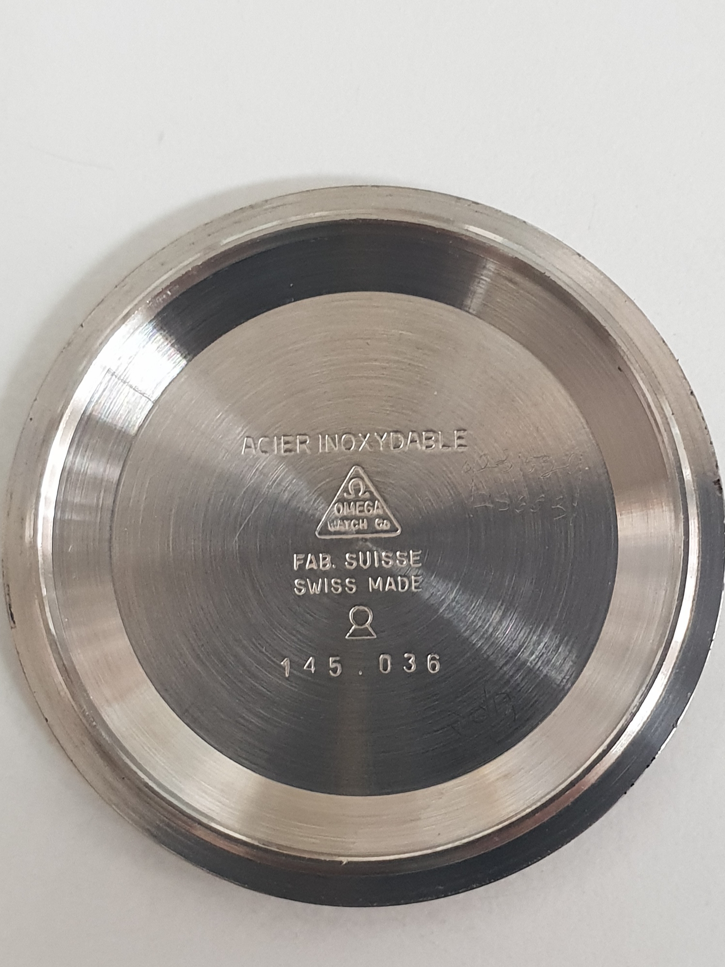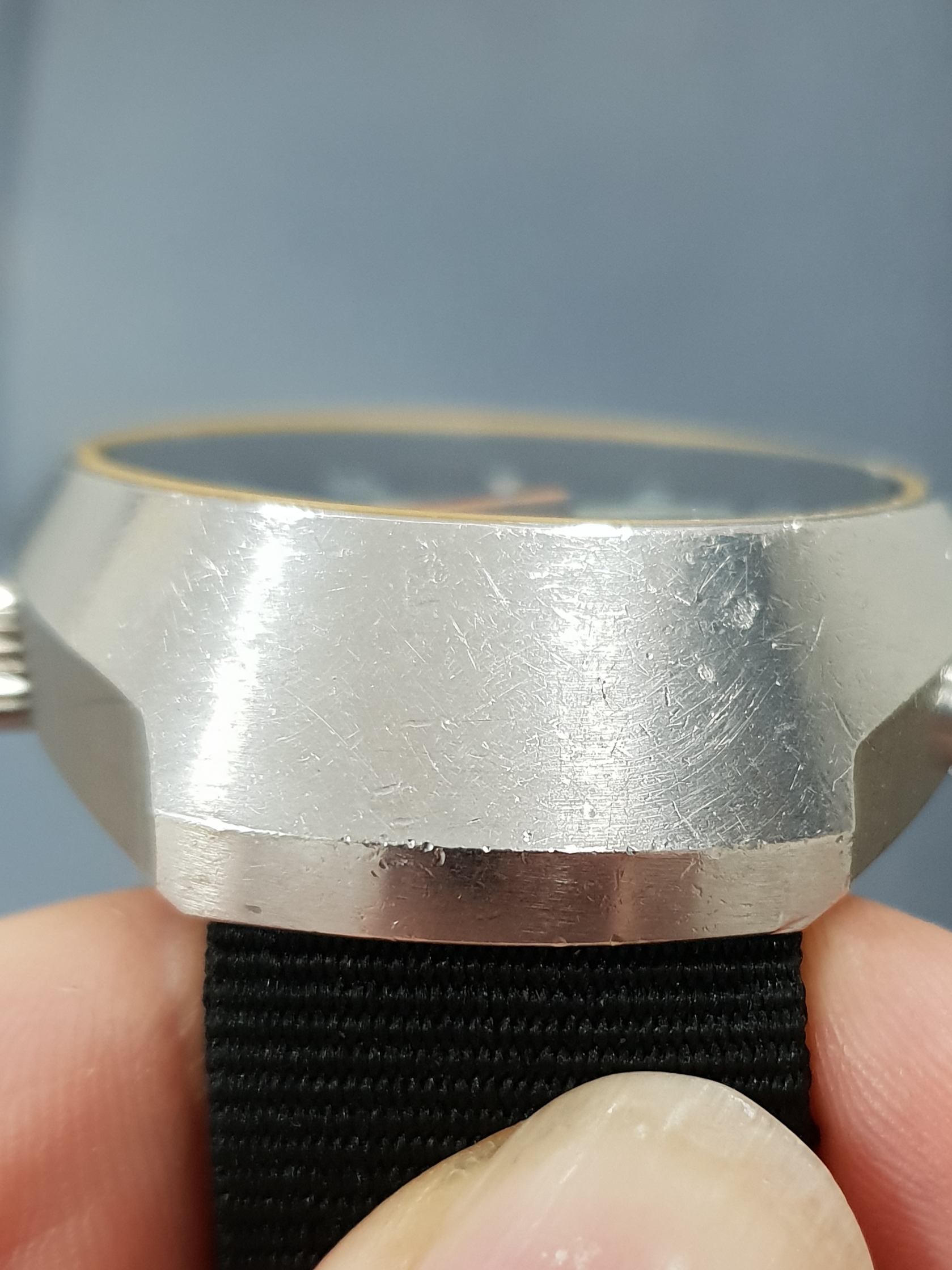 Case back: Sunburst finish to edge is still visible as is the DC-8 outline in the middle. Has been engraved with 25.12.1978 and has some case opening marks.