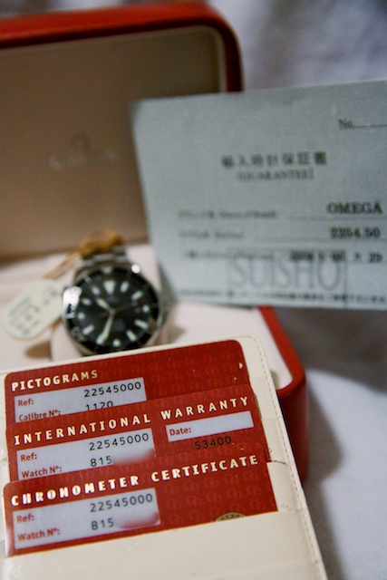 The watch comes with box AND papers! Don't know the service history, but it's running within COSC. Also, had it pressure tested a few months ago and it is good to go in the water. Have submerged it for fun in the sink, but since here in Chicago it's still been too cold to swim (It's May!) I haven't been able to take it for a real spin.