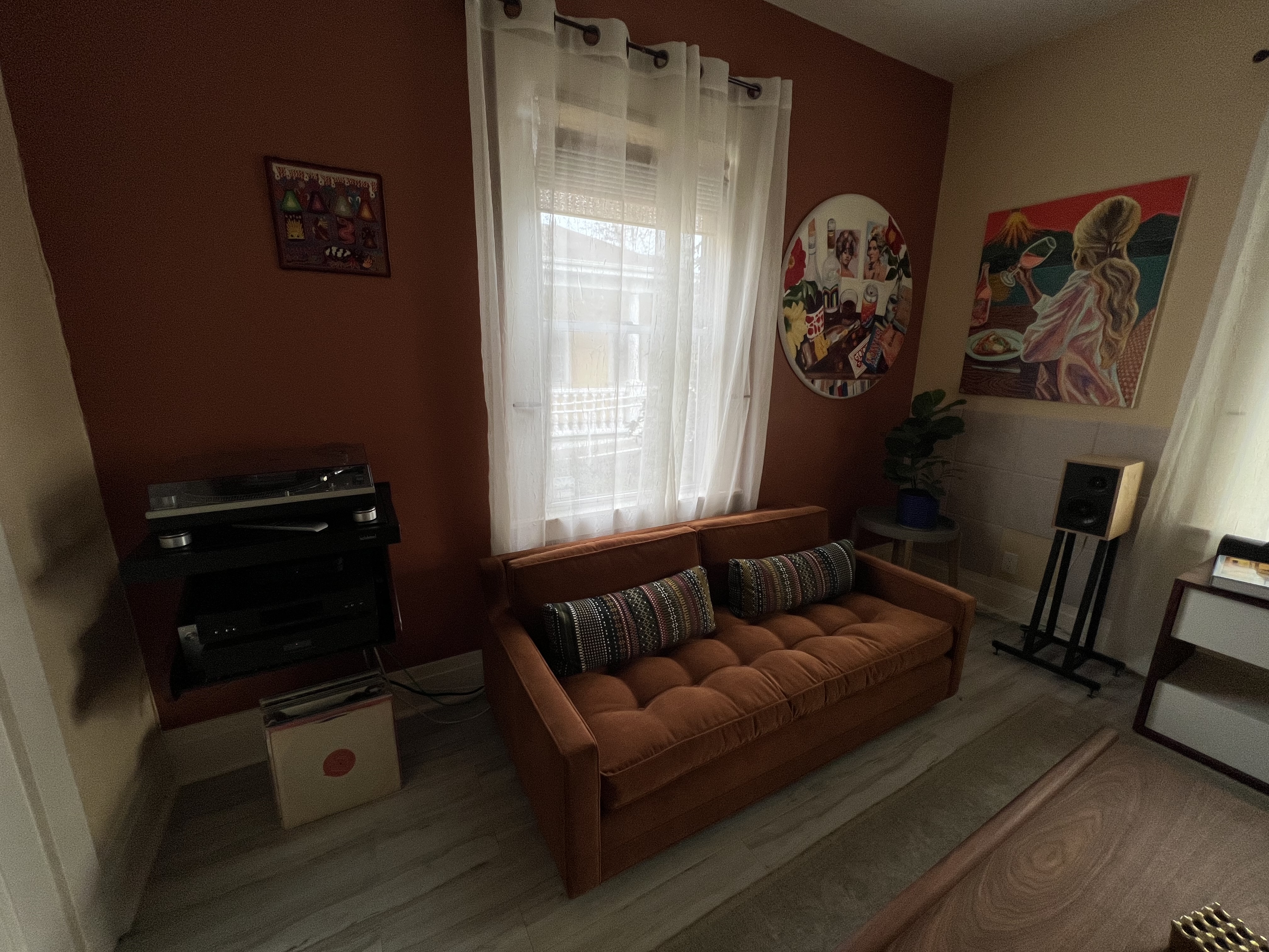Here is my little office lounge system. This room is quite small and yes, it has treatments! There are panels on the ceiling and behind the speakers. This room echoed like crazy when we took over the space. I need hide the cables after I make new speaker cables.