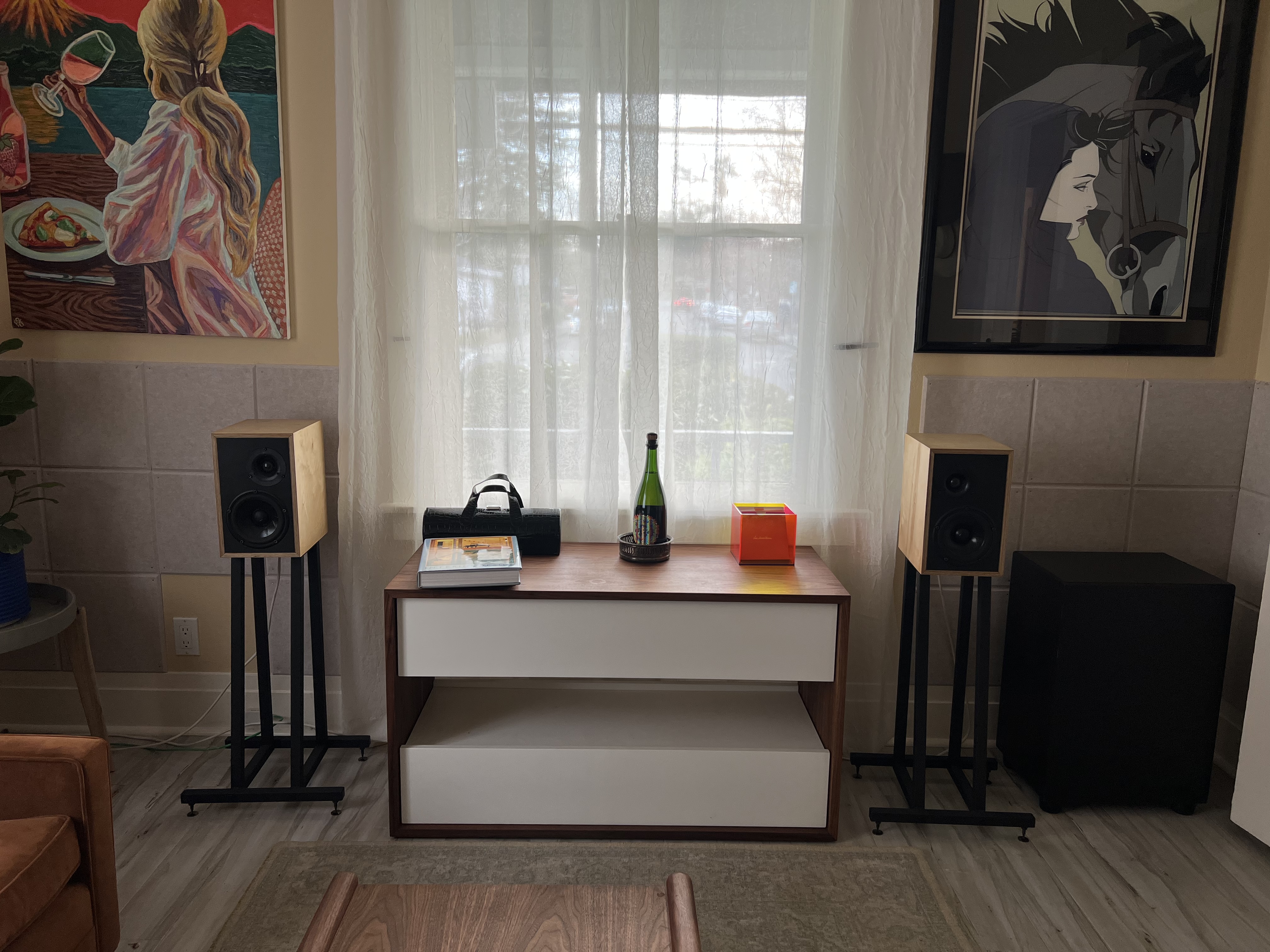 Ergo IX mini monitors on Sound Organisation stands. The rel sub is not hooked up and is just being stored here whilst looking for a new home.