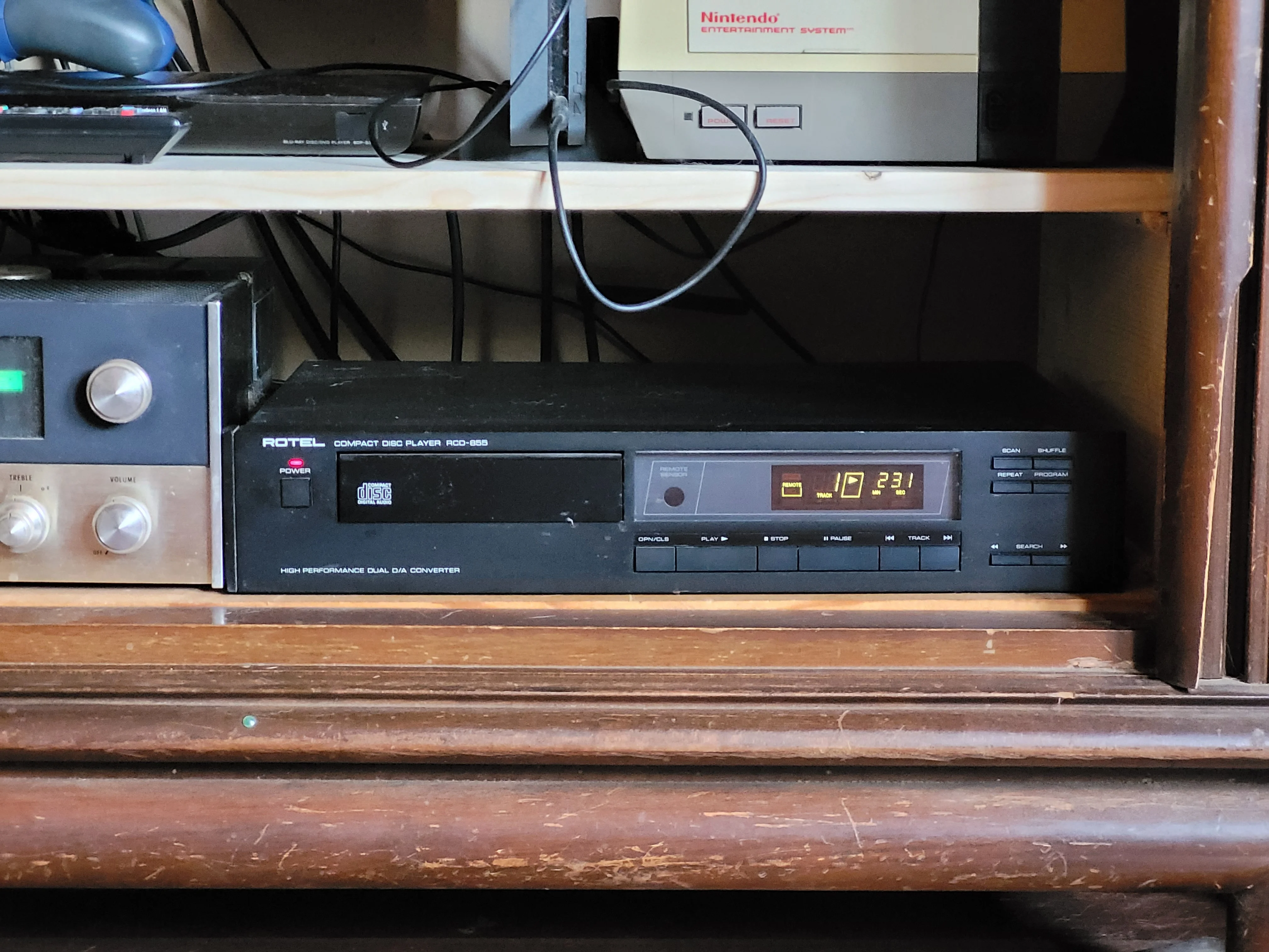 I finally replaced my long dead Sony CDP CX153 CD Changer. My new player is a simple old Rotel RCD 855. It is a very nice sounding player with the old Phillips TDA 1541 chipset, dual 16 bit D/A converters, and four times oversampling.