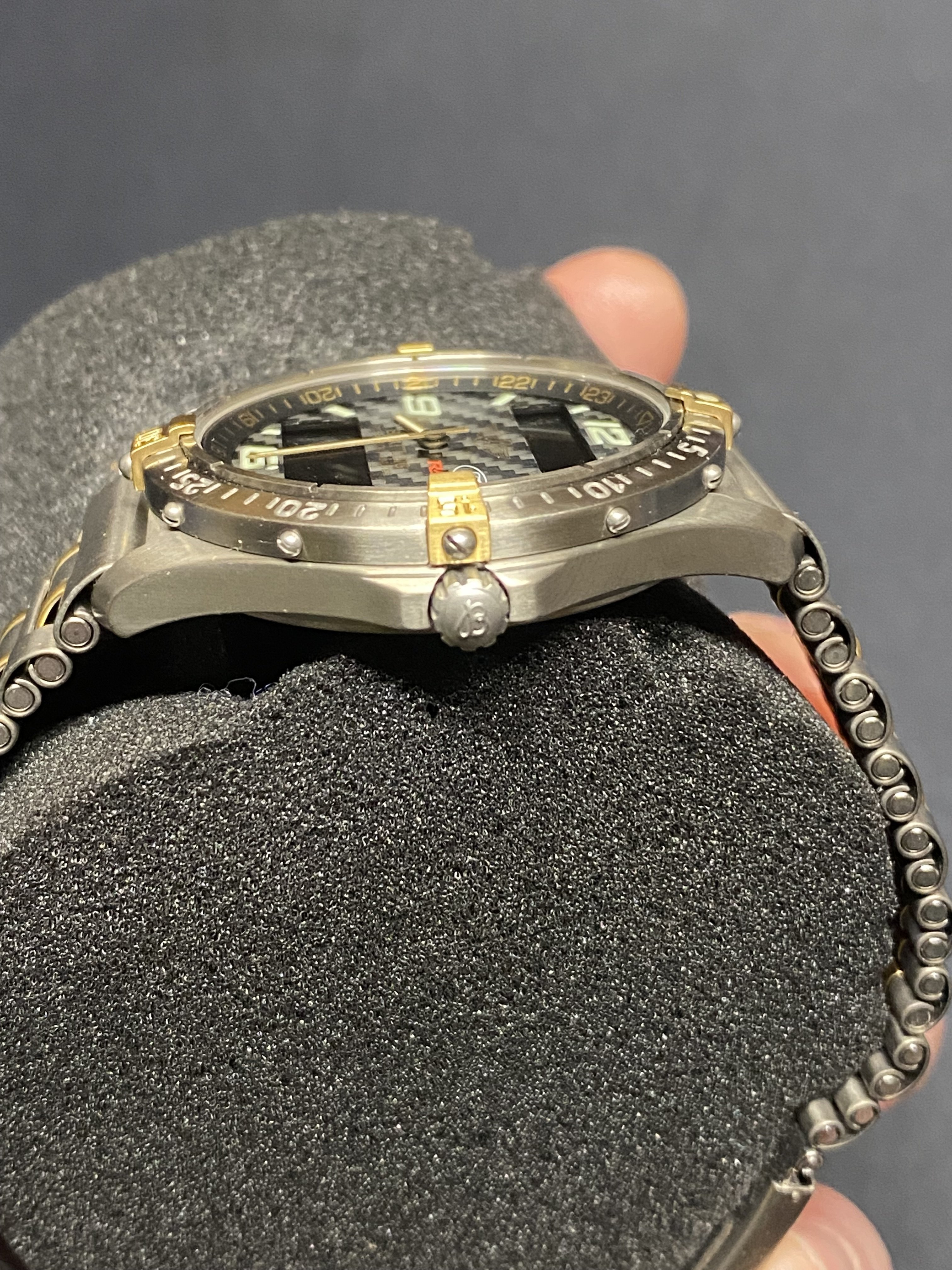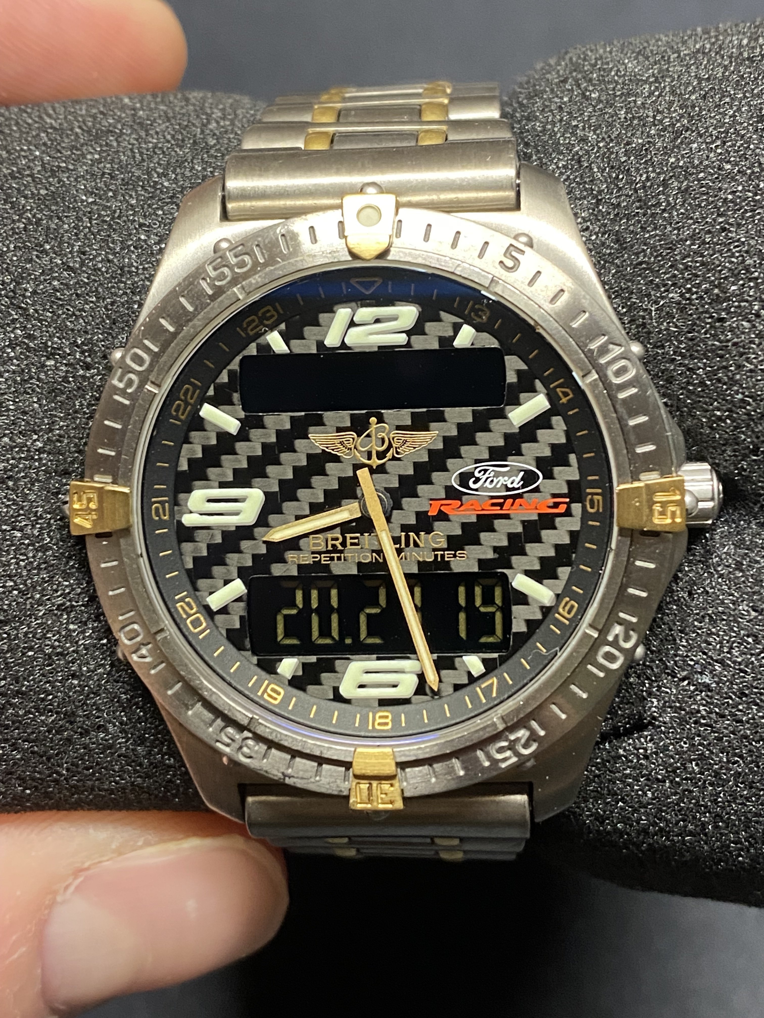 ·This one is from the annals of recent history, for all you Ford Racing fans out there! This is an original Titanium/Gold Breitling Aerospace collector's edition with a Ford Racing logo on a carbon-fiber face. Fresh battery, straight from the Breitling service center. The watch's exact age is unknown, but it's in the vicinity of 25 years old. This has been kept by a single owner in storage for a long time, and is now looking for a good home.