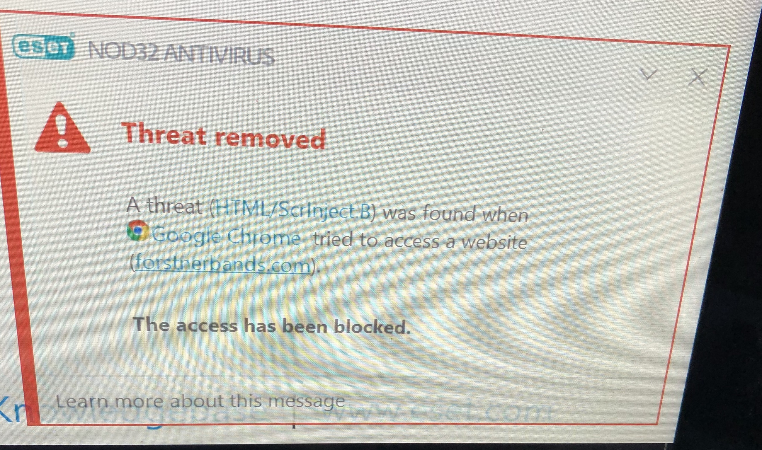 Thanks very much! Can you contact me at support@forstnerbands.com with more information about what message you got? We have inspected everything in the page coding on our site and we found no evidence of any Trojan or virus.