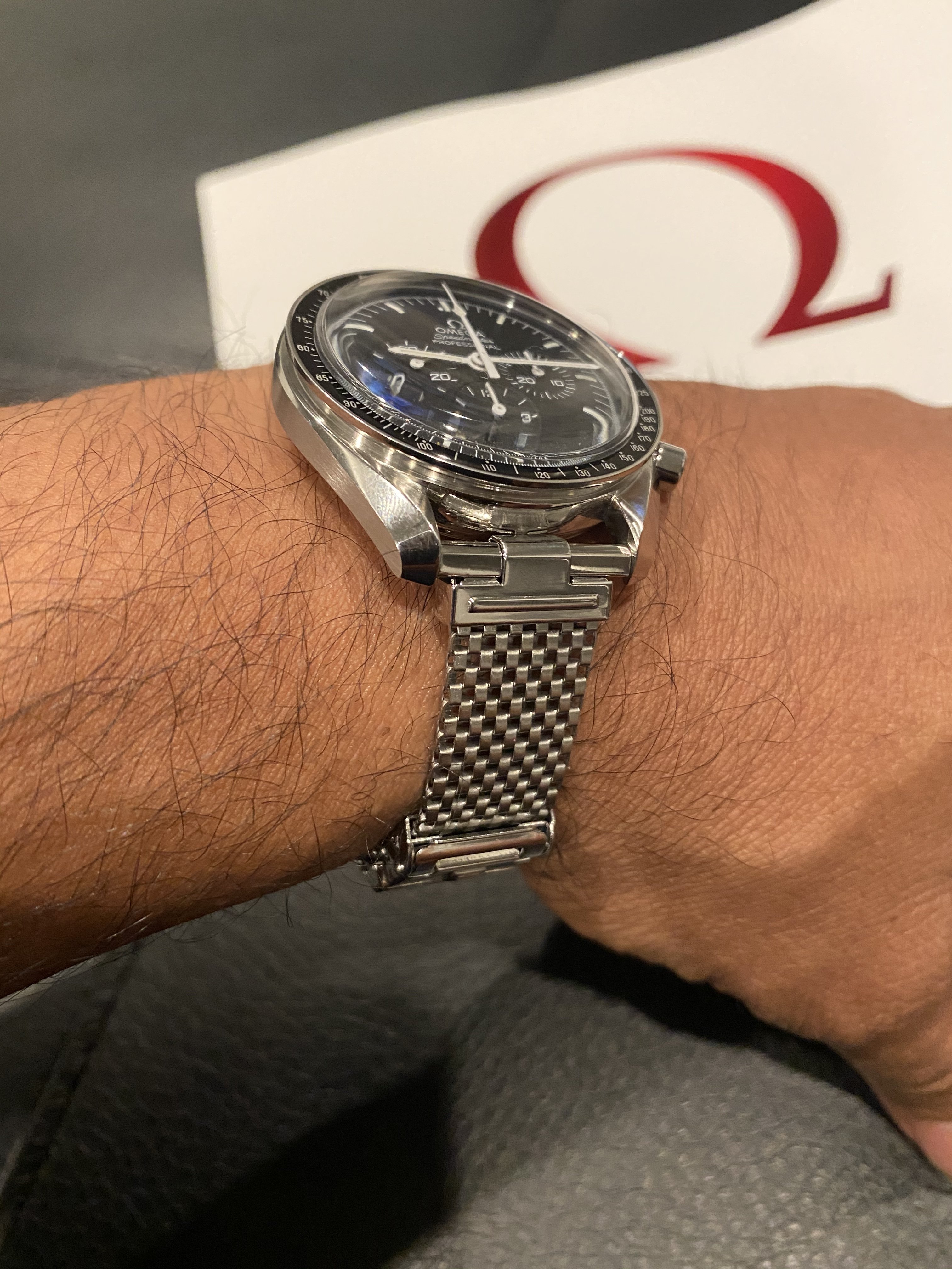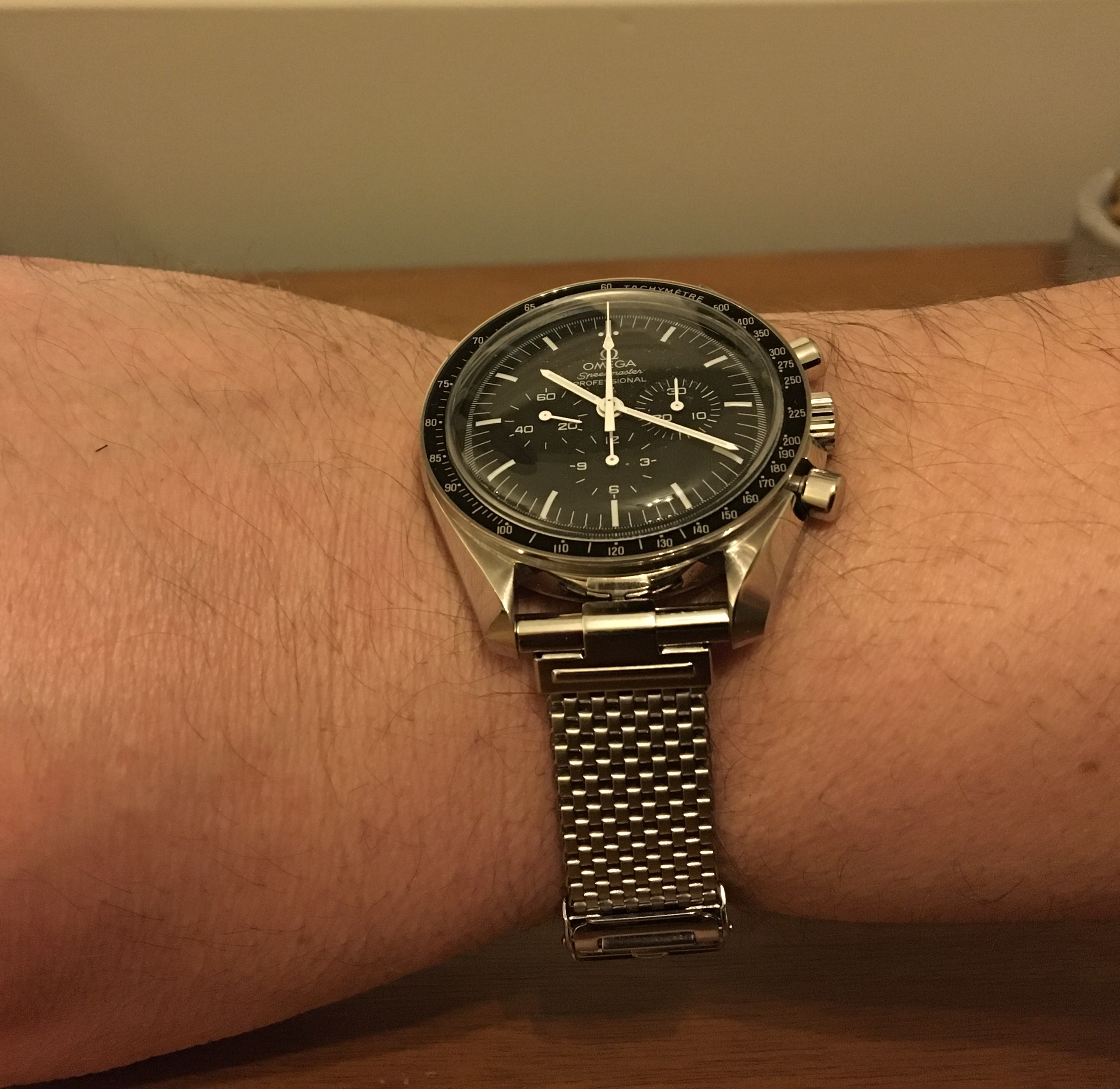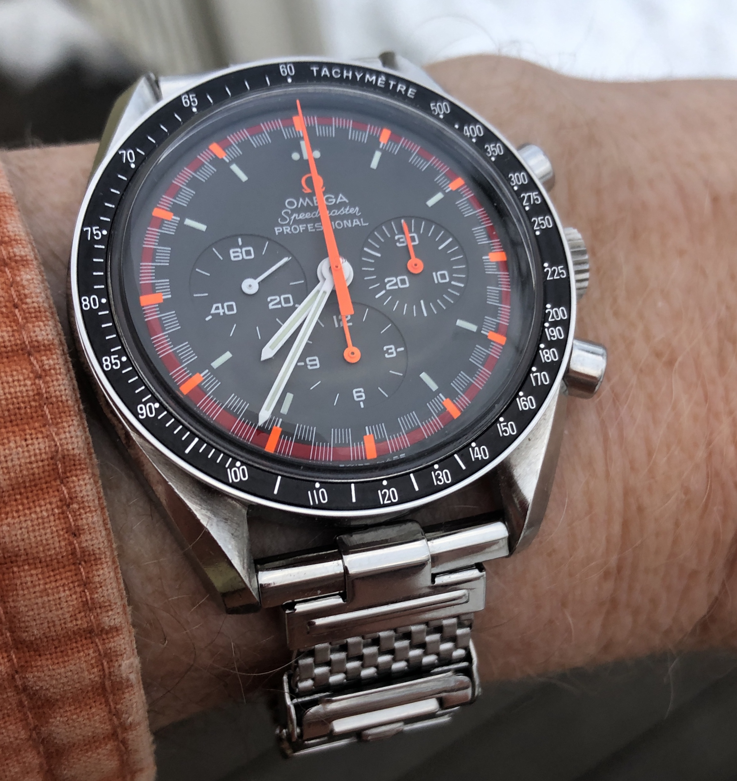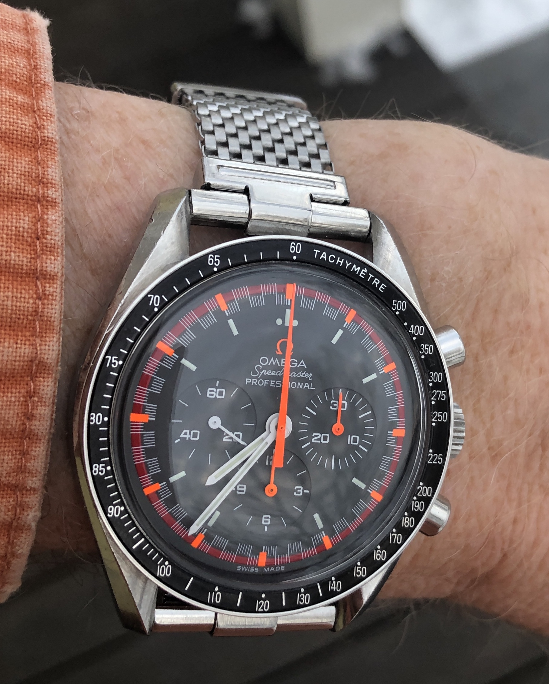 I now have a new one fitted to this JR speedy. I’m liking how the mesh of the bracelet riffs off the pattern of the minute track of the dial.