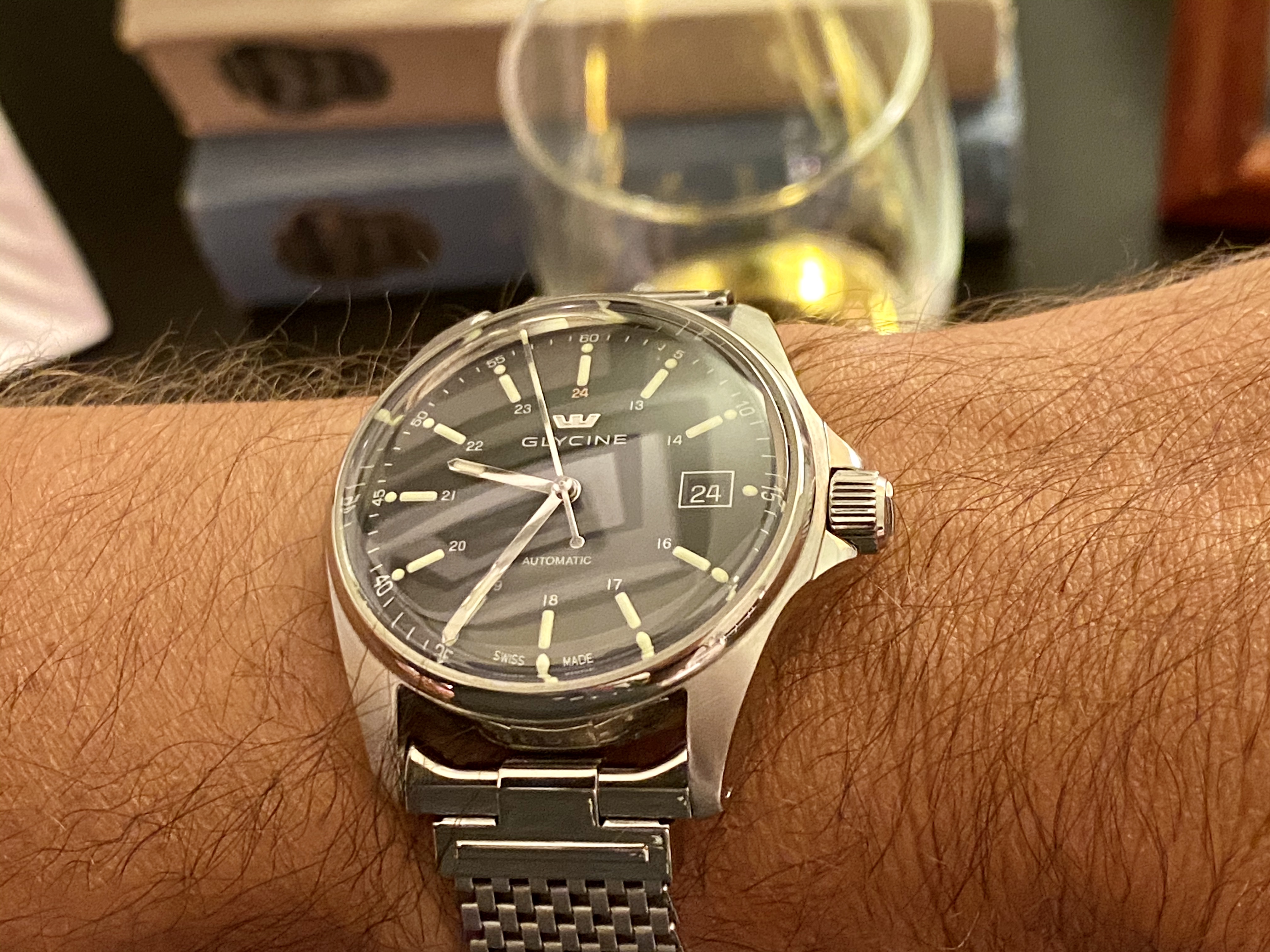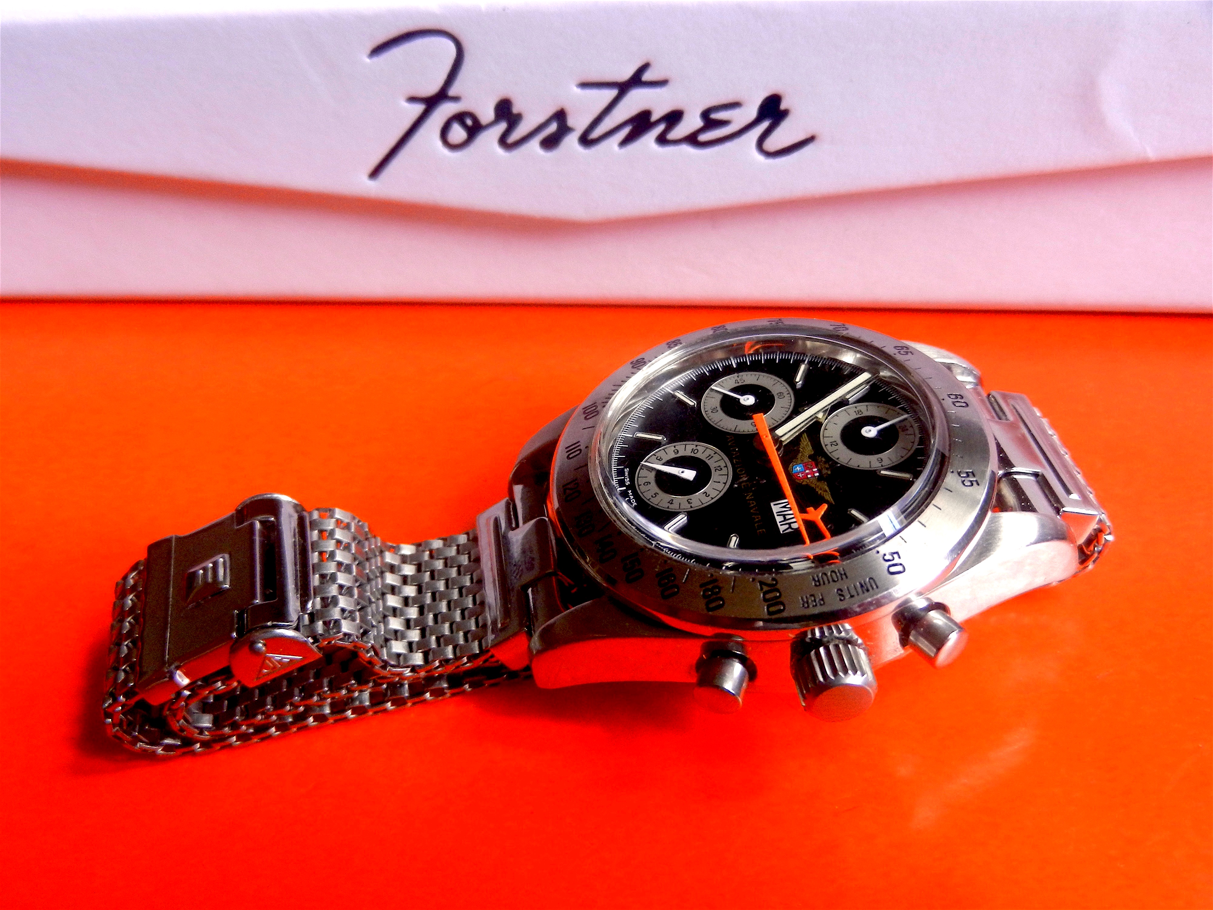 My wife purchased this Forstner as a Father's Day gift for my Speedmaster. It has not made it onto the speedy yet. I wanted to try it on a couple of other watches first and have really taken to it on the Glycine Airman No 1.