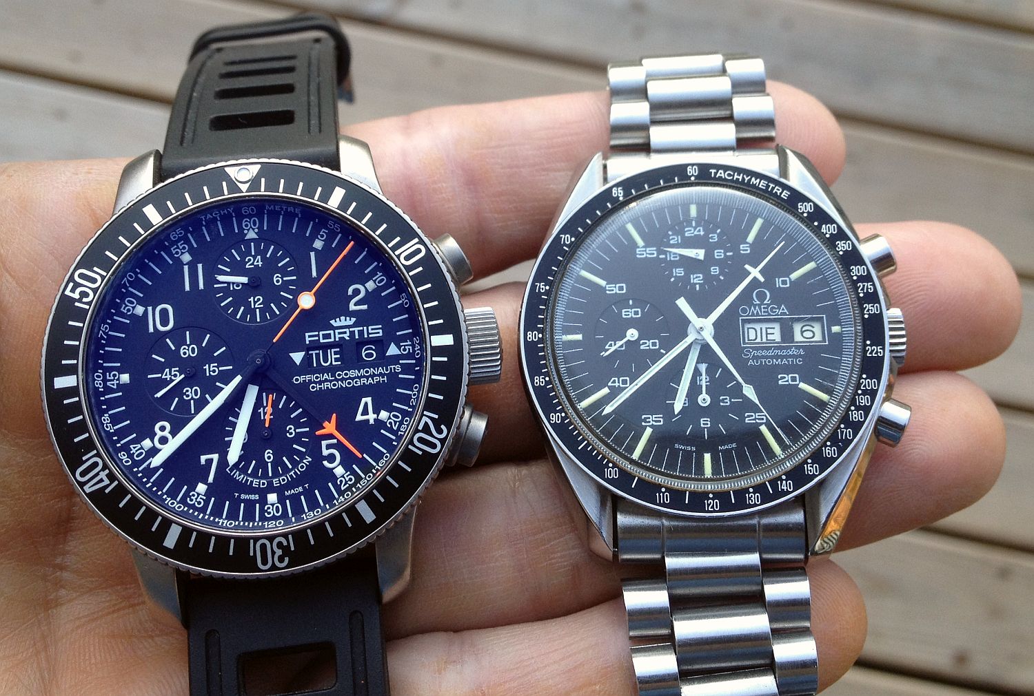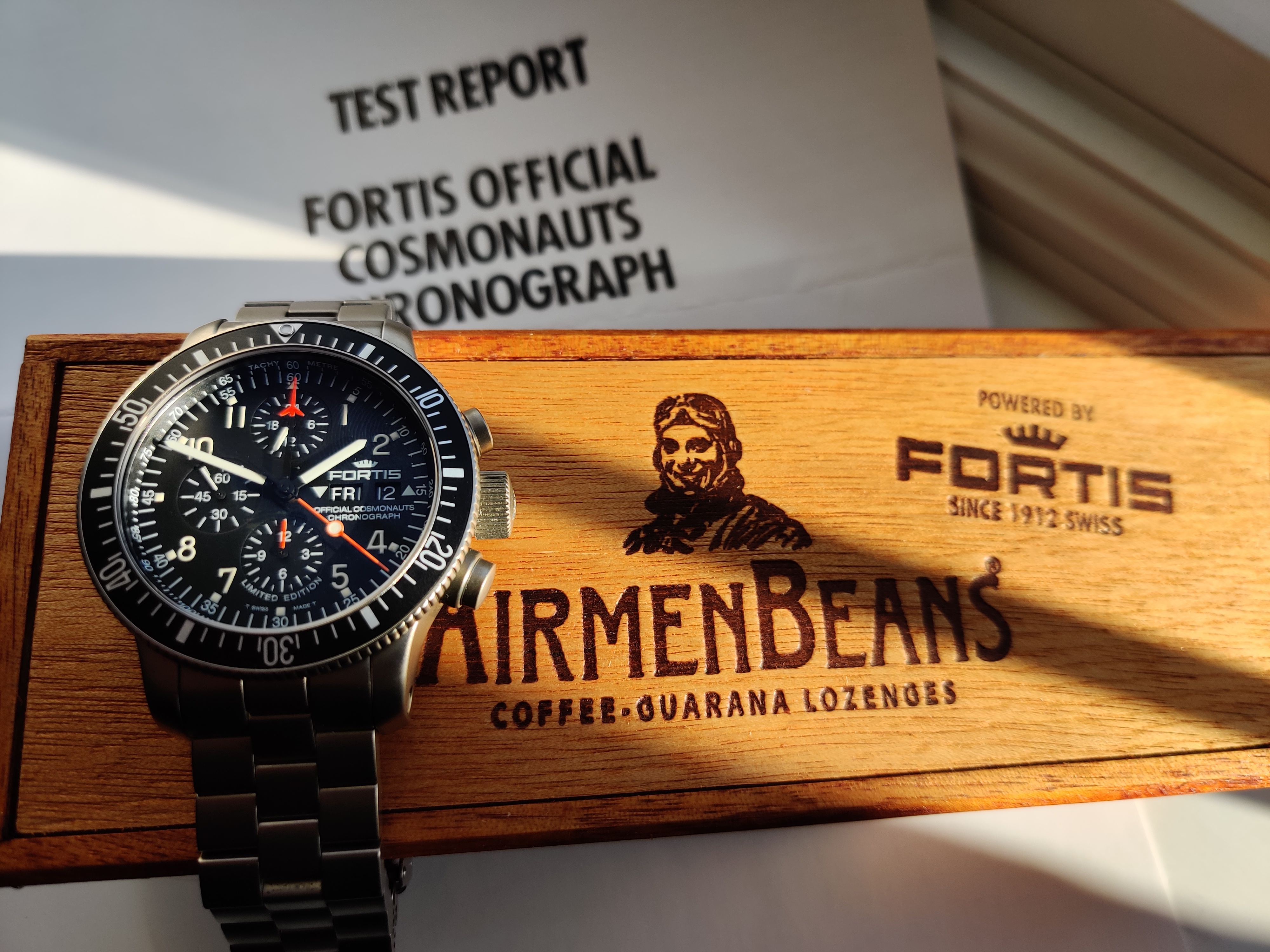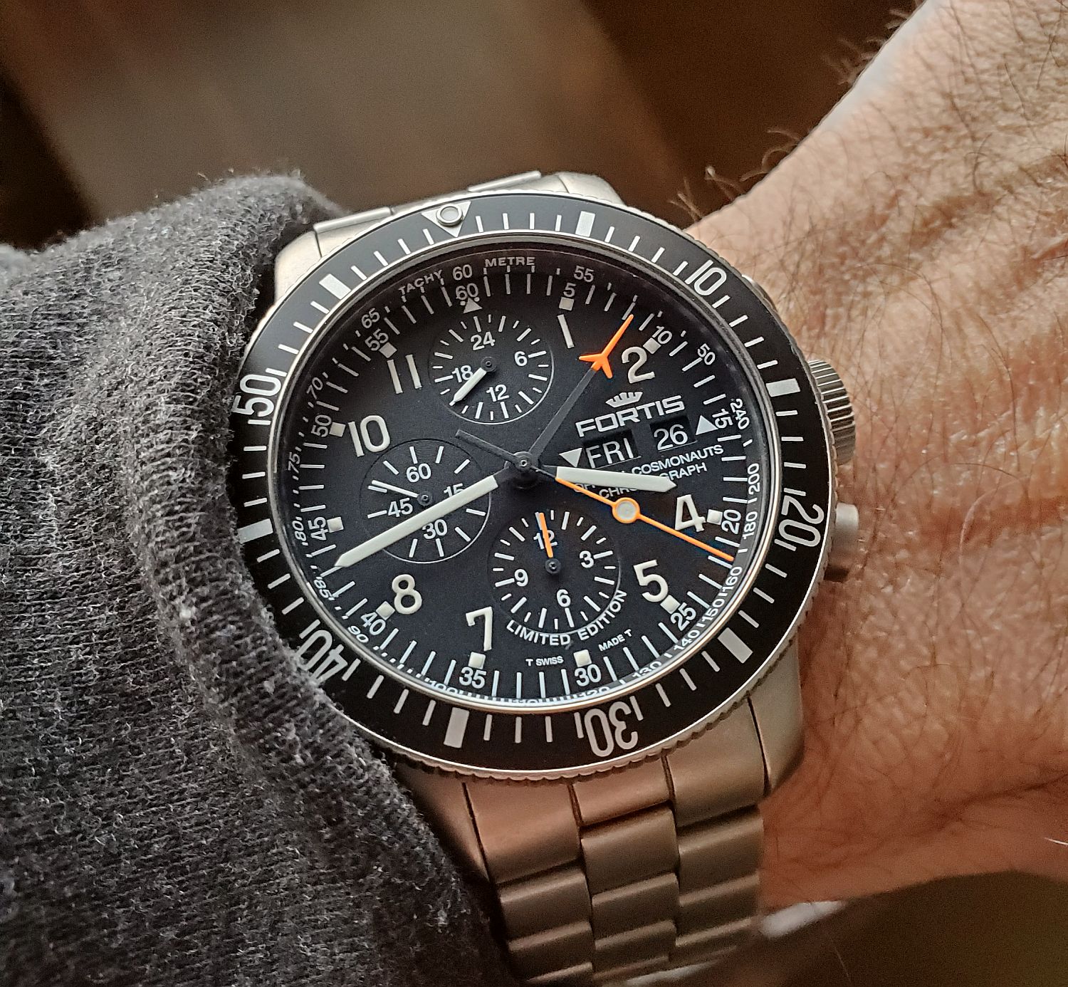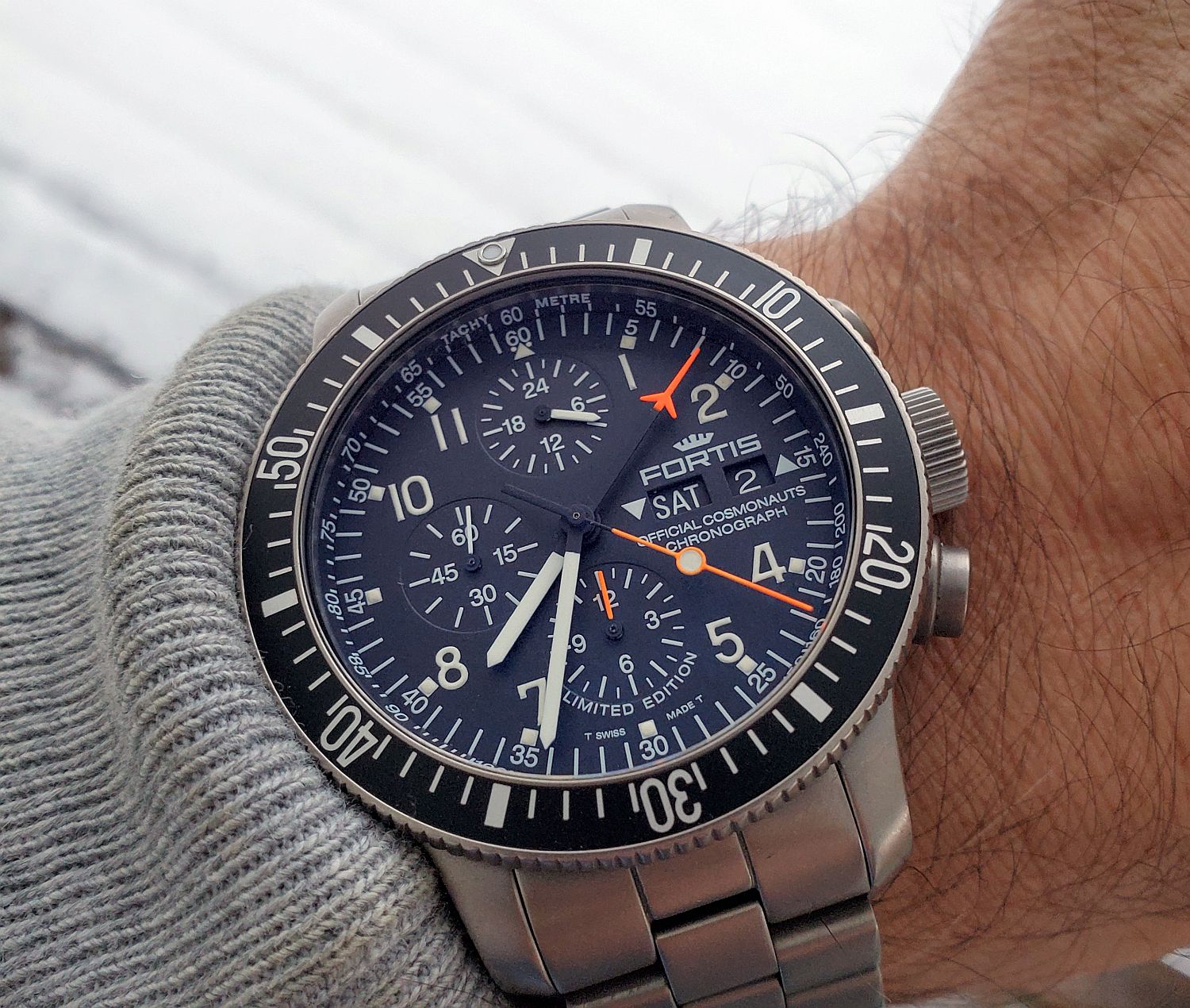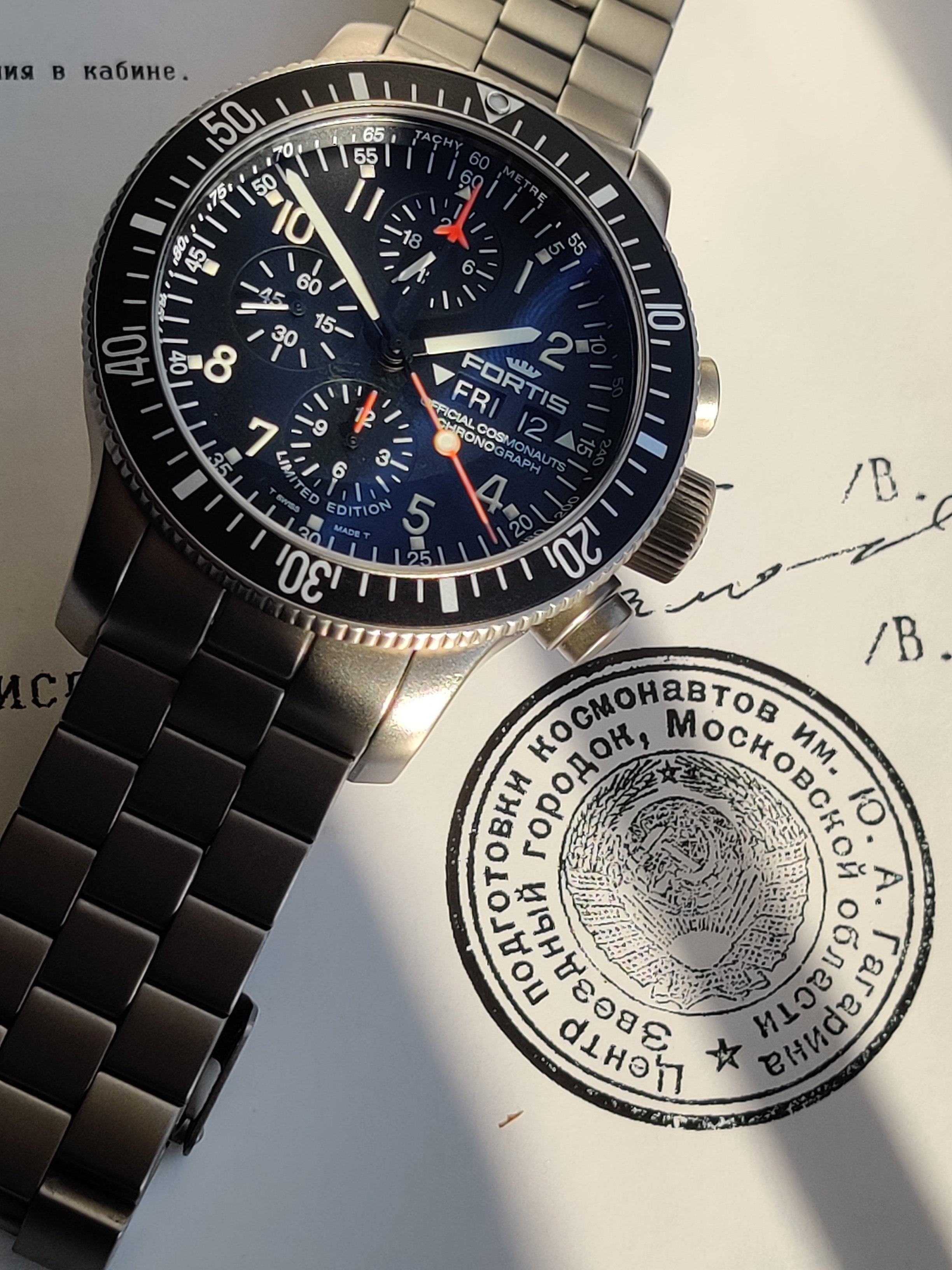It really is one of the tougher chronos out there, I can see why the Russians choose it for their space missions. Even though is packed with humorous amount information on the dial, for it's primary functions (time and chrono) it's really readable. Oh and take a look at the dial and chrono hands under UV light (in ready room during DEFCON or in the cockpit 😀 ), that's what I call readability. Plus, 200m WR rating for a chrono with no screw down crown ... you gotta give Fortis a credit for that!