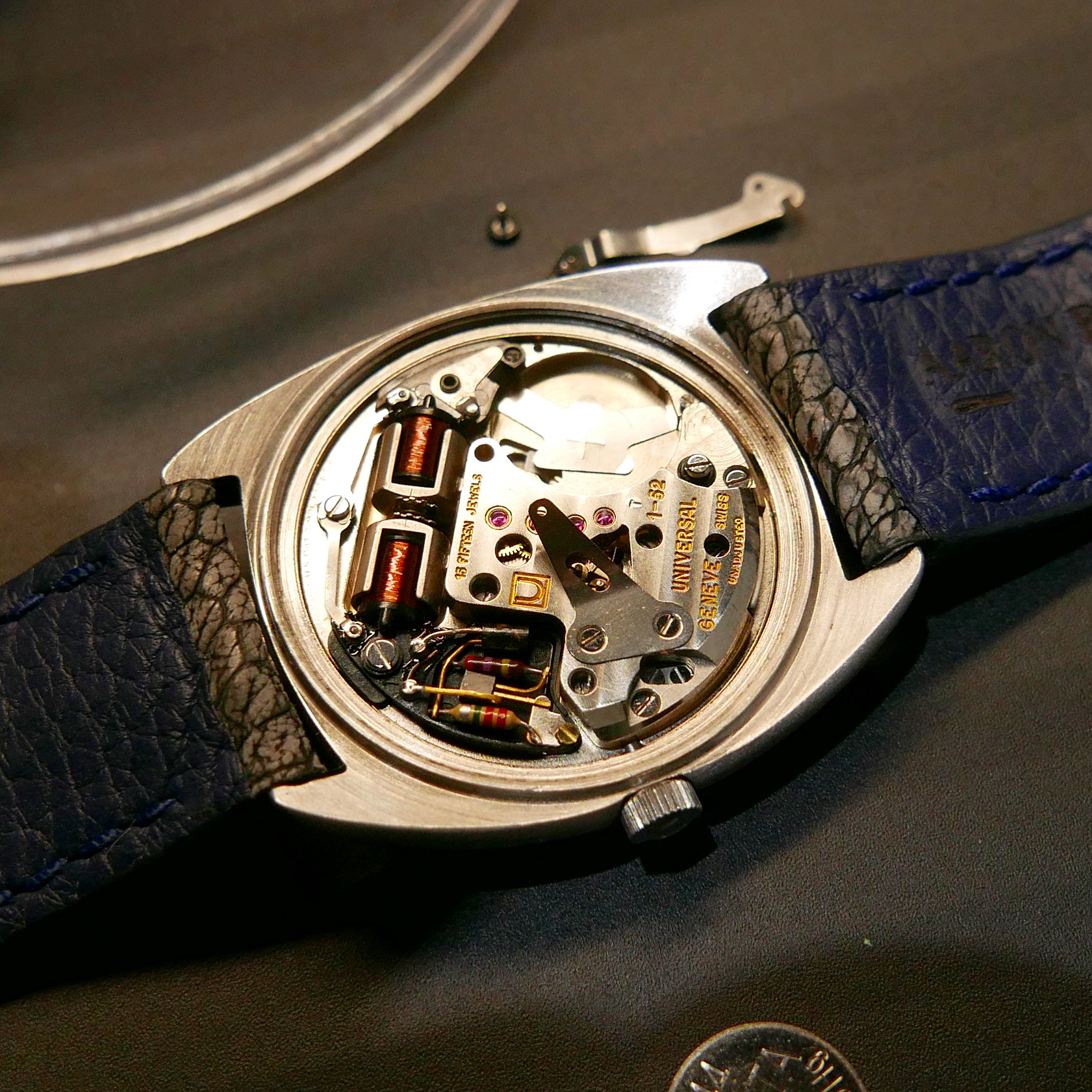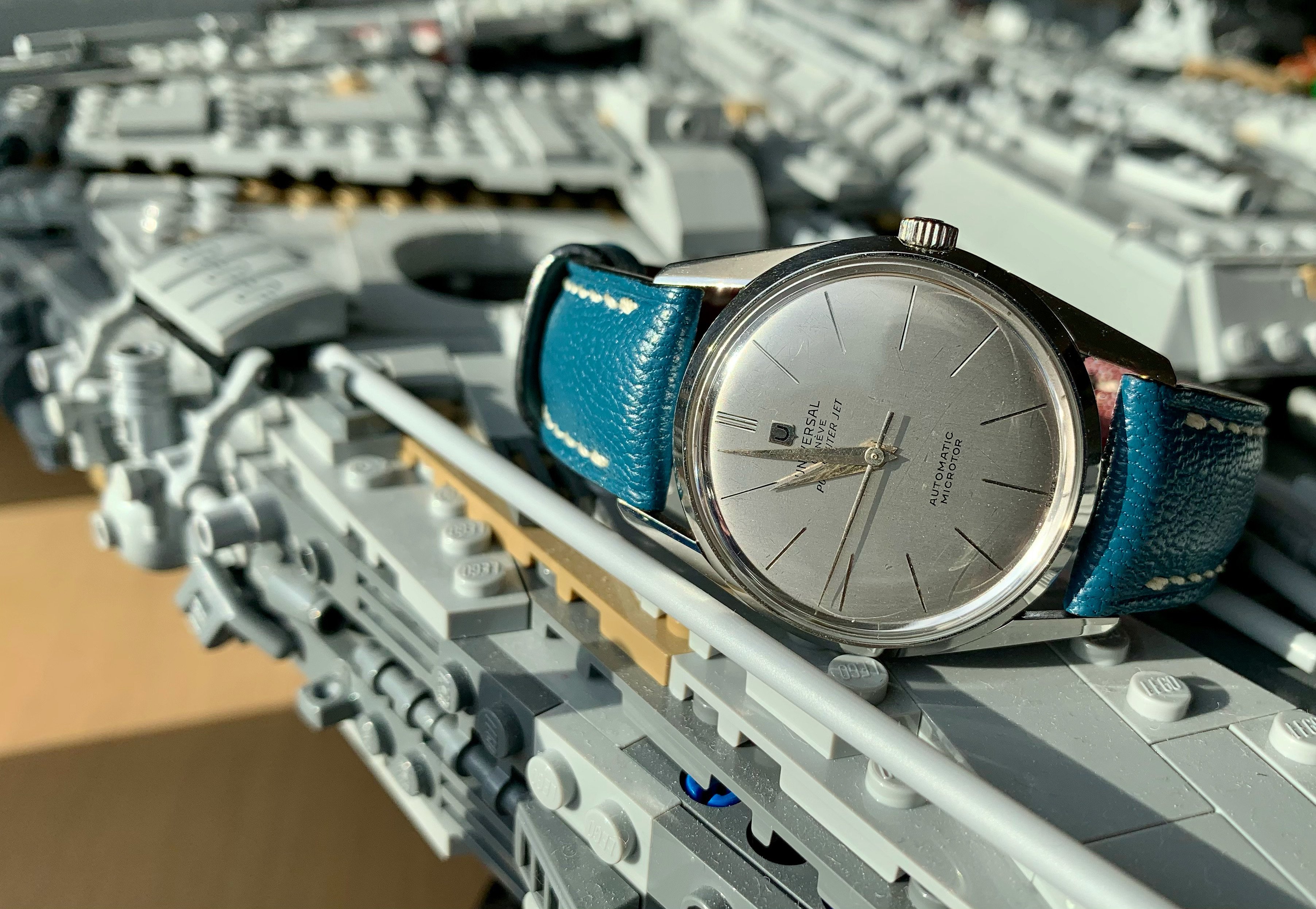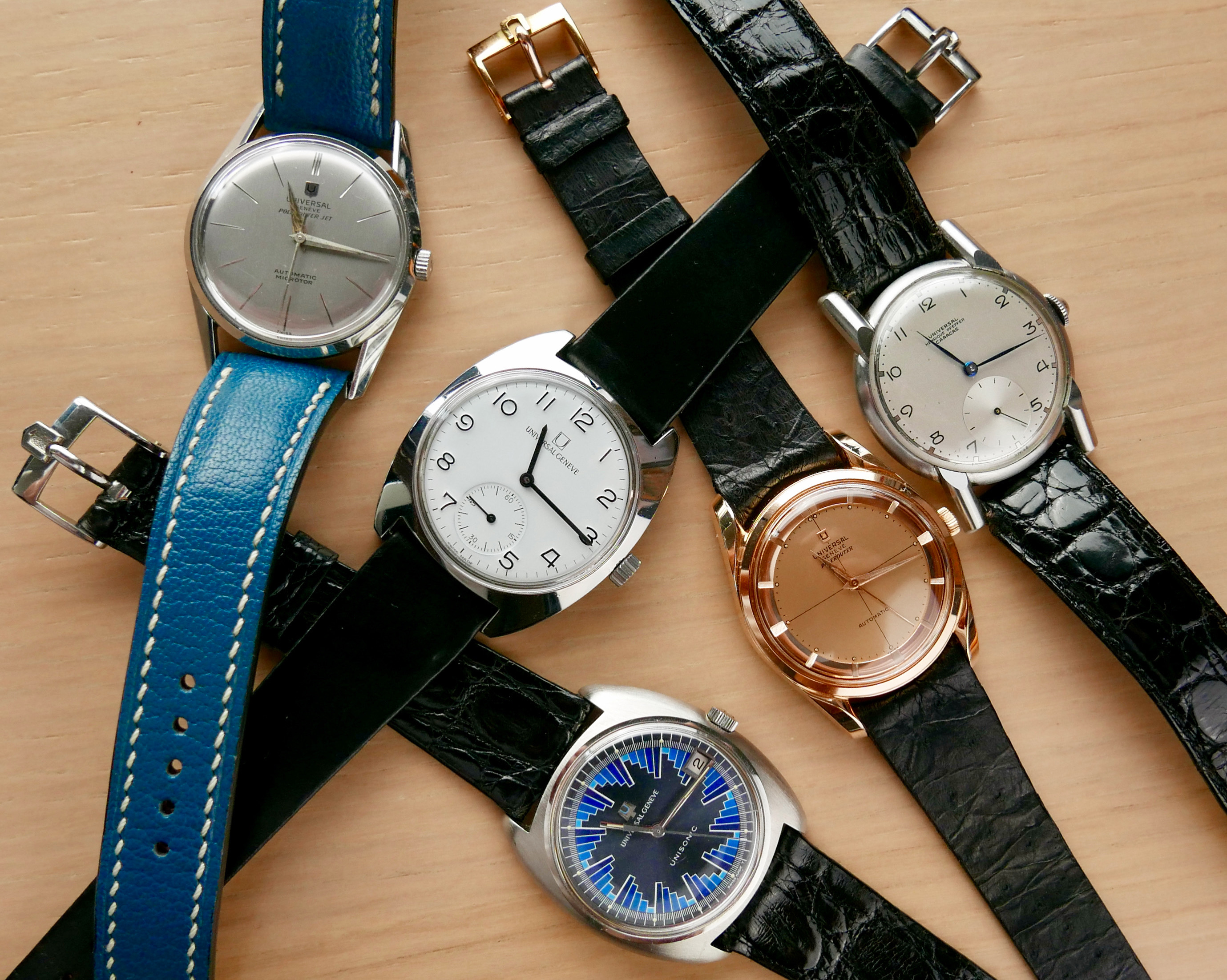 My collection of vintage Universal wristwatches spans the 1940s to the 1970s and includes a pair of manual wind movements, a bumper automatic, a micro-rotor automatic and even a tuning fork movement. I don't have a particular theme here beyond "UG watches" and prefer to collect a breadth of ages, technologies and designs. I recently sourced 4 period correct UG straps (all the black ones) and 3 UG clasps to start to round out the look.