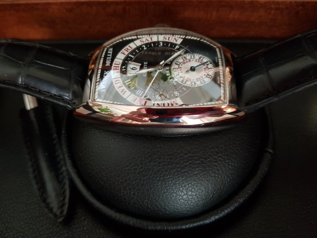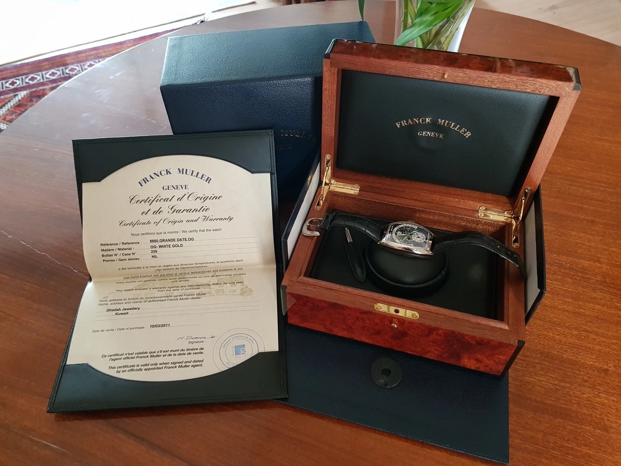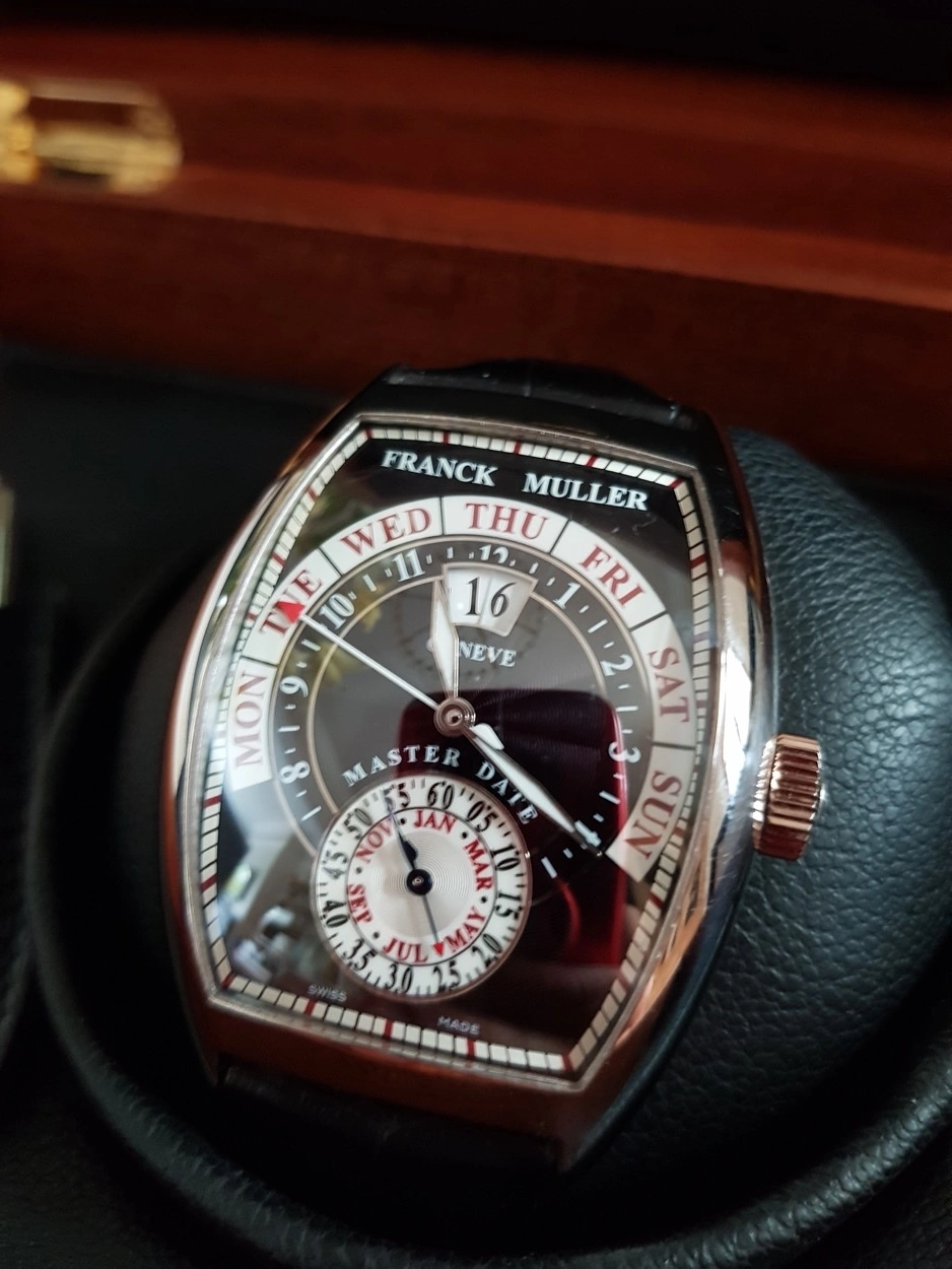 Up for sale is my Franck Muller 8880 Grande Date DG in solid white gold. Asking £9,999 Or best Offer. I am the second owner; the watch was originally purchased from a Franck Muller AD 2011. The watch is in excellent condition, worn minimally and always stored properly. This model features Franck Muller’s iconic tonneau-shaped curvex case. Contains an automatic movement, platinum rotor segment, fine guilloché black dial, retrograde week days indication with red tipped hand, months combined with constant seconds and big date, outer rail track, polished bezel, case back secured by 4 screws, case, dial and movement signed, with an 18k white gold Franck Muller buckle. Comes as a full set with Franck Muller boxes, warranty papers, user manual, pusher stylus and pouch along with 2023 full Franck Muller service record. Franck Muller watches of this area are fast becoming collectible due to their horology, crafstmanship and interesting design language. Stored in a PELI 1450 watertight case (not included) in a temperature-controlled room and routinely wound to keep the movement active.