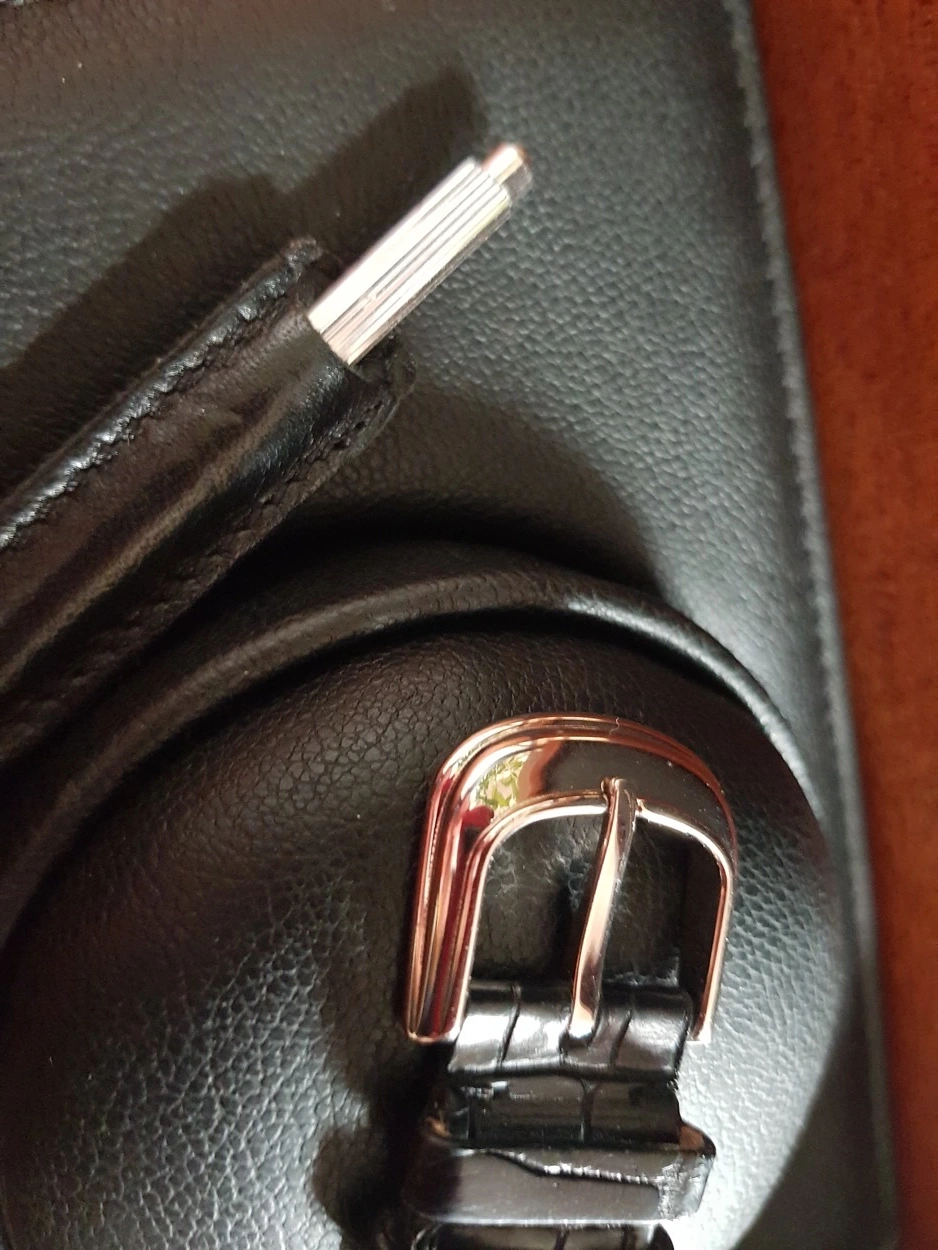 Strap: Black Franck Muller alligator leather strap with matching signed white gold pin buckle