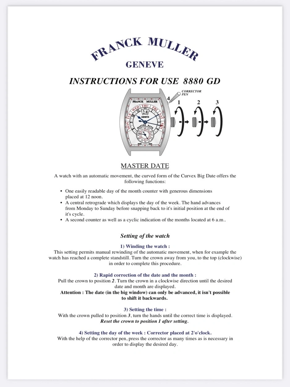 INCLUDES: Full Set - original inner & outer boxes, Franck Muller warranty papers, original pusher stylus with leather pouch, user manual. Benefits from a full 2023 Franck Muller mechanical service (around £2,000).
