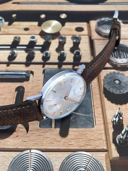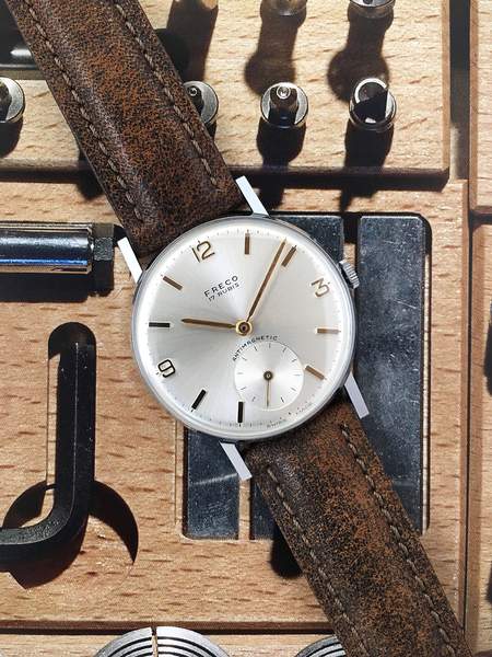 Other: This rare vintage Freco watch is a great buy for under $300! We love the rose gold-tone accents and the overall classic look of this piece. It is powered by a Swiss manual-winding movement with small running seconds register at 6 o'clock, a detail that we don't often see these days on contemporary watches. The distressed brown leather strap is a nice contrast against the bright silver dial and can be worn with everything from a suit and tie to a t-shirt and jeans.