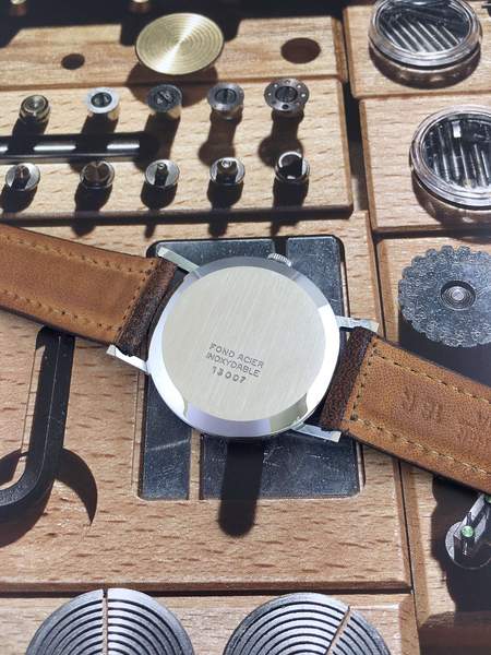 Strap: 18mm distressed brown leather strap with polished stainless steel tang buckle