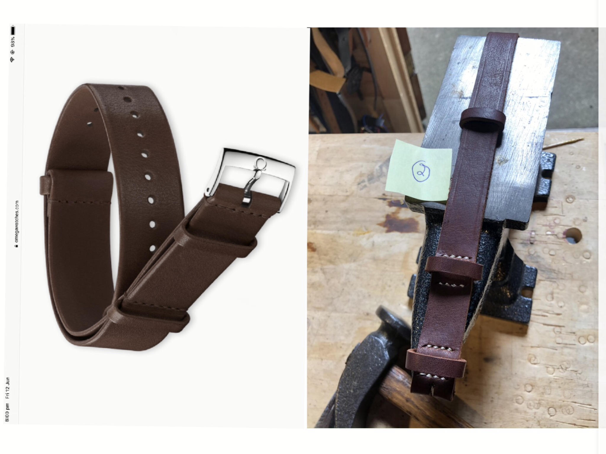 ·I am relieved to see that one of the straps has finally arrived. Great cause! Nice watch! Trying NATO with pig skin for the first time. Quicker to make than regular straps, but since it’s my first one I am spending a lot of time measuring, calculating, and trying to figure out how it will fit. I already see flaws in this one. It is not done yet.,,