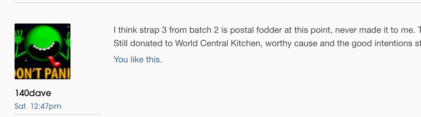 I think strap 3 from batch 2 is postal fodder at this point, never made it to me. Too bad, was a really nice looking strap. Still donated to World Central Kitchen, worthy cause and the good intentions still count. 😀