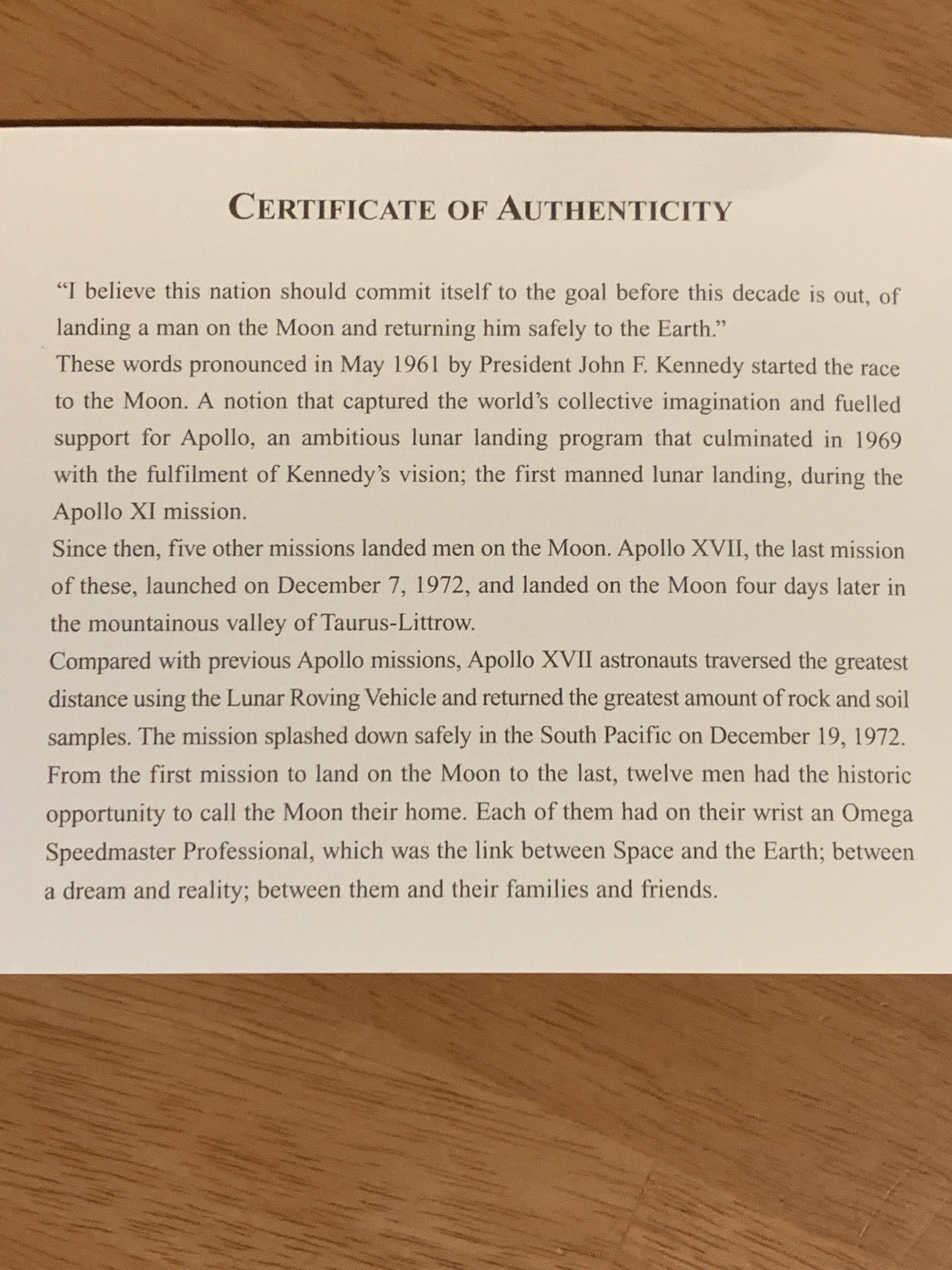 Posts 5,253 Likes 4,792 DLT222 ·Dec 15, 2019·Double D @ ΩF I have the certificate for the Apollo 17 Last Man on the Moon 30th Anniversary with LE number 999/3000 If you can show me the watch it goes with and verify you have it I will send you the certificate - Just cover my postage!! It was originally a UK watch I think. Drop me a DM if you have it