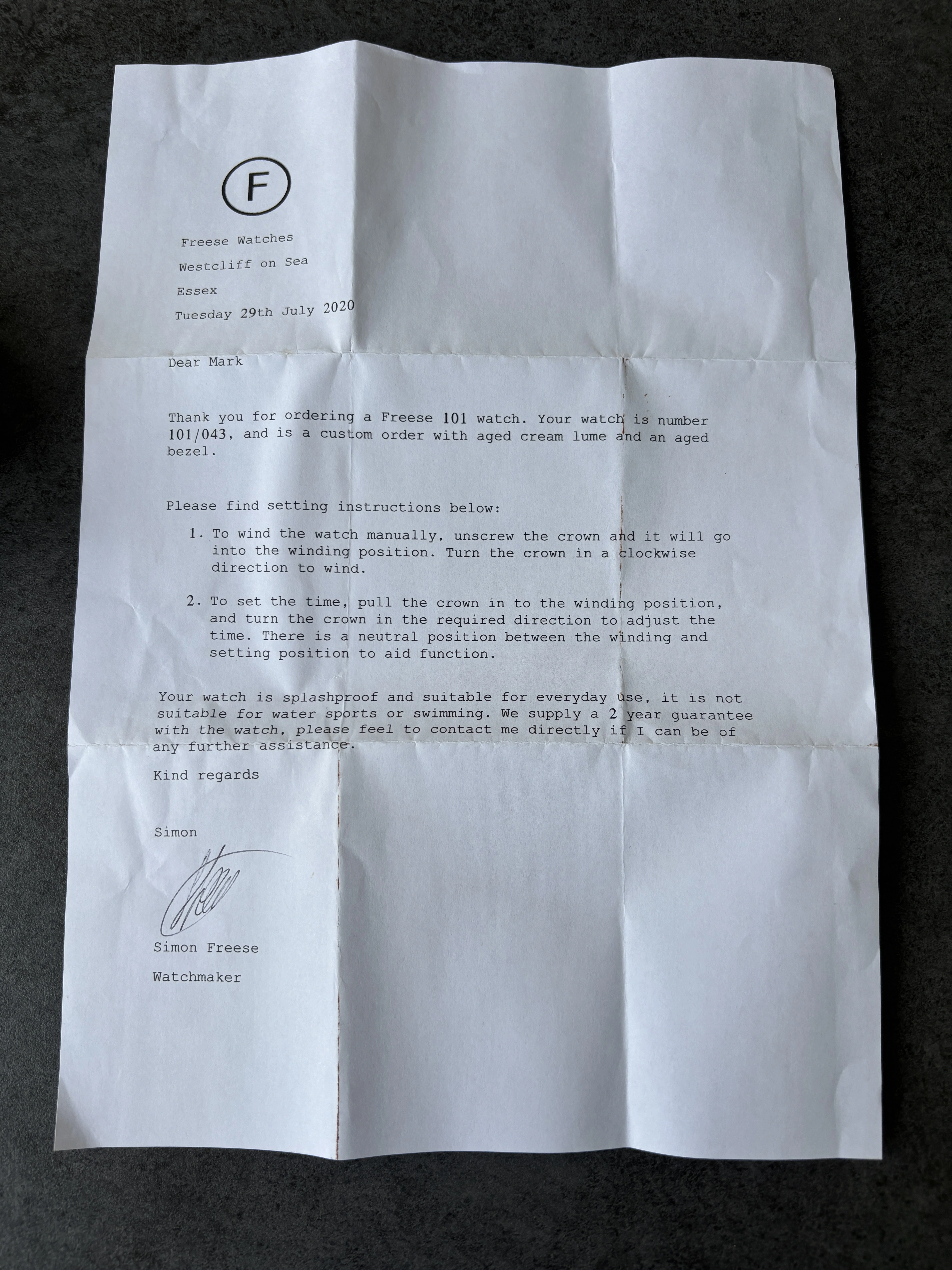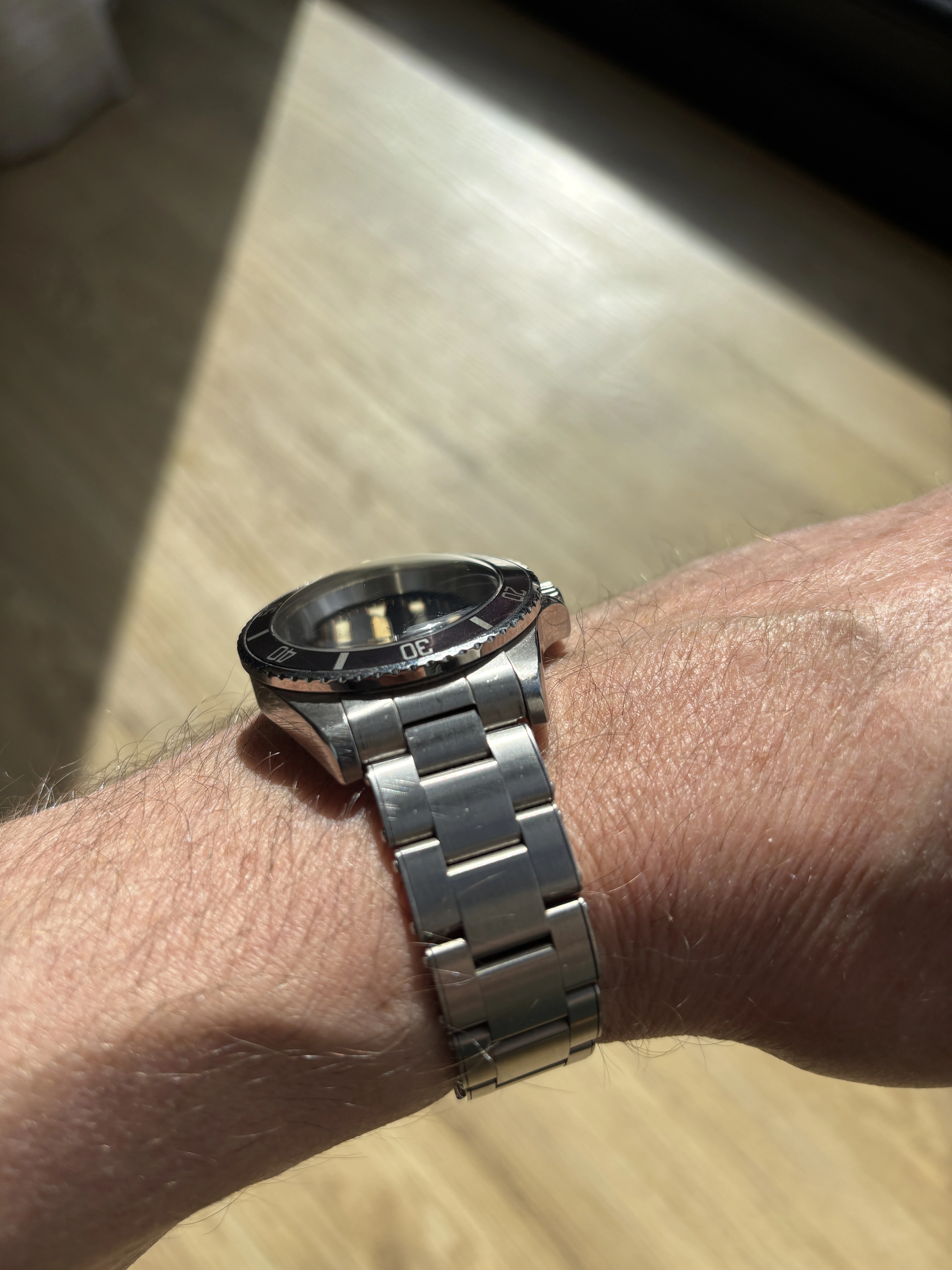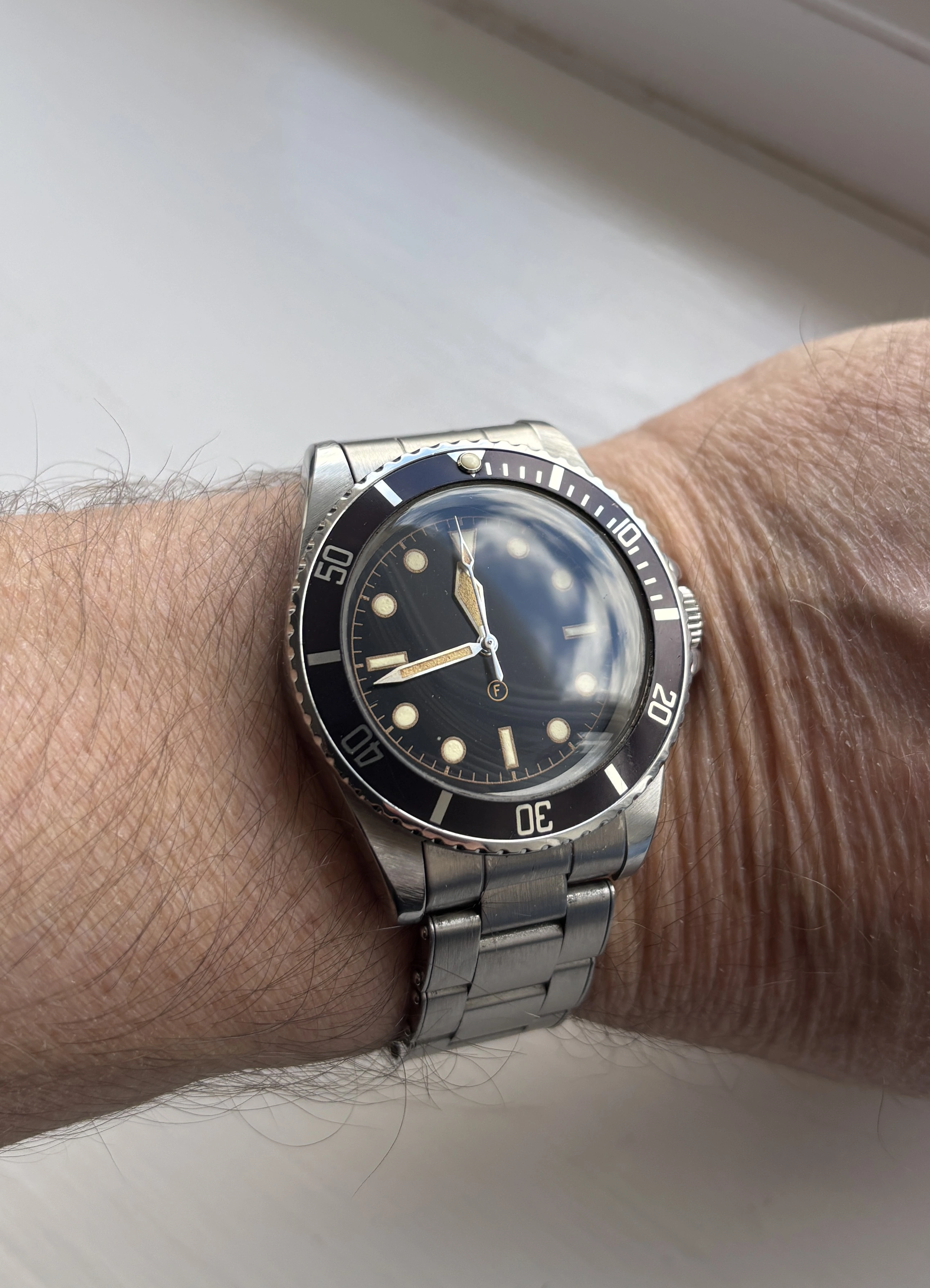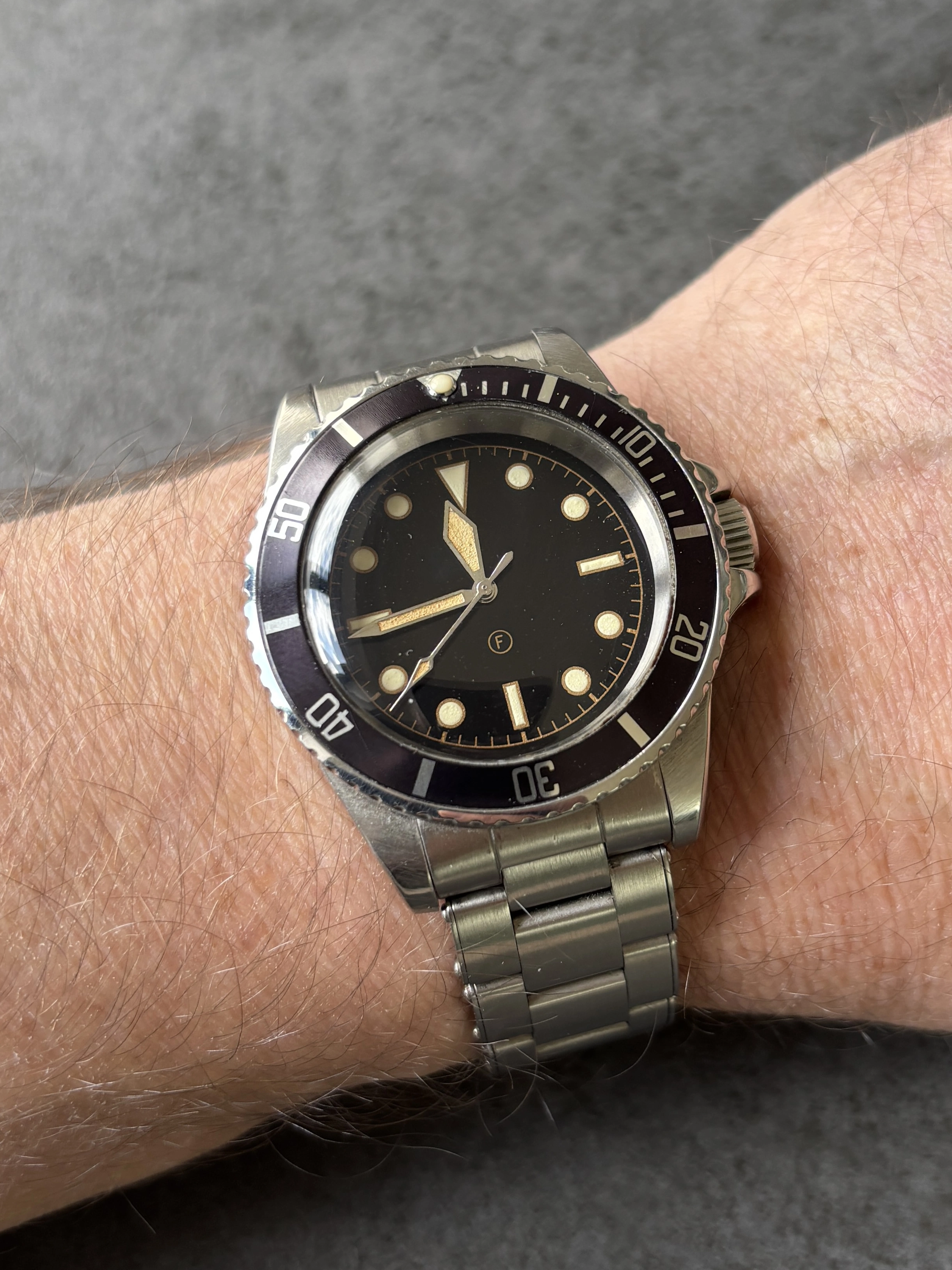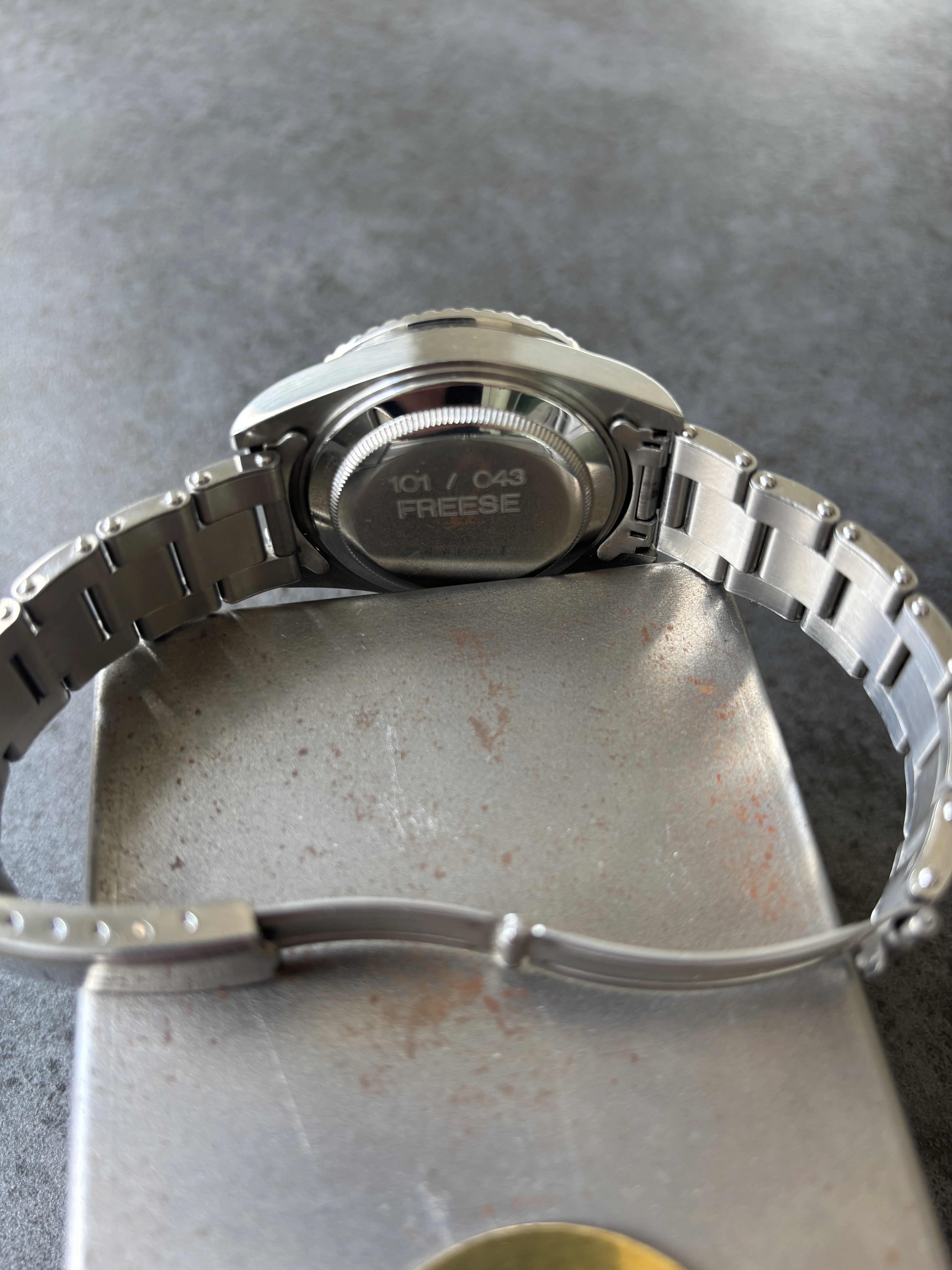 ·Looking to sell my Freese 101 (No 43) with Freese original metal bracelet. When I spec’ed the watch I didn’t want it to look overtly aged so the dial, bezel and case are pretty crisp. Simon had a couple of goes getting the lume as yellowy and textured as possible. The bezel has a nice purple colour to it in sunlight.