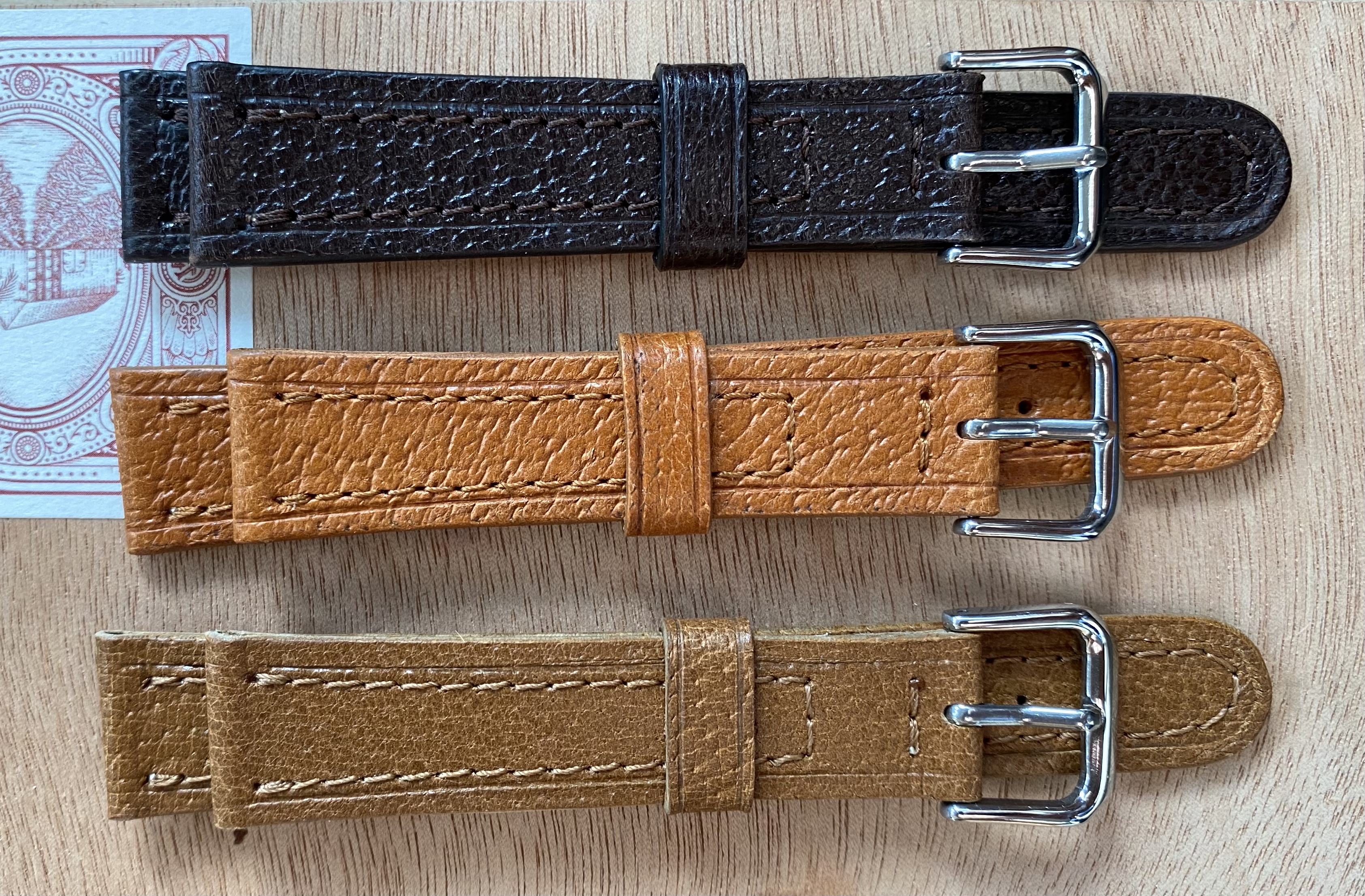 The straps are made of a high-quality pigskin, the kind that used to be in favor because of its durability, and we tried to keep the color palette very true to what would’ve been offered at the time. They are vegetable-tanned and hypoallergenic leather lined.