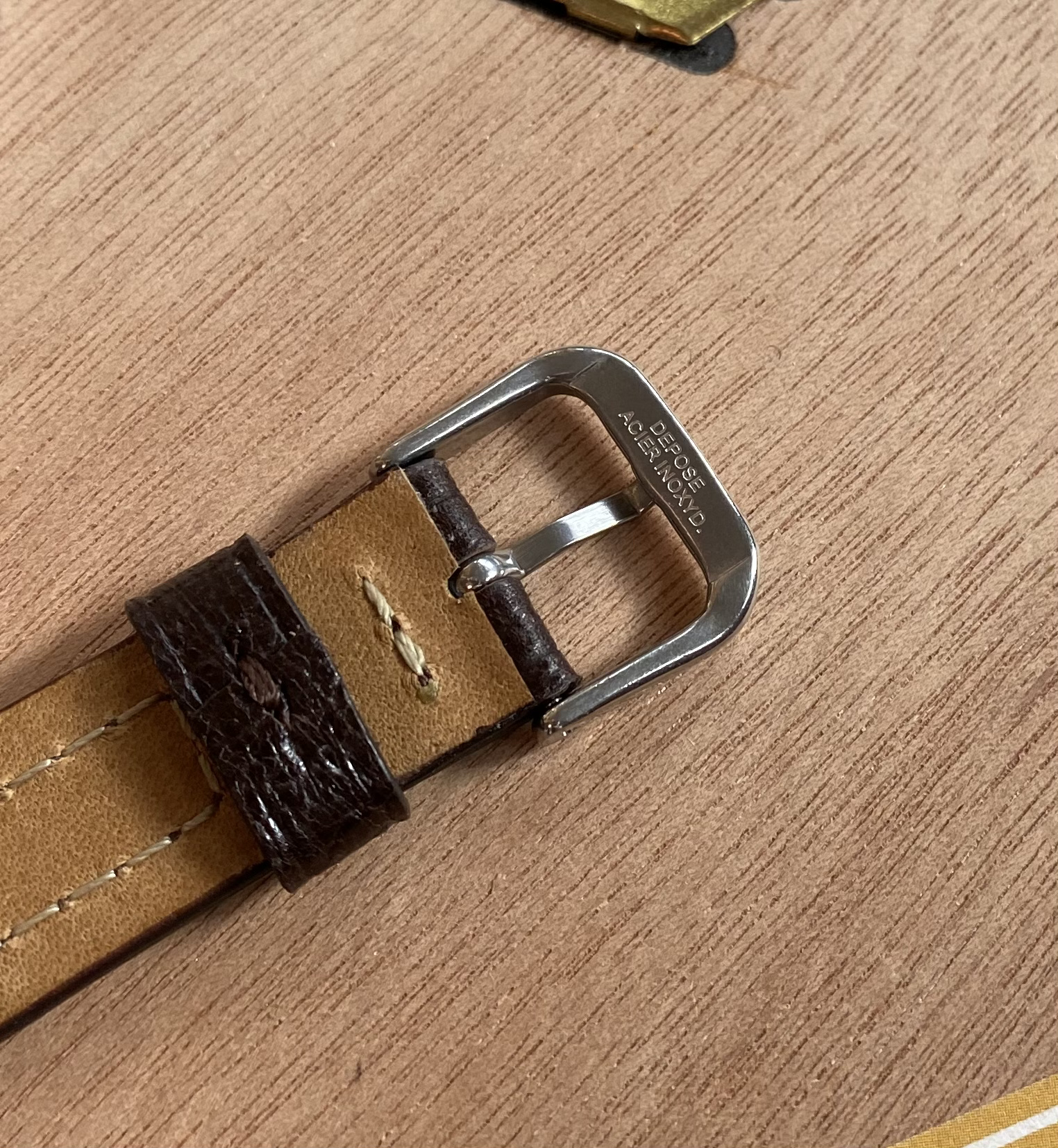 Recently Matteo was able to source superb 316 stainless steel tang buckles, the best quality vintage-style buckle I’ve seen or laid my hands on. I’ll let you be the judge. They are visually similar but more robust than the early Omega buckles (that predate the buckles with the raised Omega emblem).