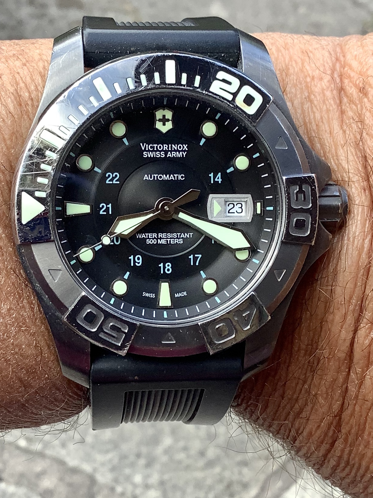 With this amazing summer winding along, I’m sailing and or paddling nearly every day, so I pulled this often forgotten beast, my very fist automatic, out of the box over two weeks ago. Still on my wrist. I think it’s picked up a few new scratches. It’s really a comfortable workhorse despite its size. P