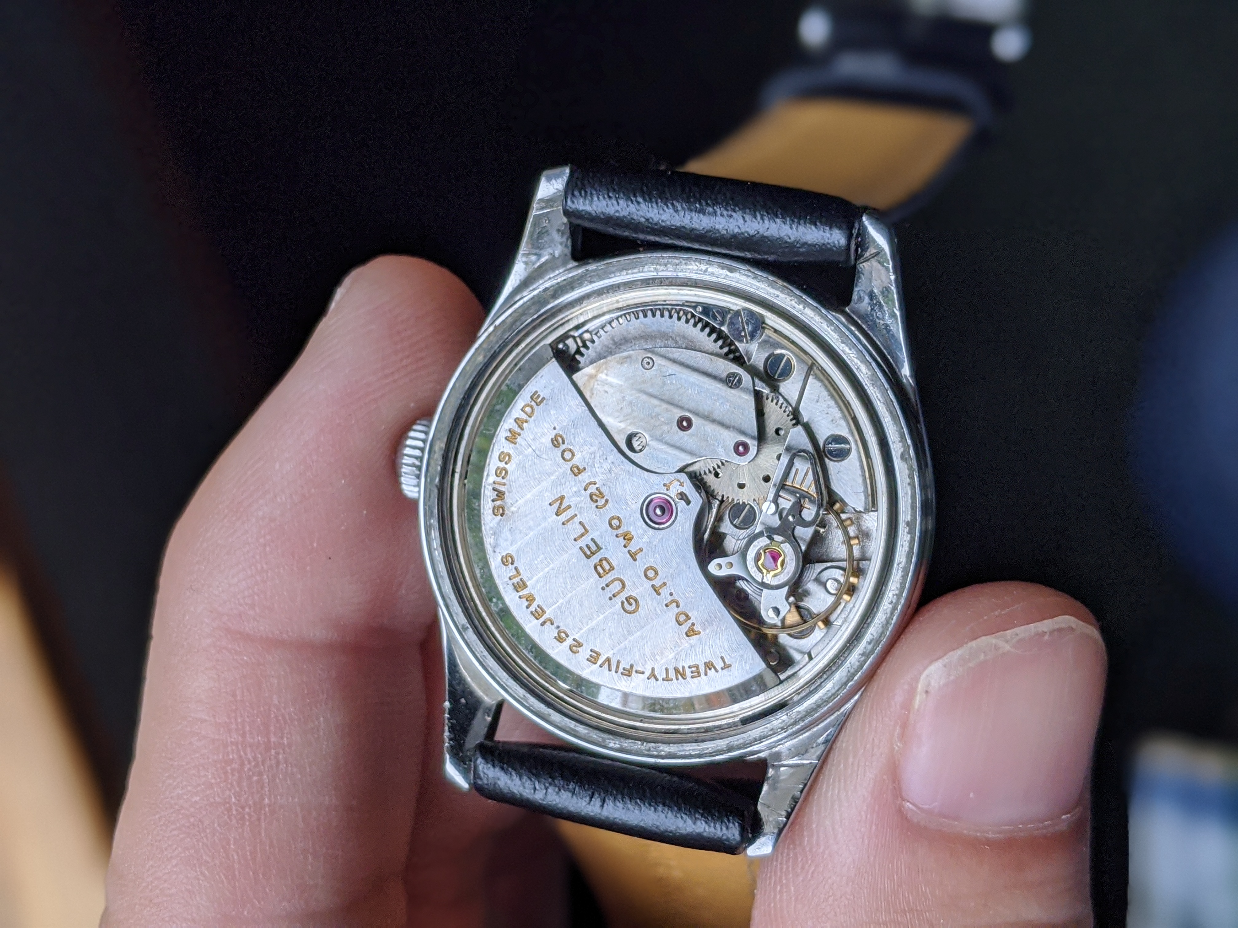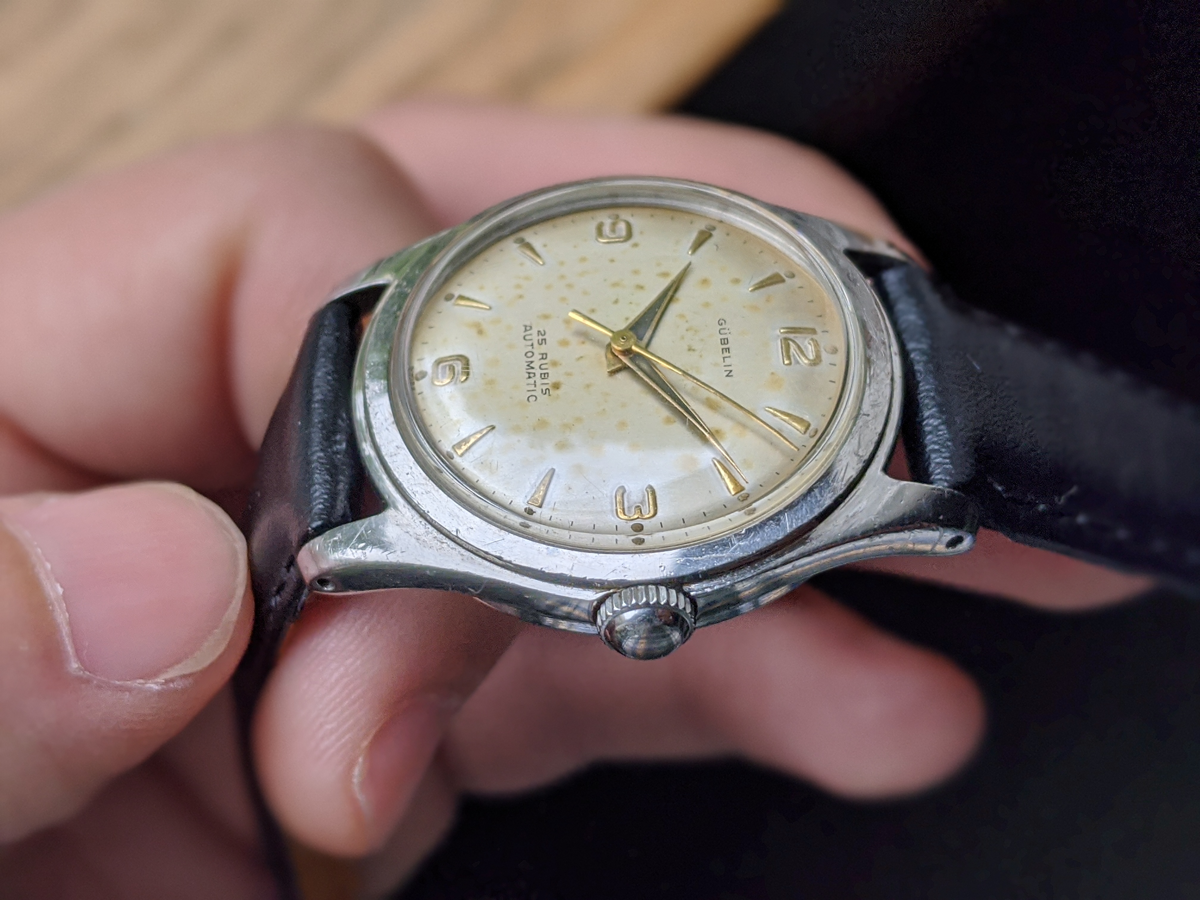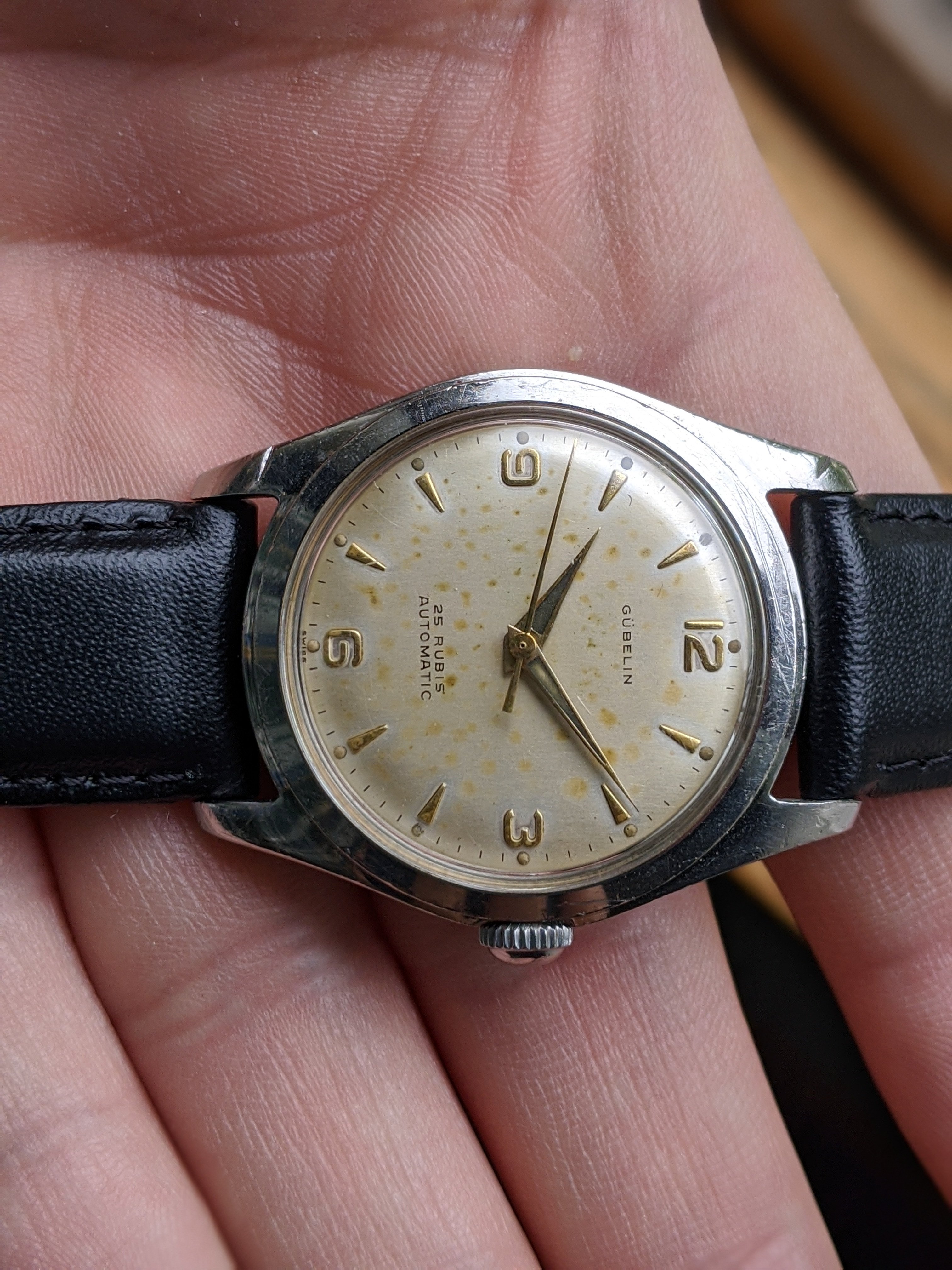 ·Here we have a 1950s steel Gubelin. The case measures 34mm, without the crown. The case back screws on, and the case is nice and thick. The watch appears all original, minus the 18mm strap. The dial has a nice spotted patina. It keeps great time, although I do not know the service history. I'm asking $300 or best offer. Returns allowed if grossly misrepresented. Please PM me with any inquiries. Thank you, Matt