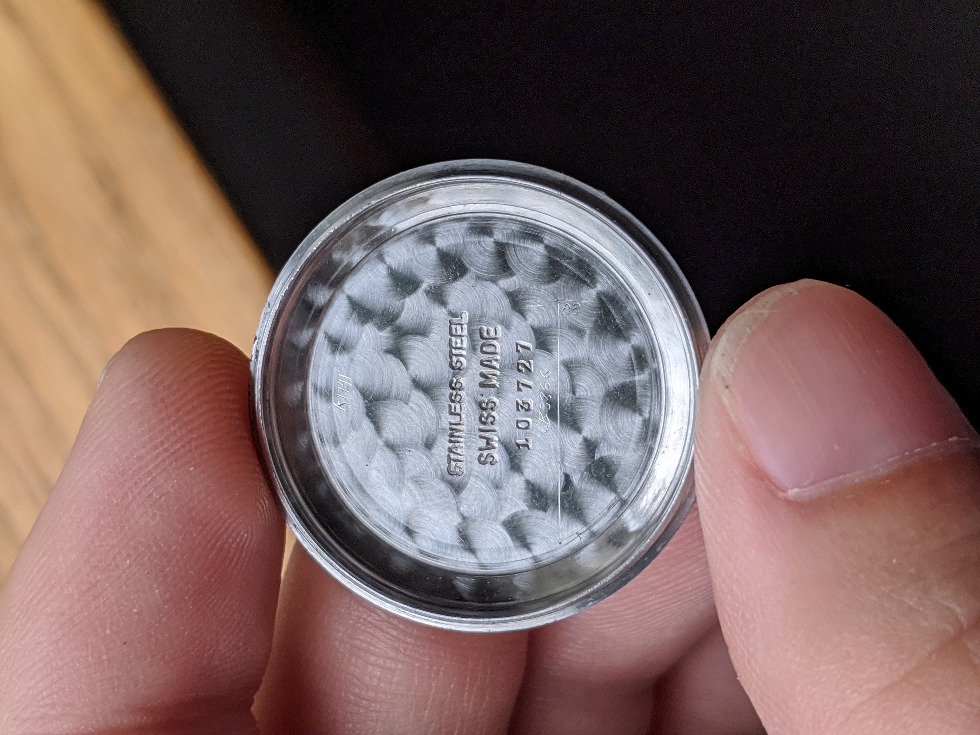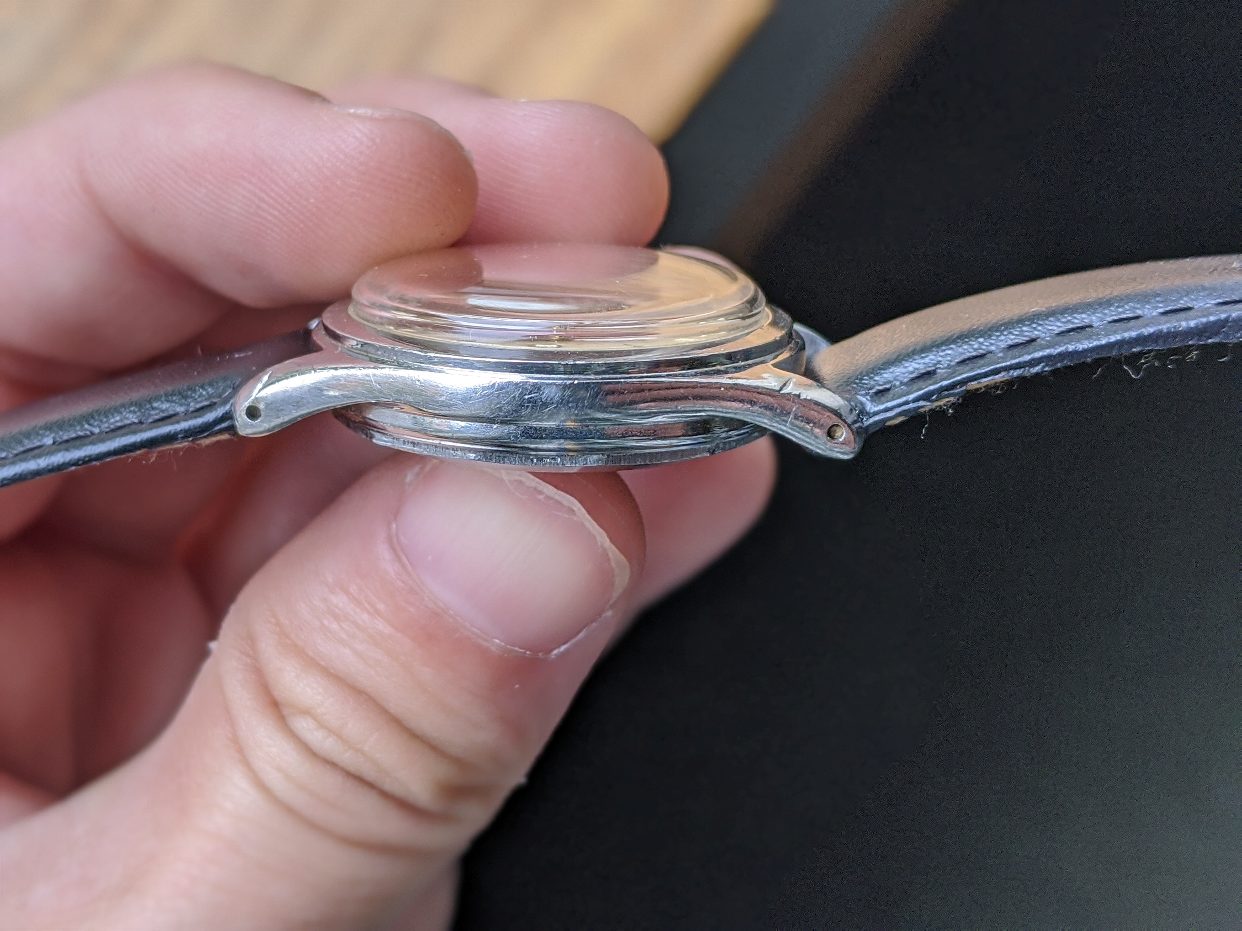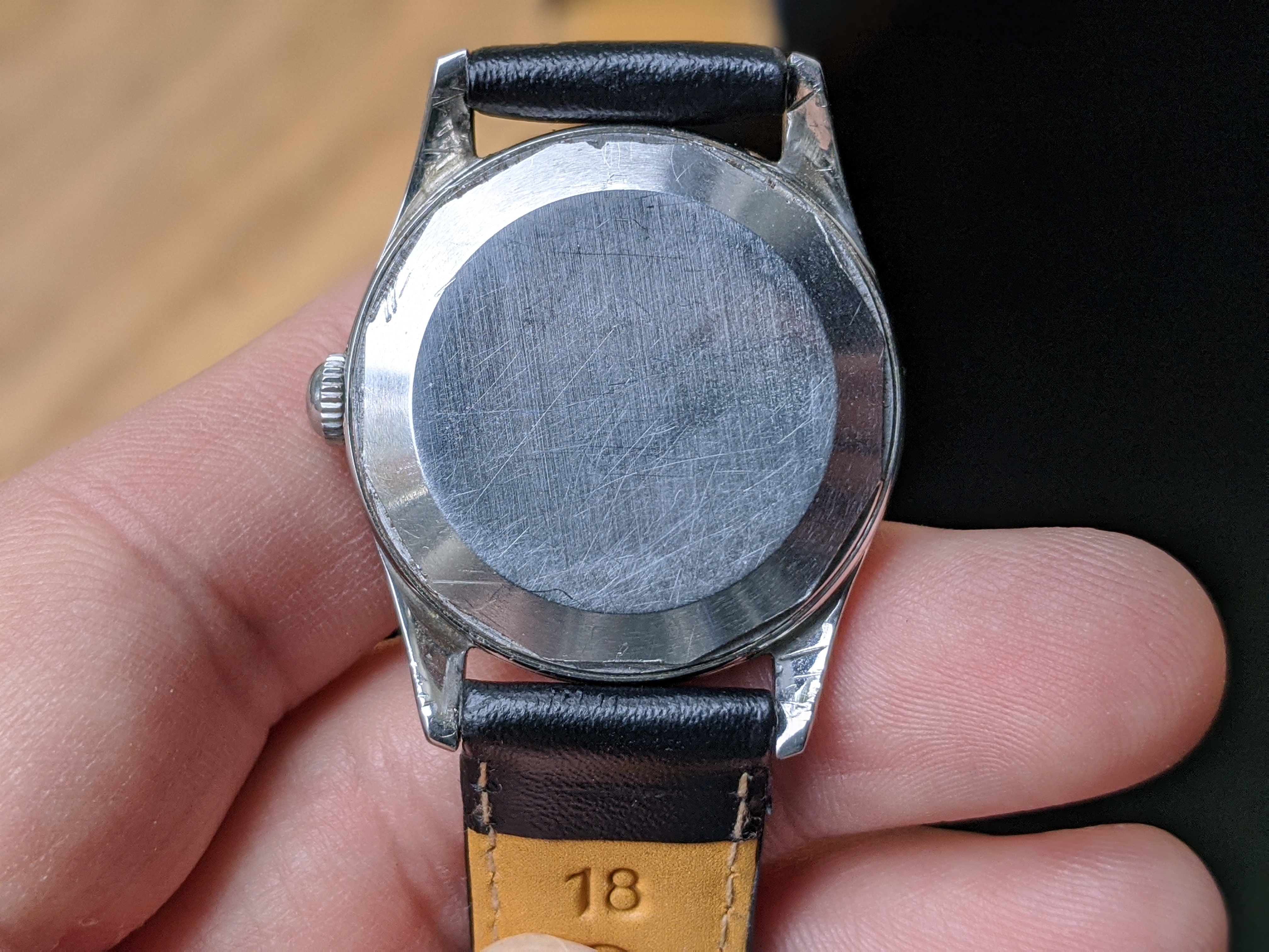 ·Here we have a 1950s steel Gubelin. The case measures 34mm, without the crown. The case back screws on, and the case is nice and thick. The watch appears all original, minus the 18mm strap. The dial has a nice spotted patina. It keeps great time, although I do not know the service history. I'm asking $300 or best offer. Returns allowed if grossly misrepresented. Please PM me with any inquiries. Thank you, Matt