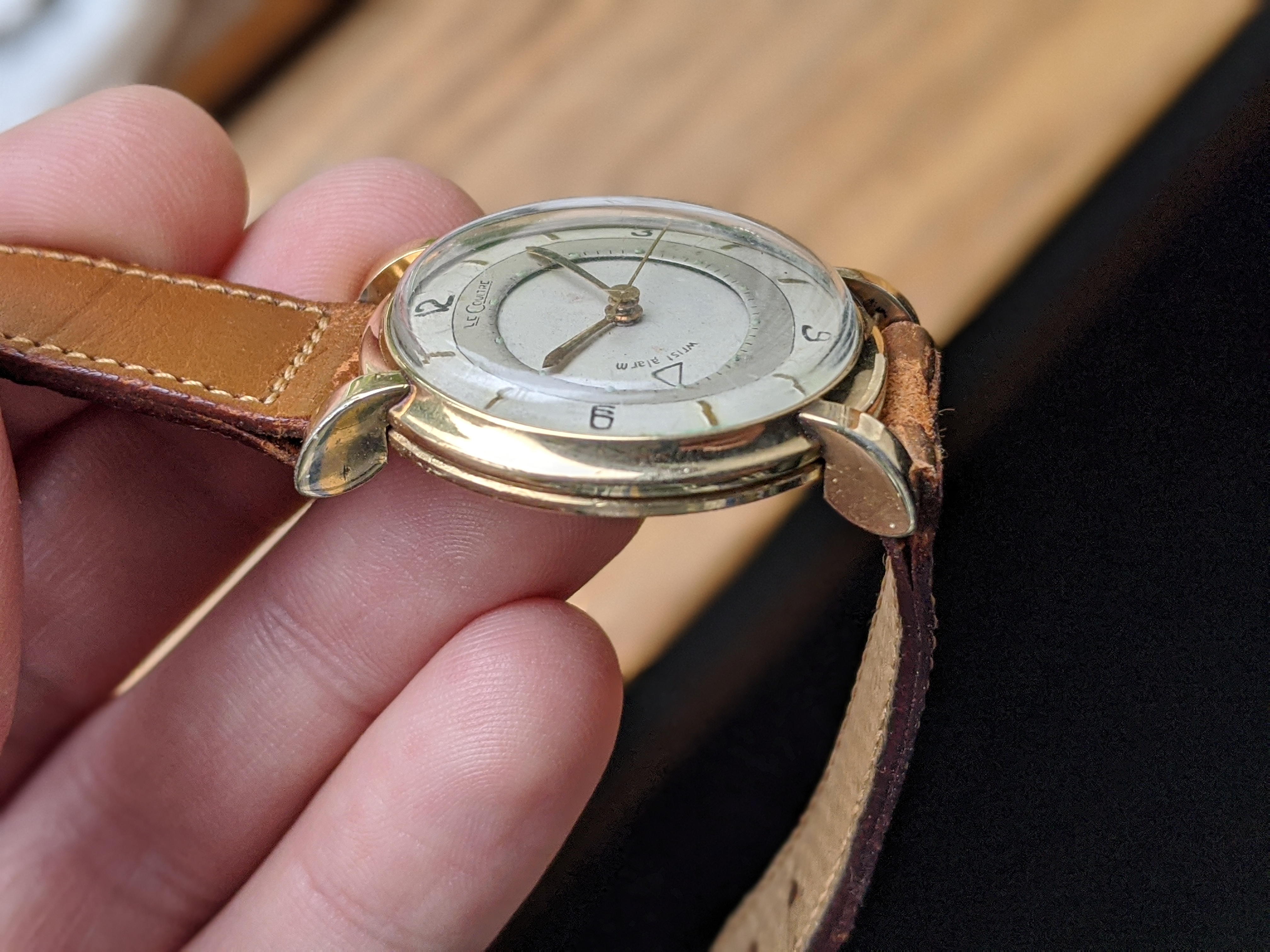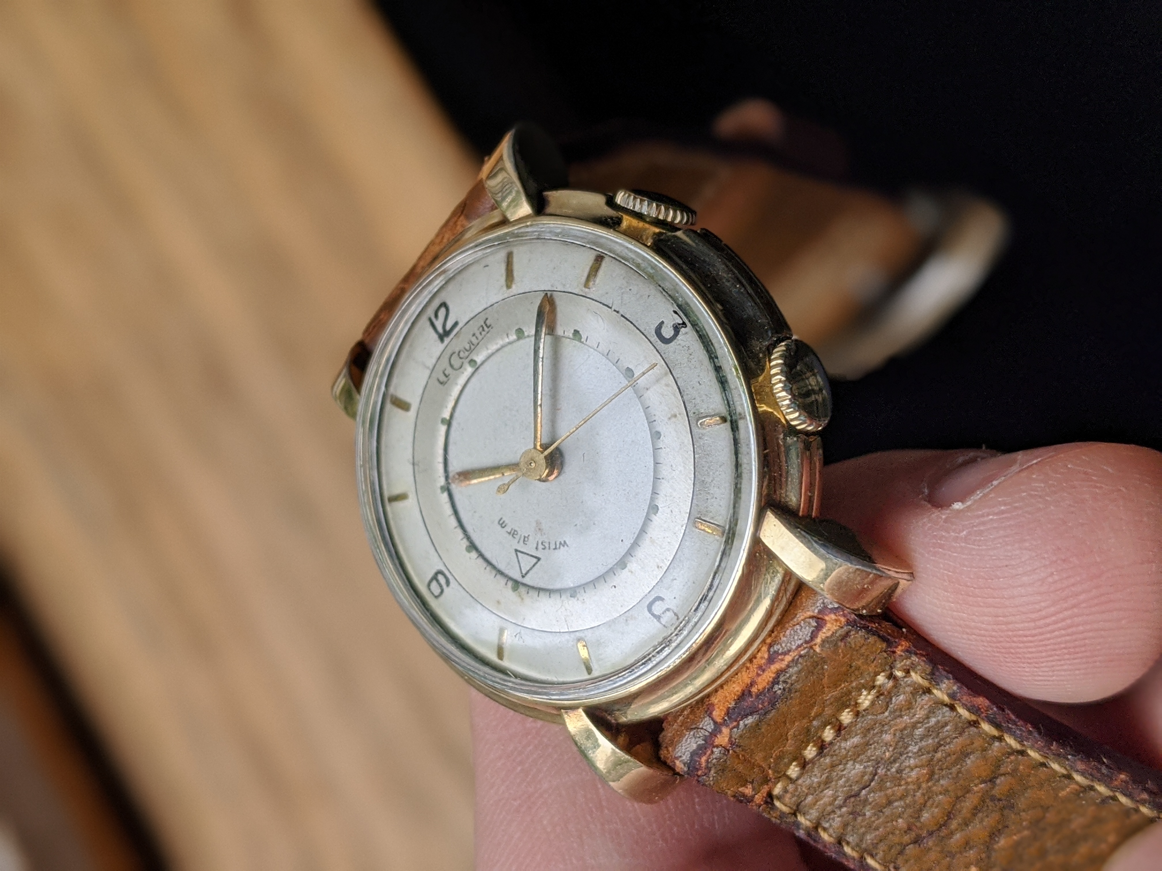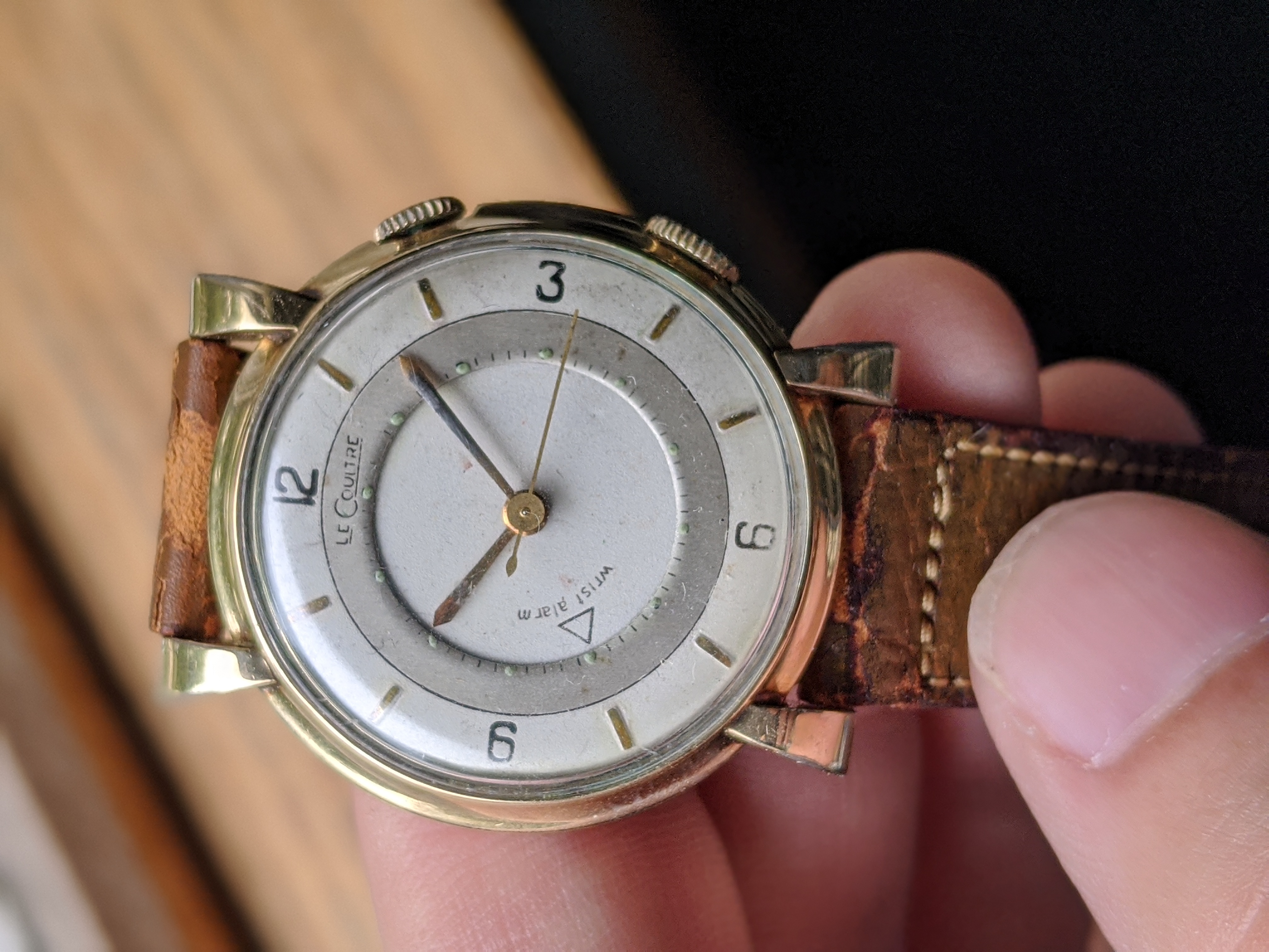 ·Here we have a 1950s Lecoultre Wrist Alarm. The watch was serviced late last year, so everything works great. The buzzing alarm is nice and loud. It appears original, dial, hands, crowns. The 10k gold filled case shows some wear, as you can see, but it's not bad for an almost 70 year old piece. Lug width is 16mm, case measures 32.25mm, not including the crown. Crystal is clean, probably newer. Case back snaps on. I'm asking $500 or best offer. Please PM me for inquiries. Returns only of grossly misrepresented.