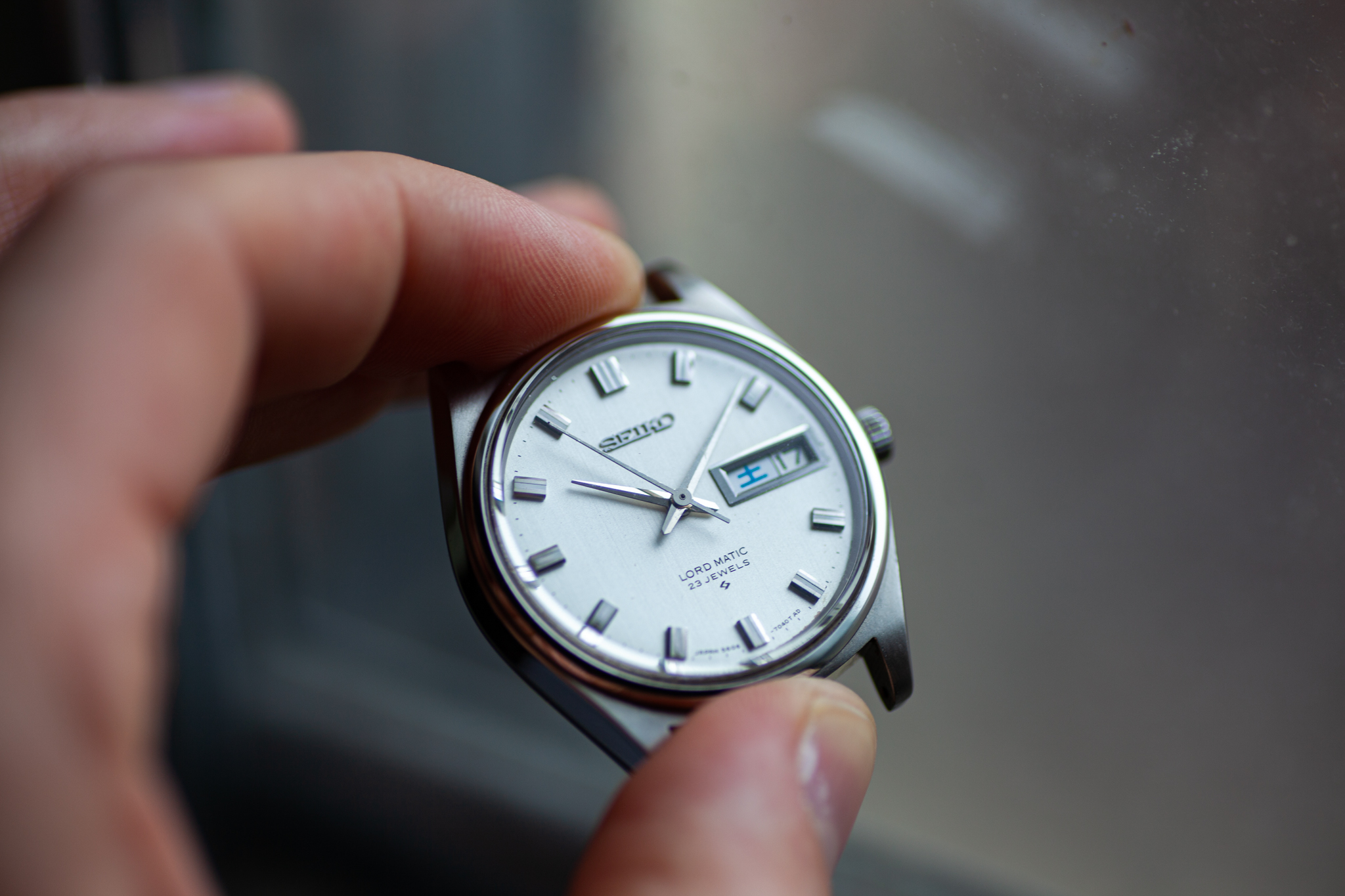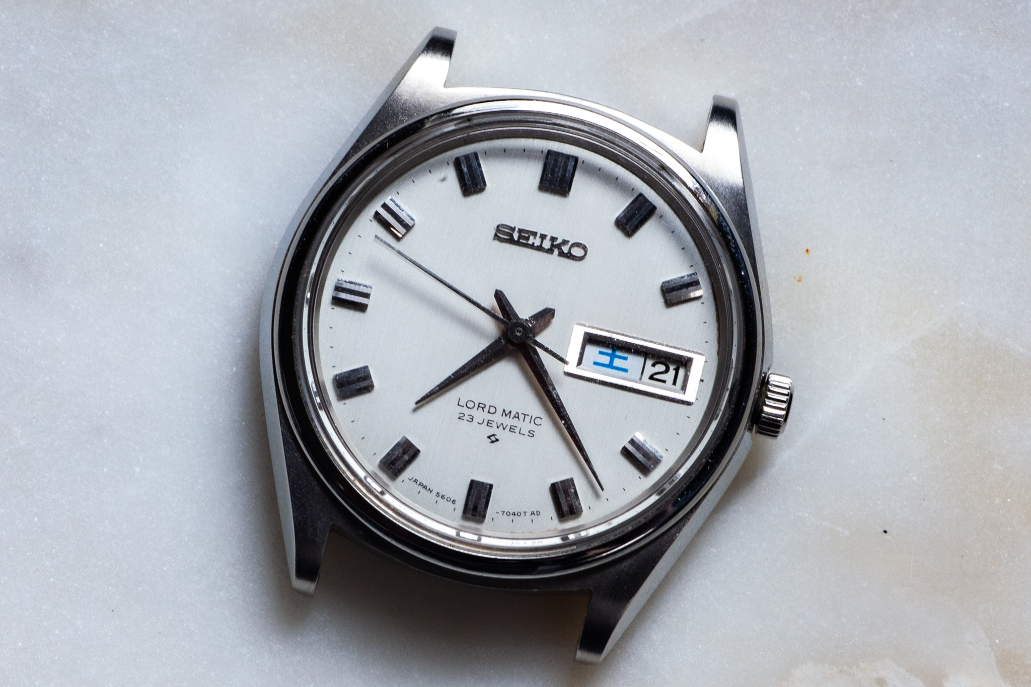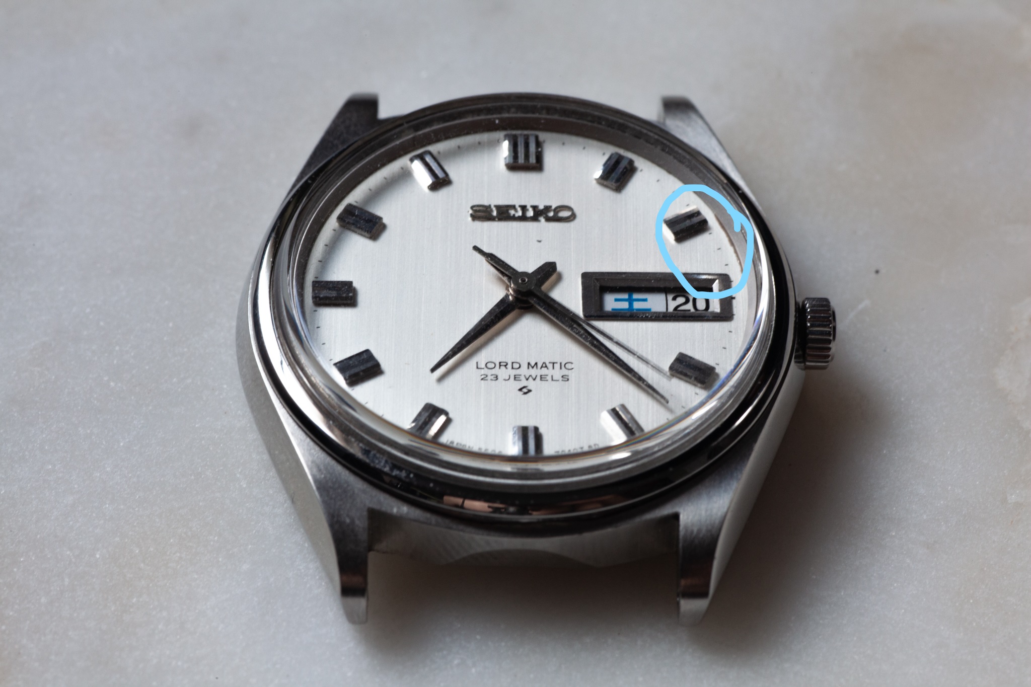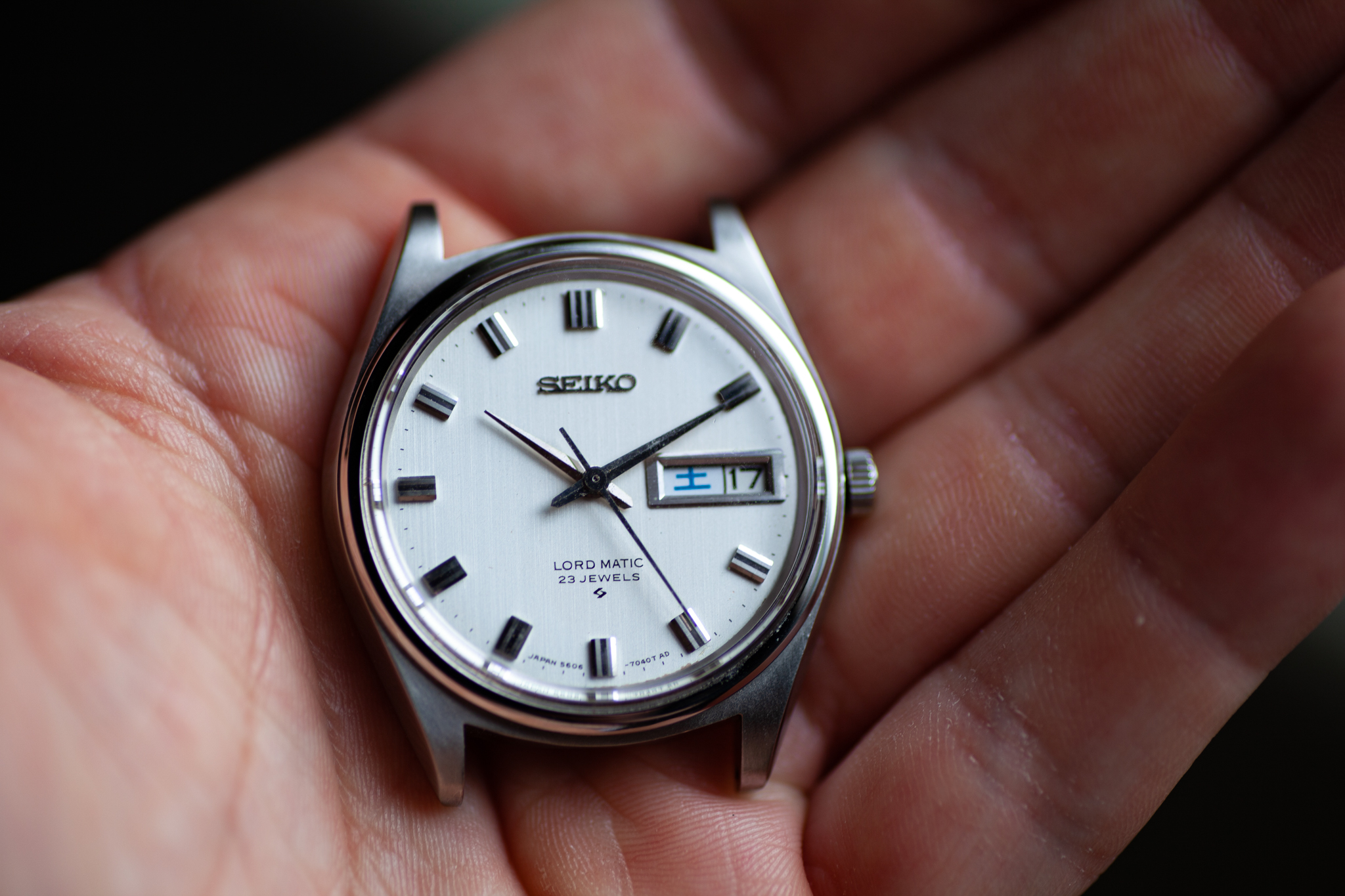 Dial - Beautiful, original brushed dial. In great condition. Day and date are displayed, day is displayed in dual languages (English and beautiful Kanji figures as pictured below, blue for Saturday and red for Sunday). Quickset works! The date wheels on these models are notorious for breaking and being non-functional, this one flips over crisply as pictured below. I’m no expert Seiko collector but my understanding is that they are very hard to find with a functional date wheel since the gear used for the quickset is made of plastic and would frequently break. There is a very small area along the edge of the dial with some brown discoloration (highlighted in second picture). It’s really only visible using the macro lens. I actually hadn’t noticed this until taking the pictures for the sale, not noticeable with regular wear.