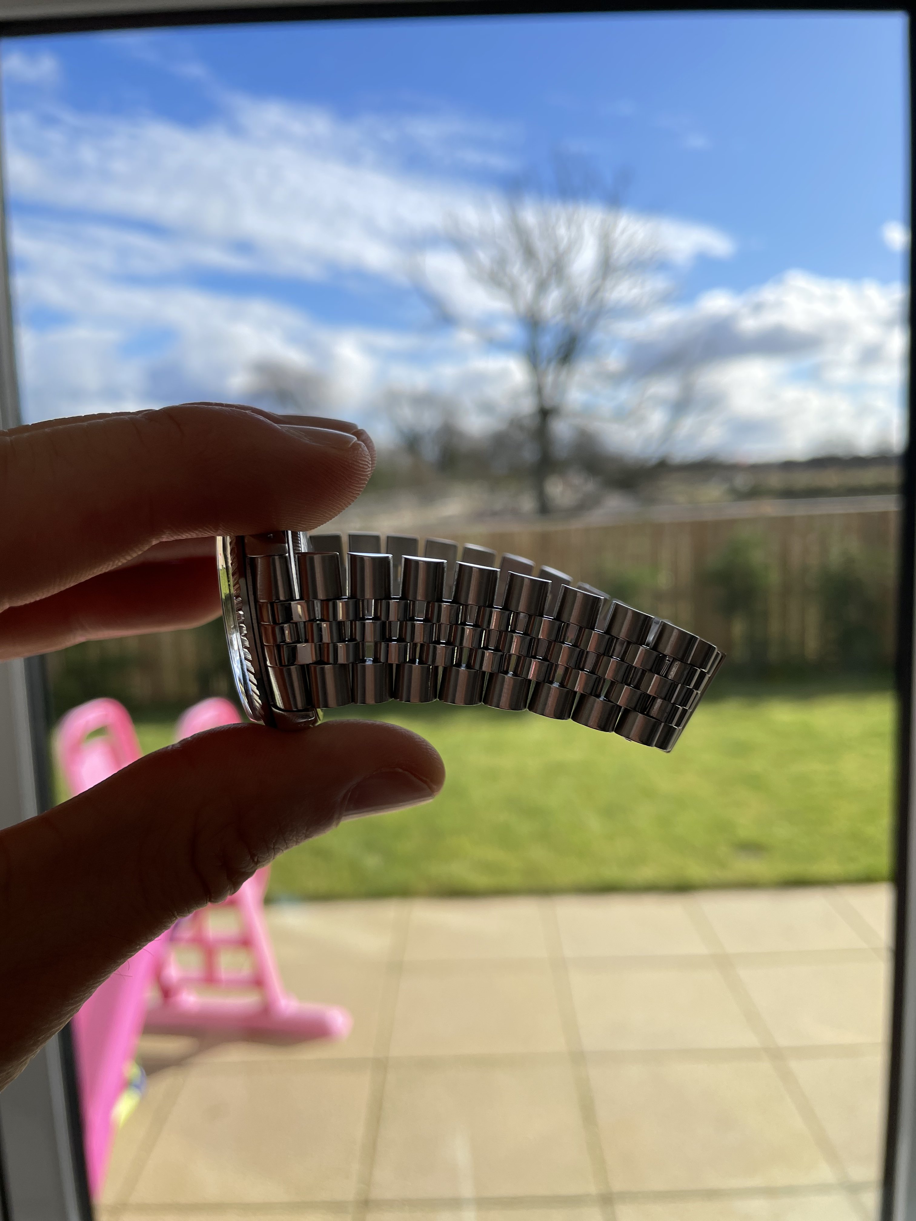 The bracelet is full length with no additional links. It’s huge so I expect it to fit most wrists. As you can see from the picture, the bracelet has some minimal stretch but has many years of life left. Rolex didn’t want to replace it so that speaks for itself really.