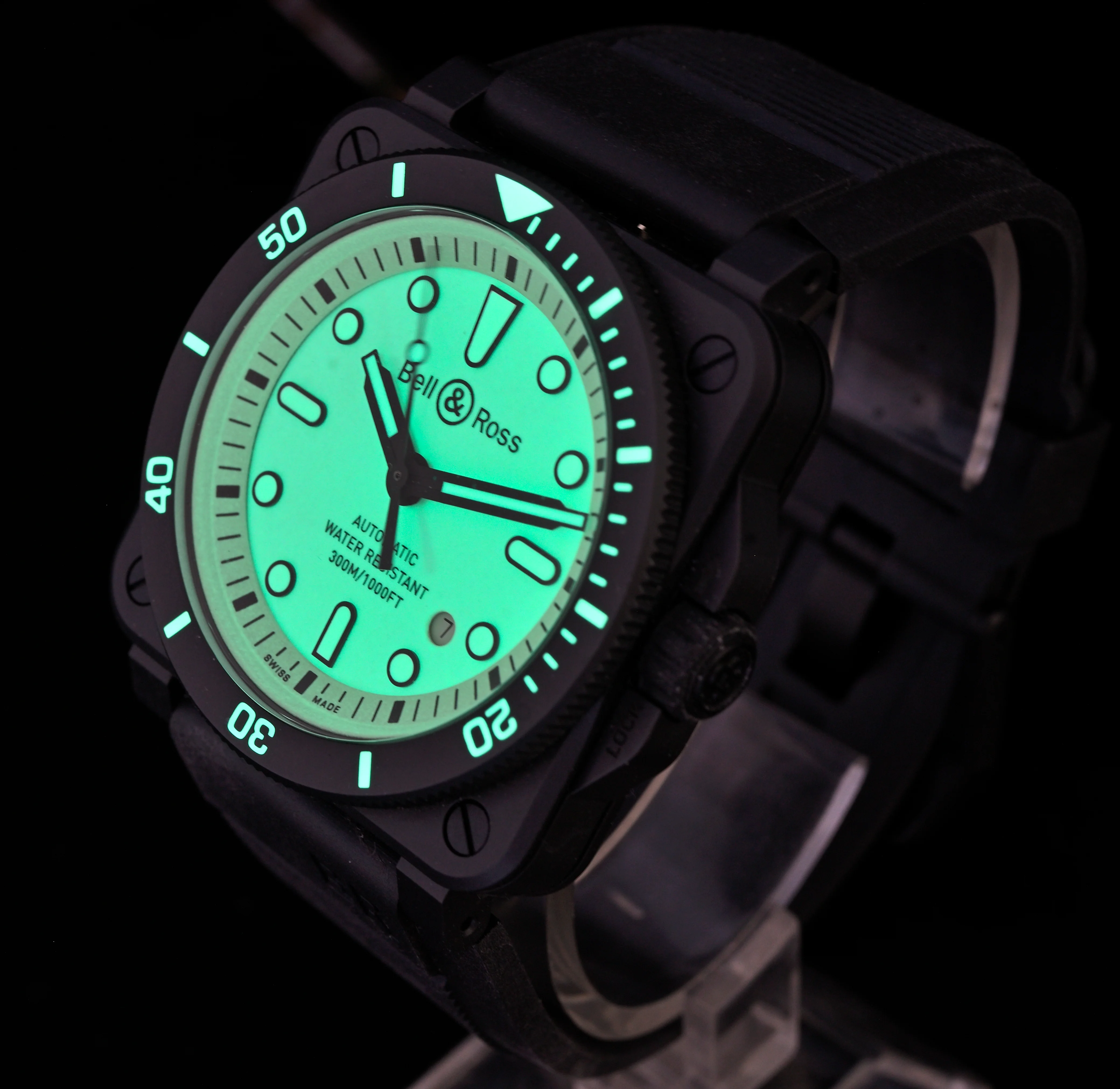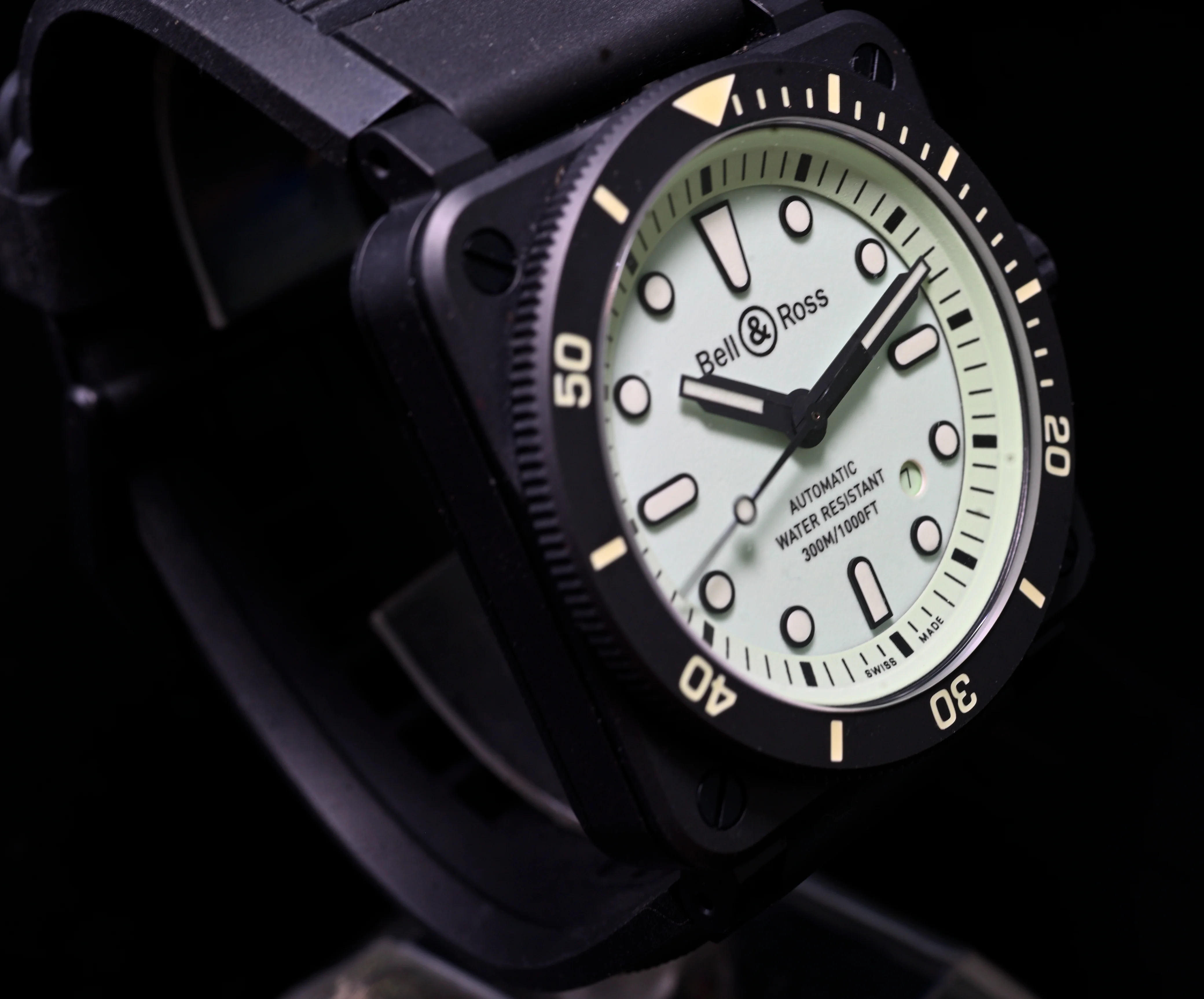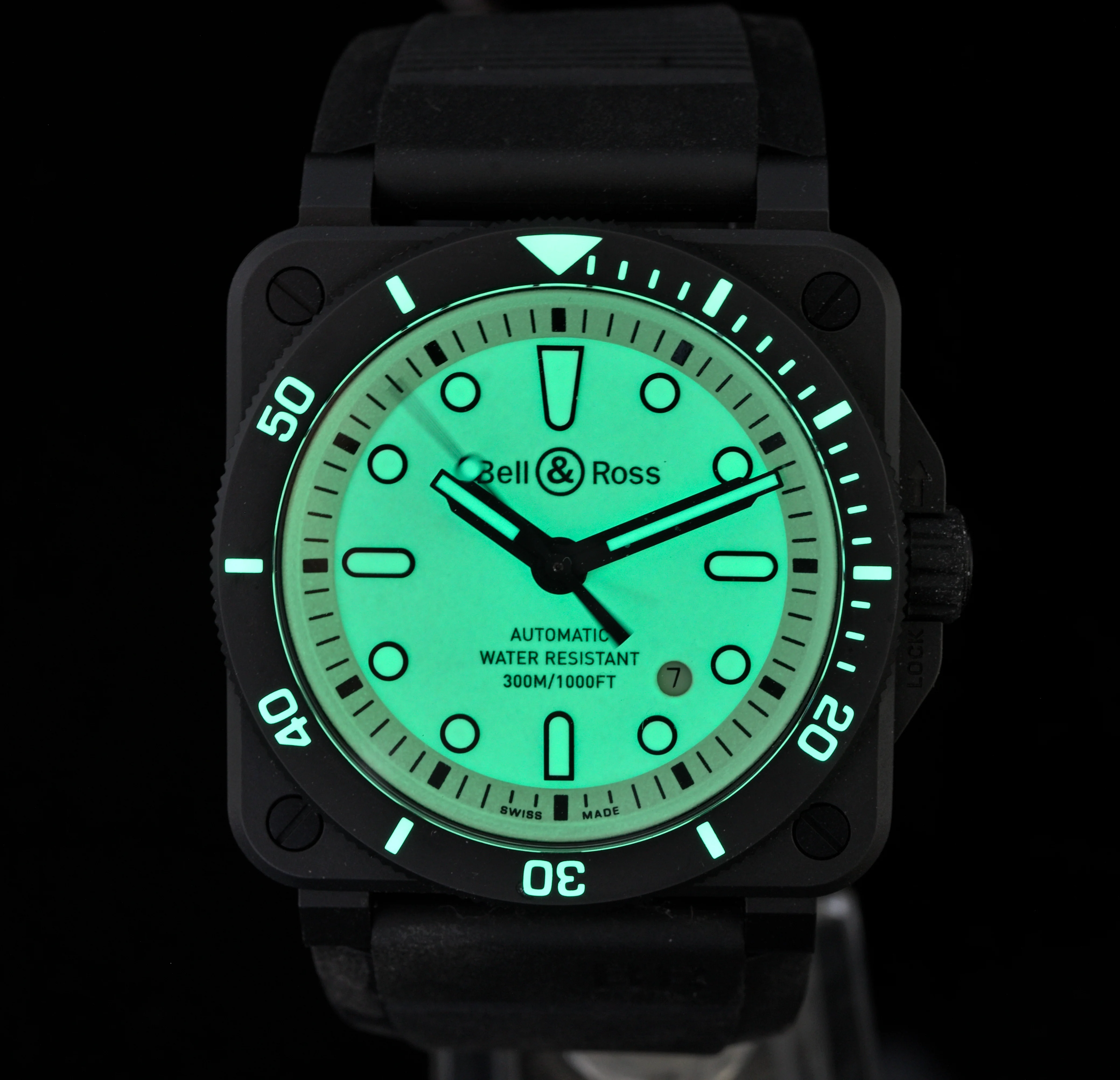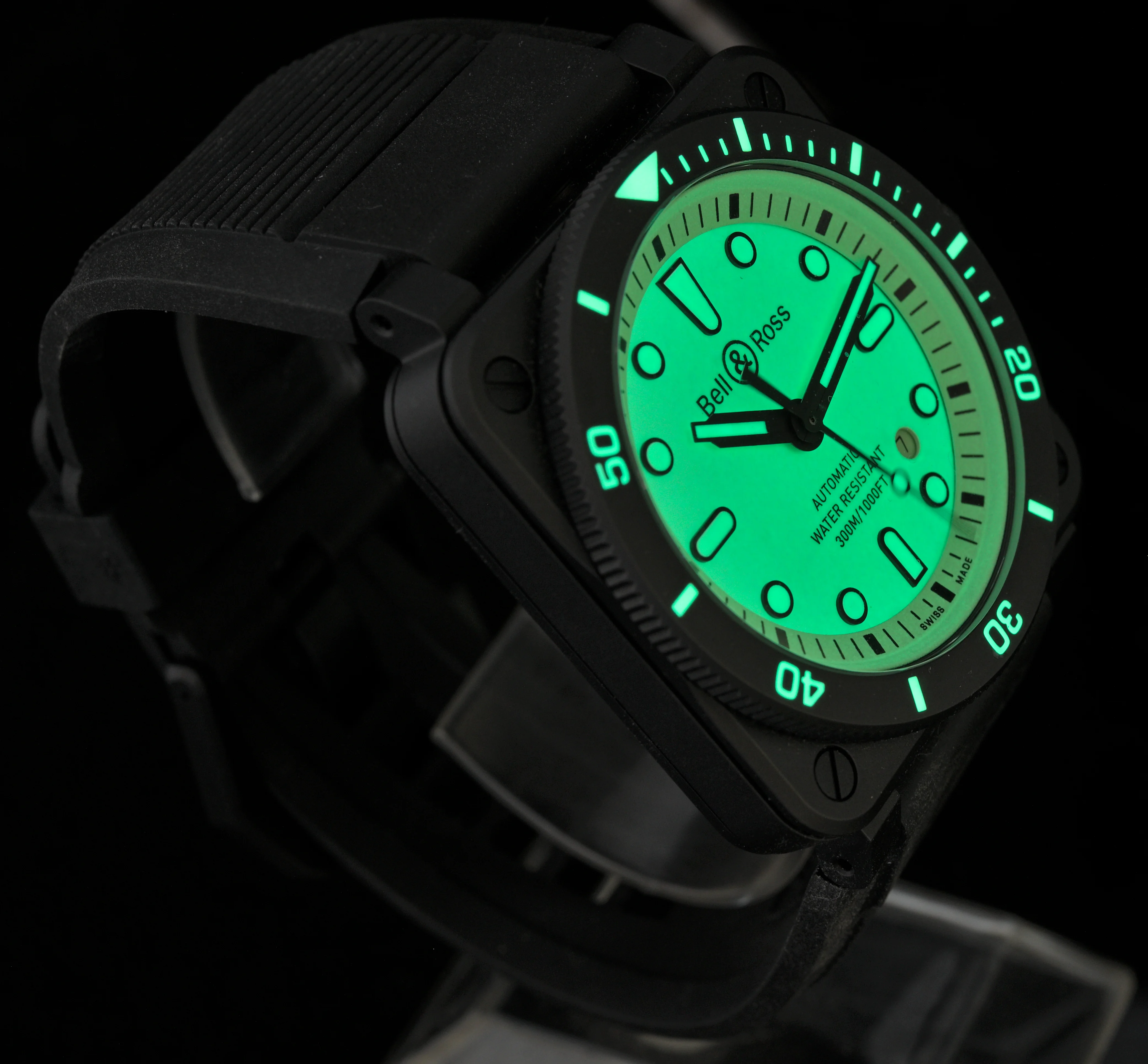 The BR03 Diver Full Lum is designed to demonstrate the power of luminescence, offering a fully illuminated dial, along with hands, indices and bezel markings with green SuperLumiova that cut through the deepest darkness. The BR03 Diver line of diving watches are the first square diving watches that meets the international standards governing the designation "diving watch". The BR03 Diver Full Lum is a limited edition of 999.