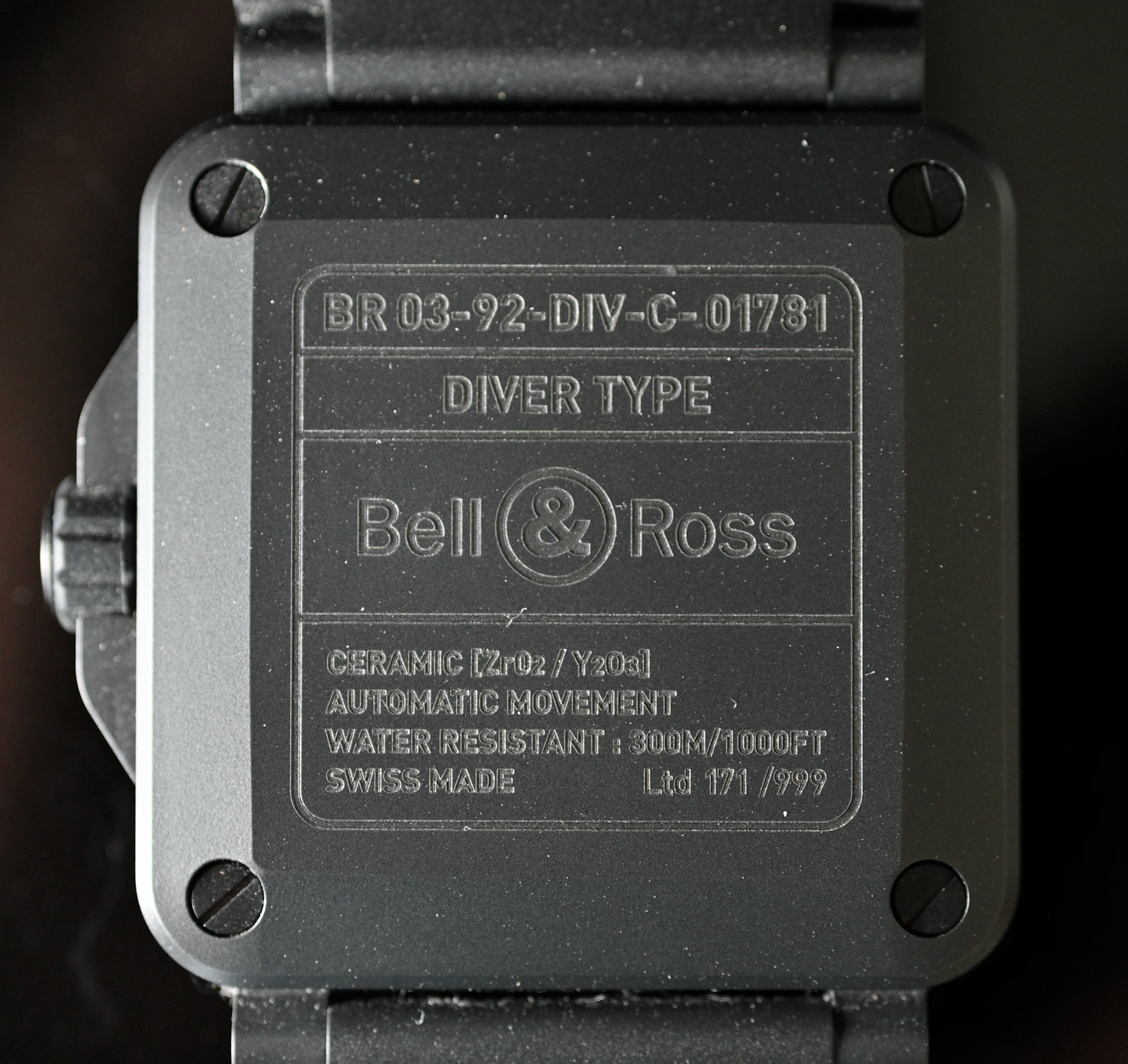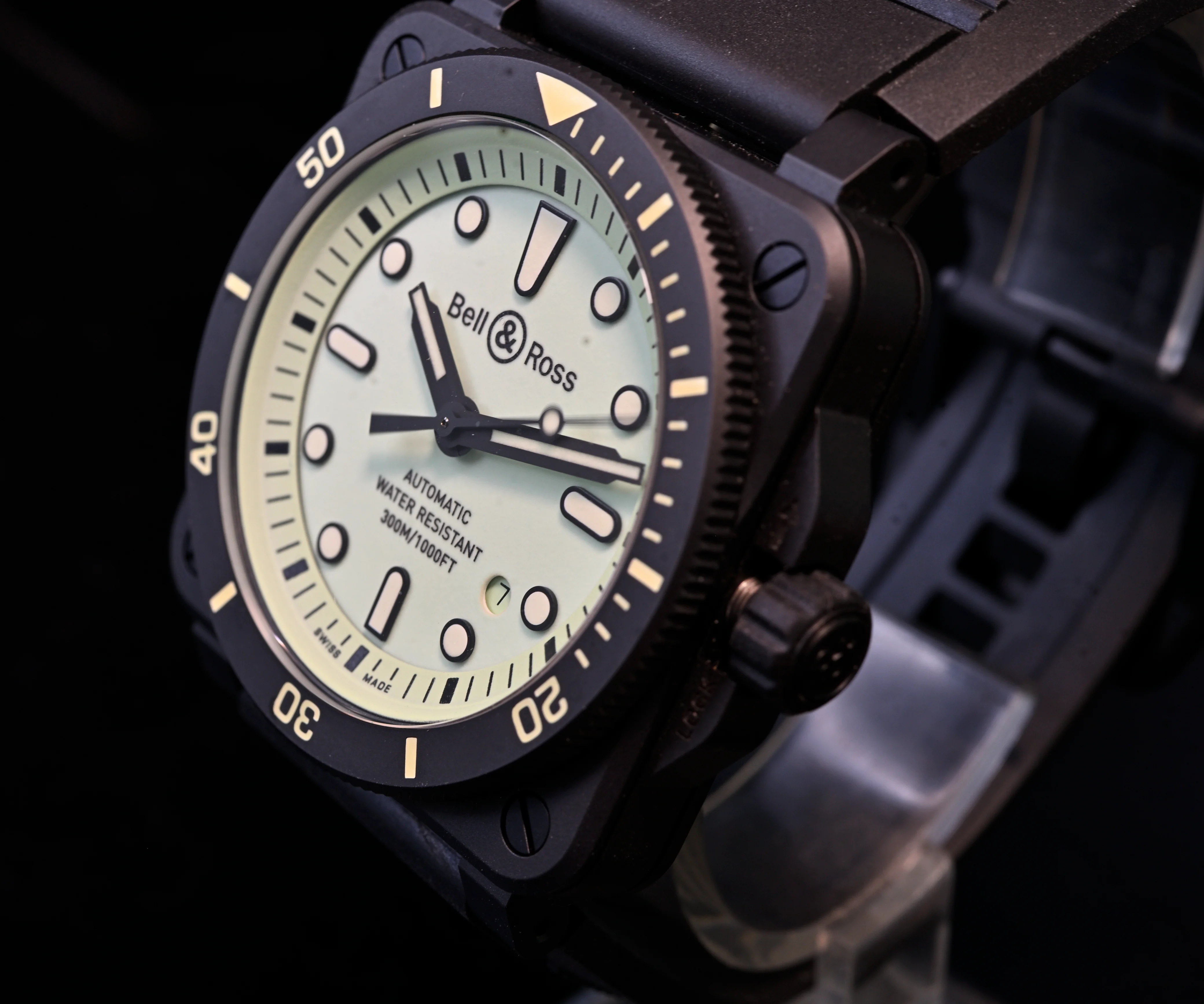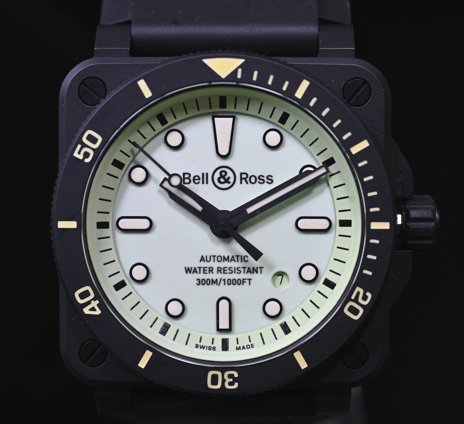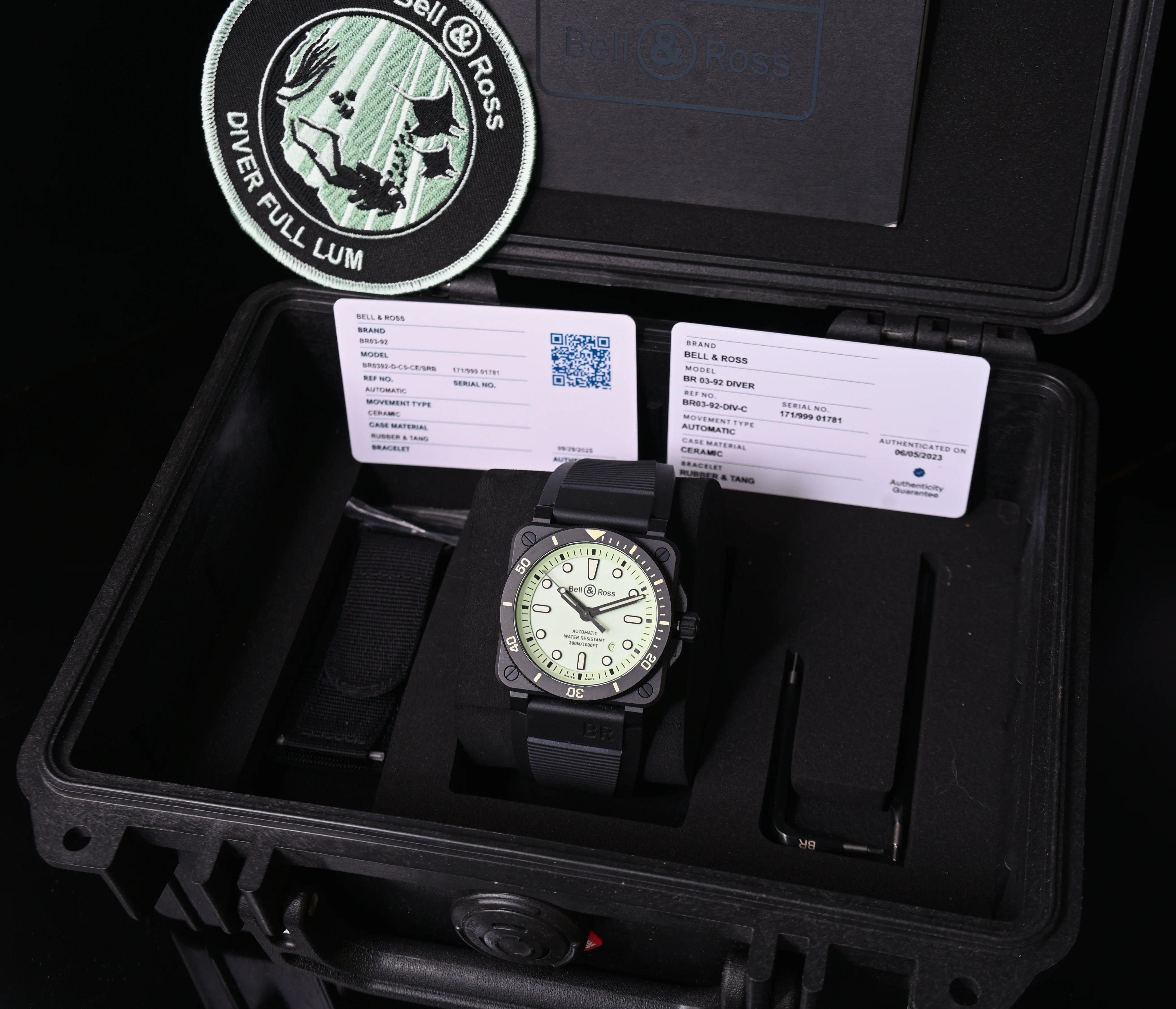 The BR03 Diver Full Lum is designed to demonstrate the power of luminescence, offering a fully illuminated dial, along with hands, indices and bezel markings with green SuperLumiova that cut through the deepest darkness. The BR03 Diver line of diving watches are the first square diving watches that meets the international standards governing the designation "diving watch". The BR03 Diver Full Lum is a limited edition of 999.