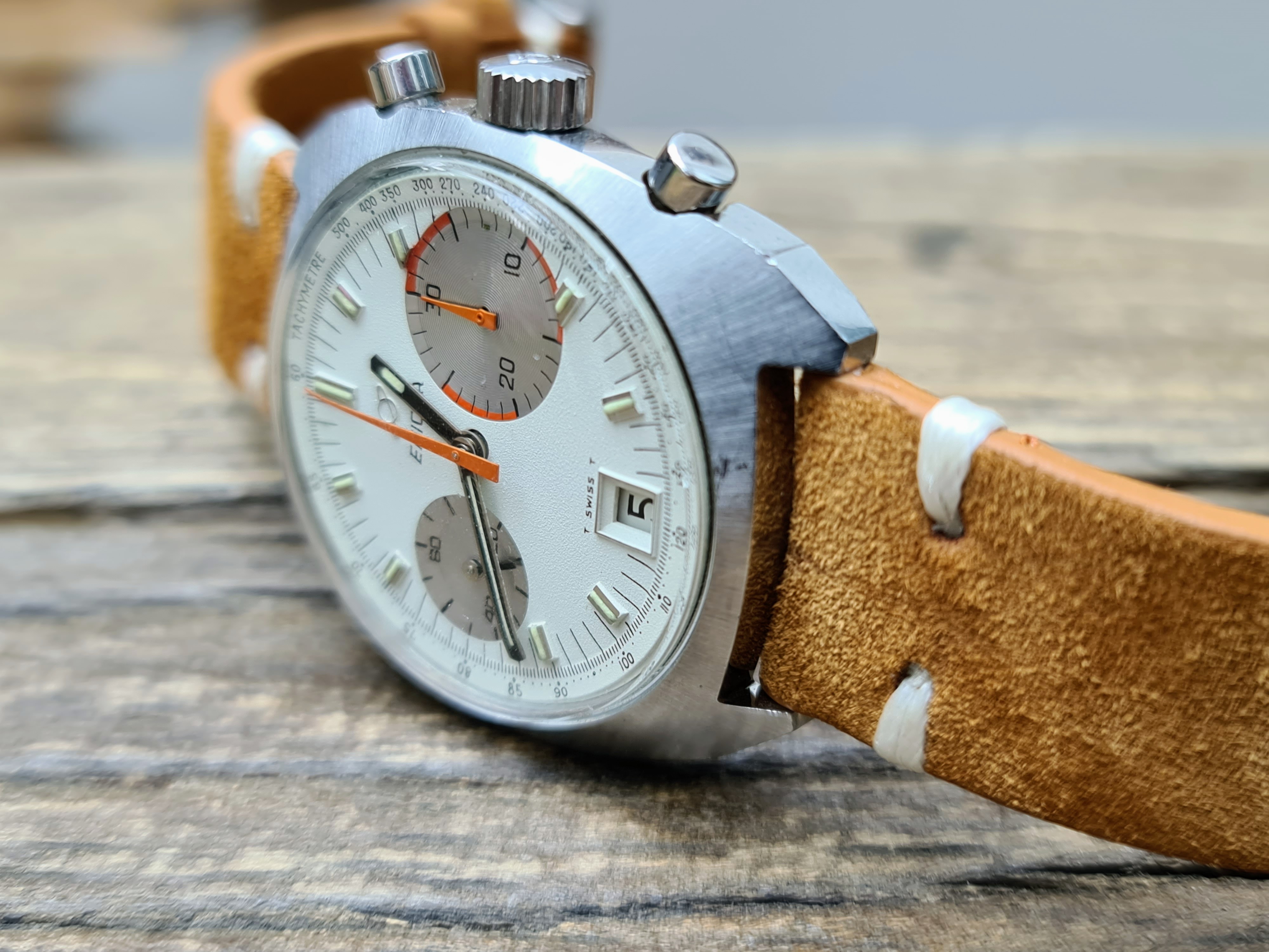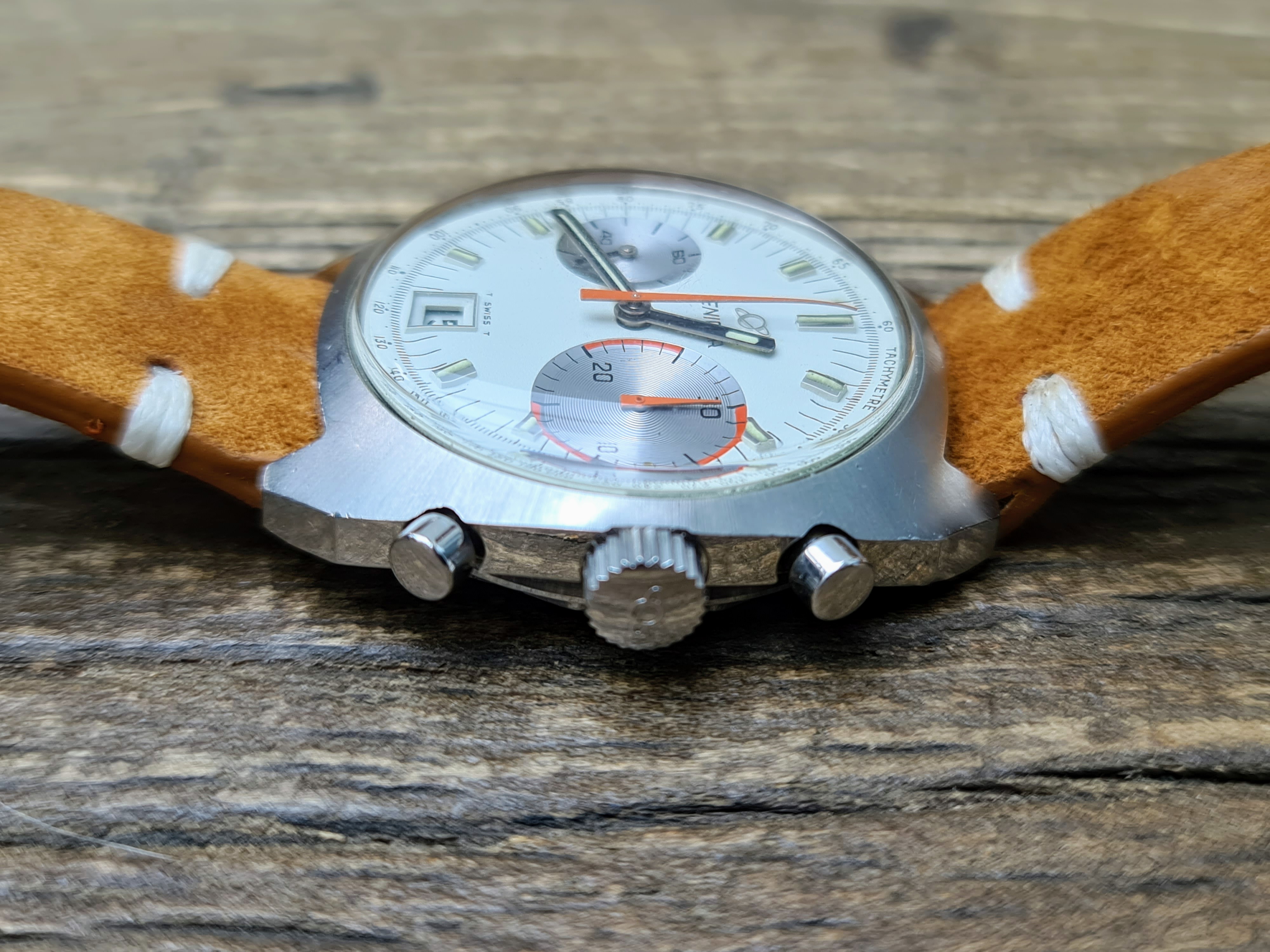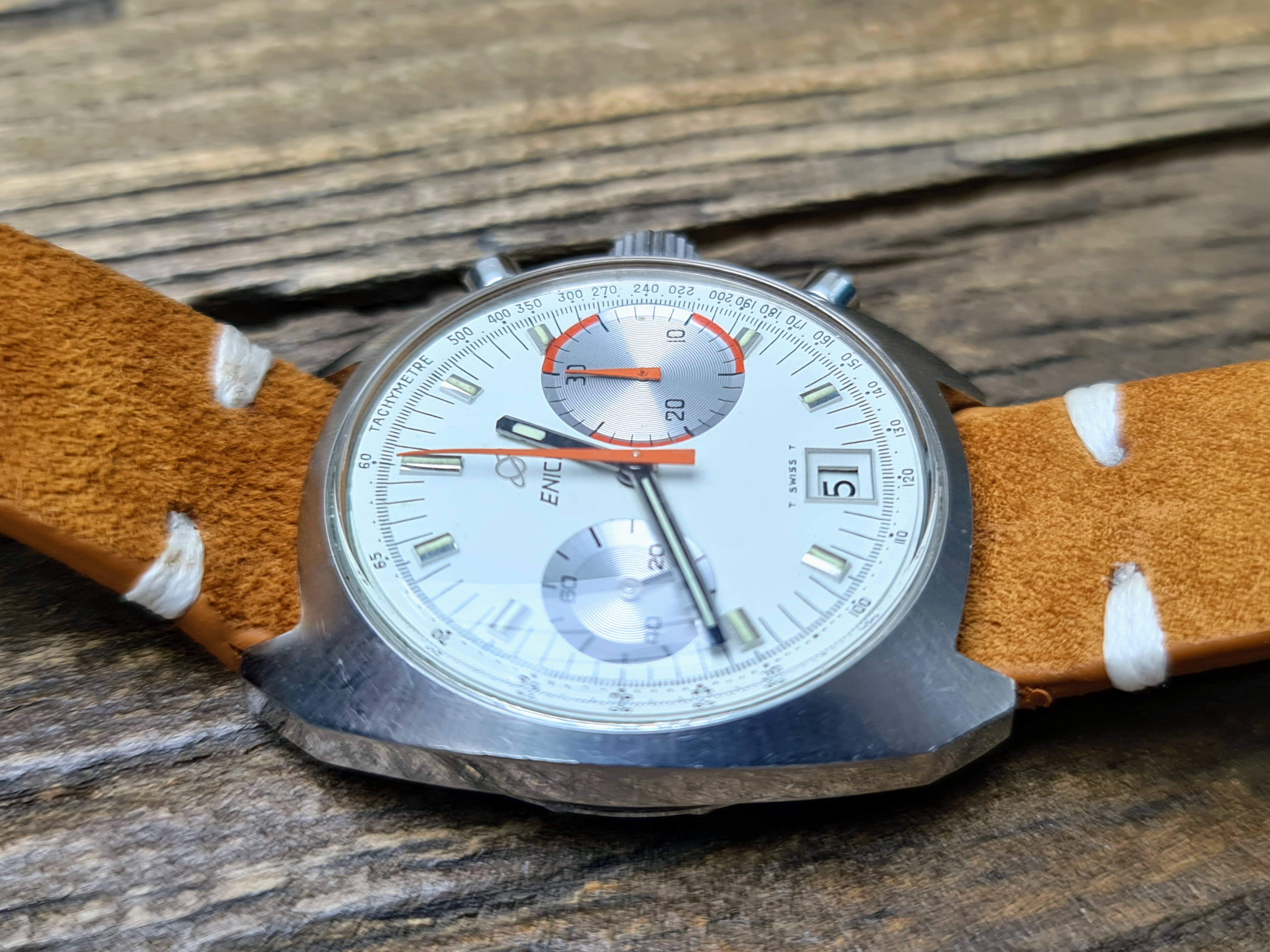 I've had a bit of a splurge lately, so will be listing a few nice Enicars. Up for sale is my lovely condition Big Eye 'Albino' Chronograph. Packs a Valjoux 234 inside. In very nice all round condition and keeping very good time. Chrono runs and resets crisply. Case has a couple of marks near the lugs which I assume is from strap changing. I've tried to catch these in the worst light, so they don't actually appear that bad in real life. A few other marks commensurate with wear and age but in very good overall condition still. It's the brushed case rather than the polished version.