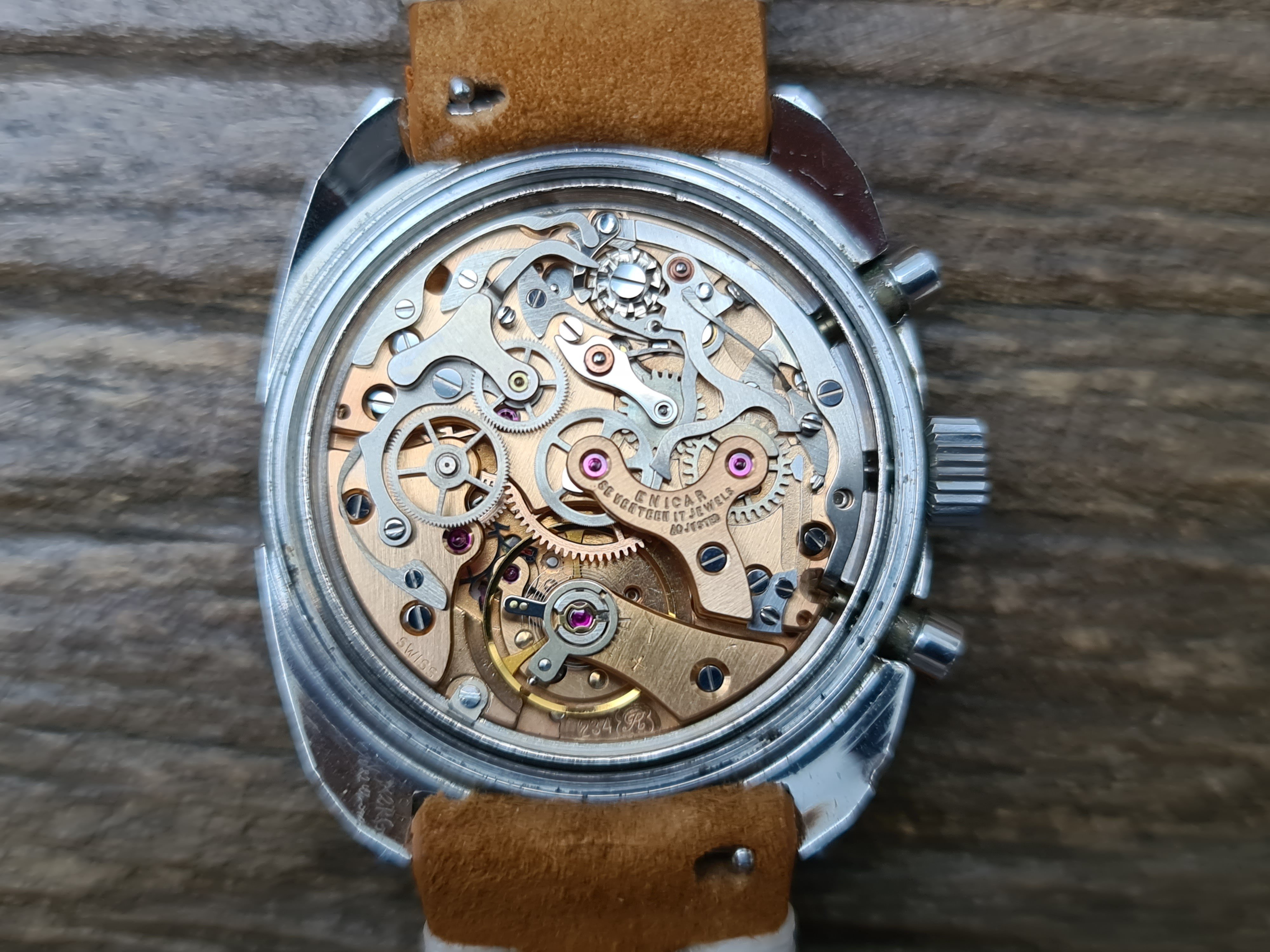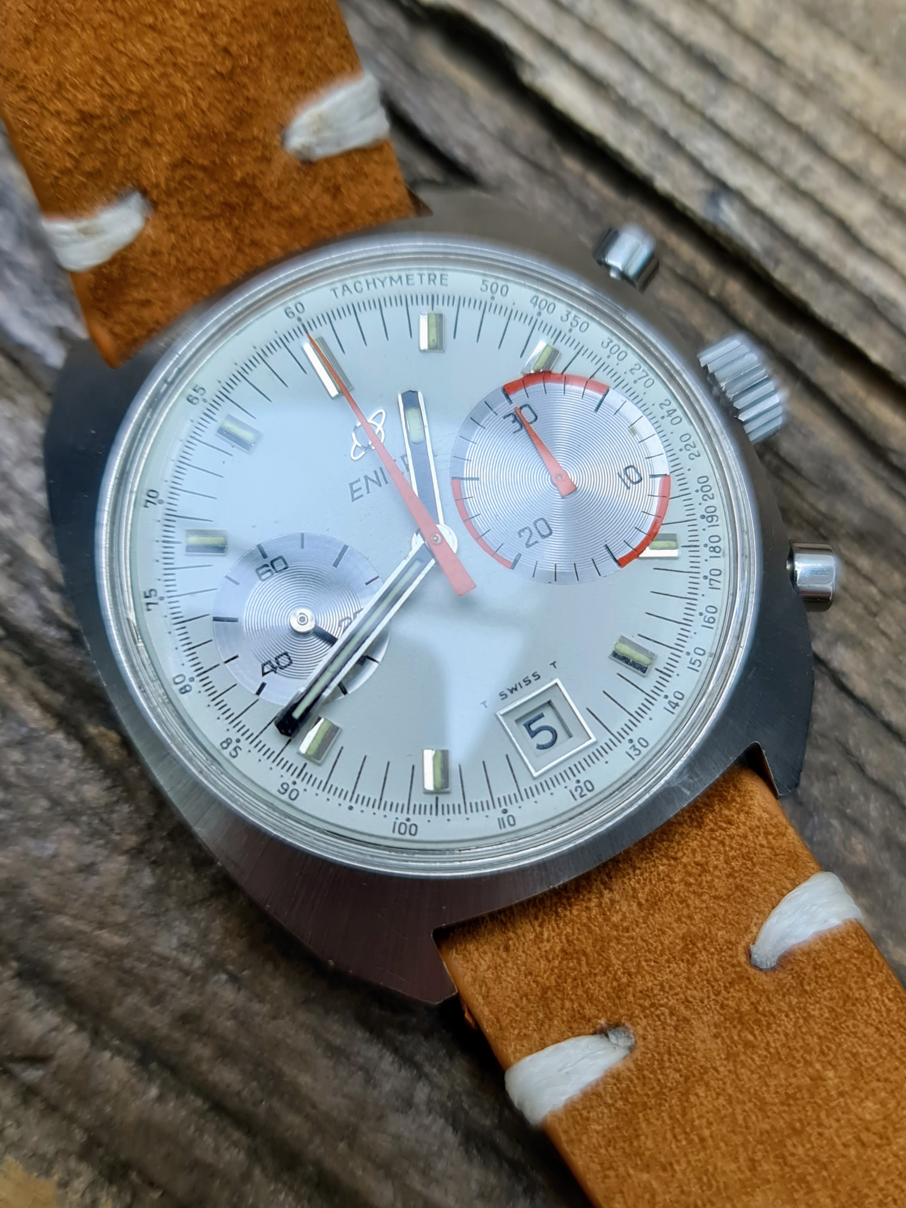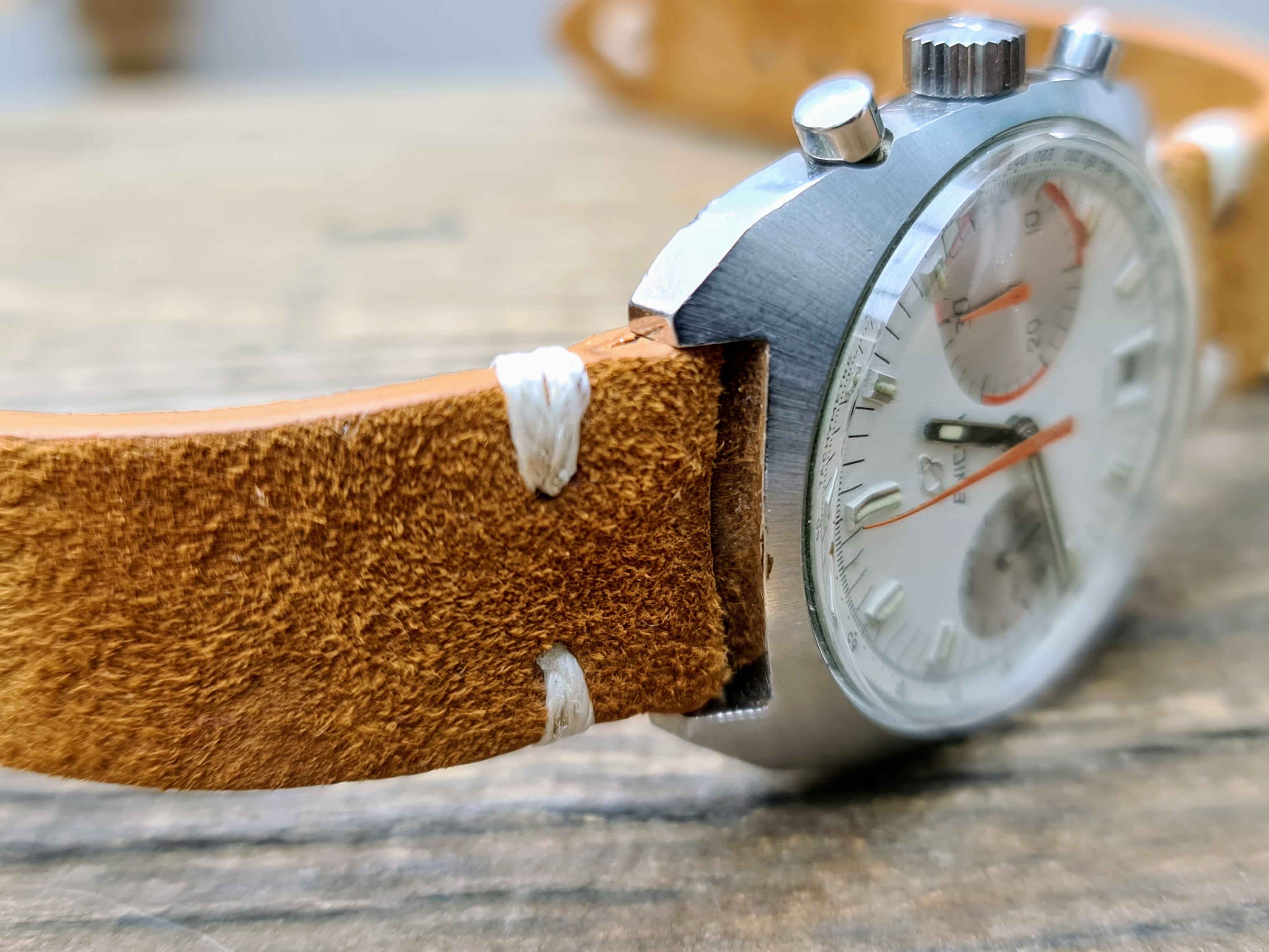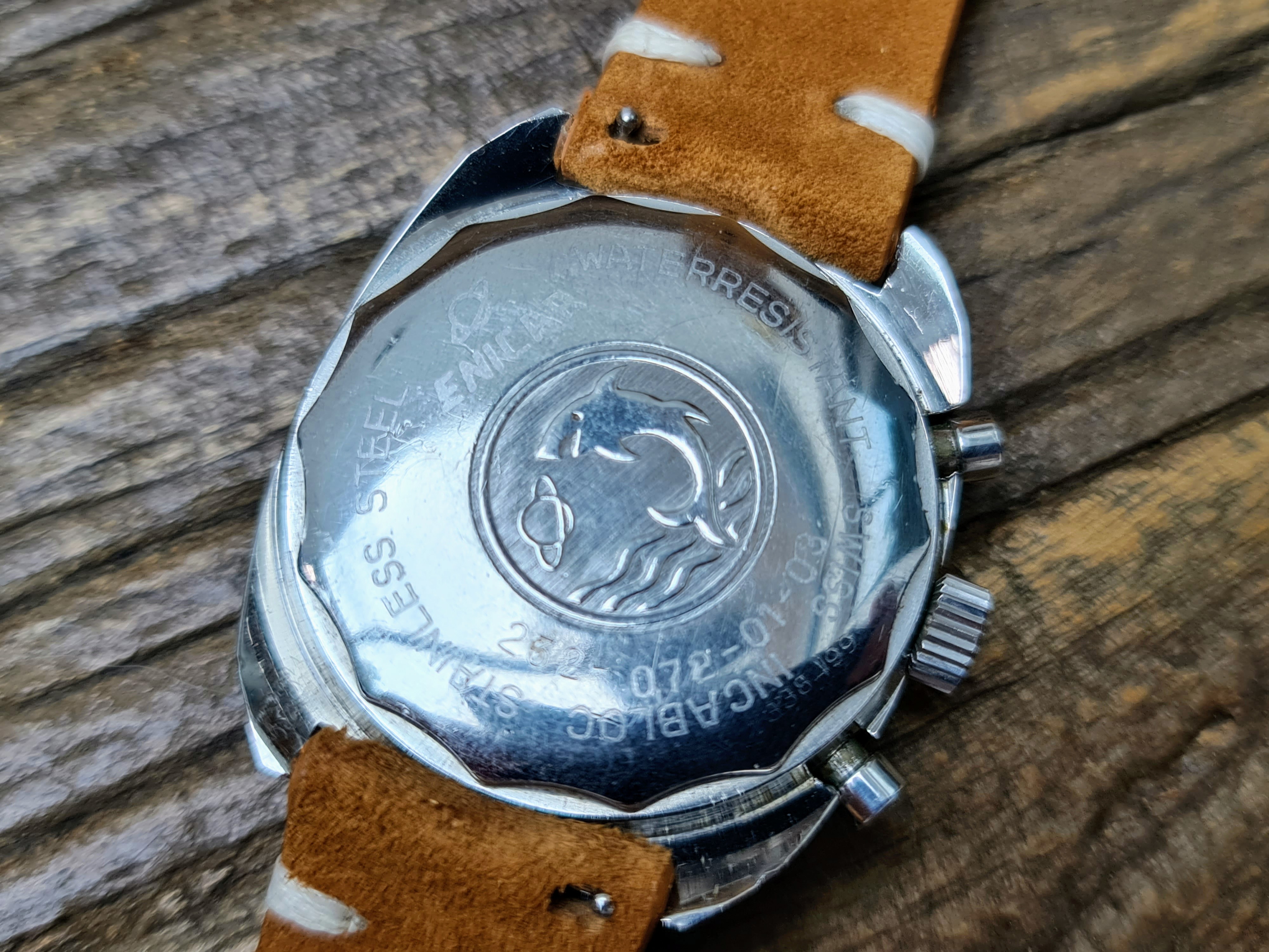 I've had a bit of a splurge lately, so will be listing a few nice Enicars. Up for sale is my lovely condition Big Eye 'Albino' Chronograph. Packs a Valjoux 234 inside. In very nice all round condition and keeping very good time. Chrono runs and resets crisply. Case has a couple of marks near the lugs which I assume is from strap changing. I've tried to catch these in the worst light, so they don't actually appear that bad in real life. A few other marks commensurate with wear and age but in very good overall condition still. It's the brushed case rather than the polished version.