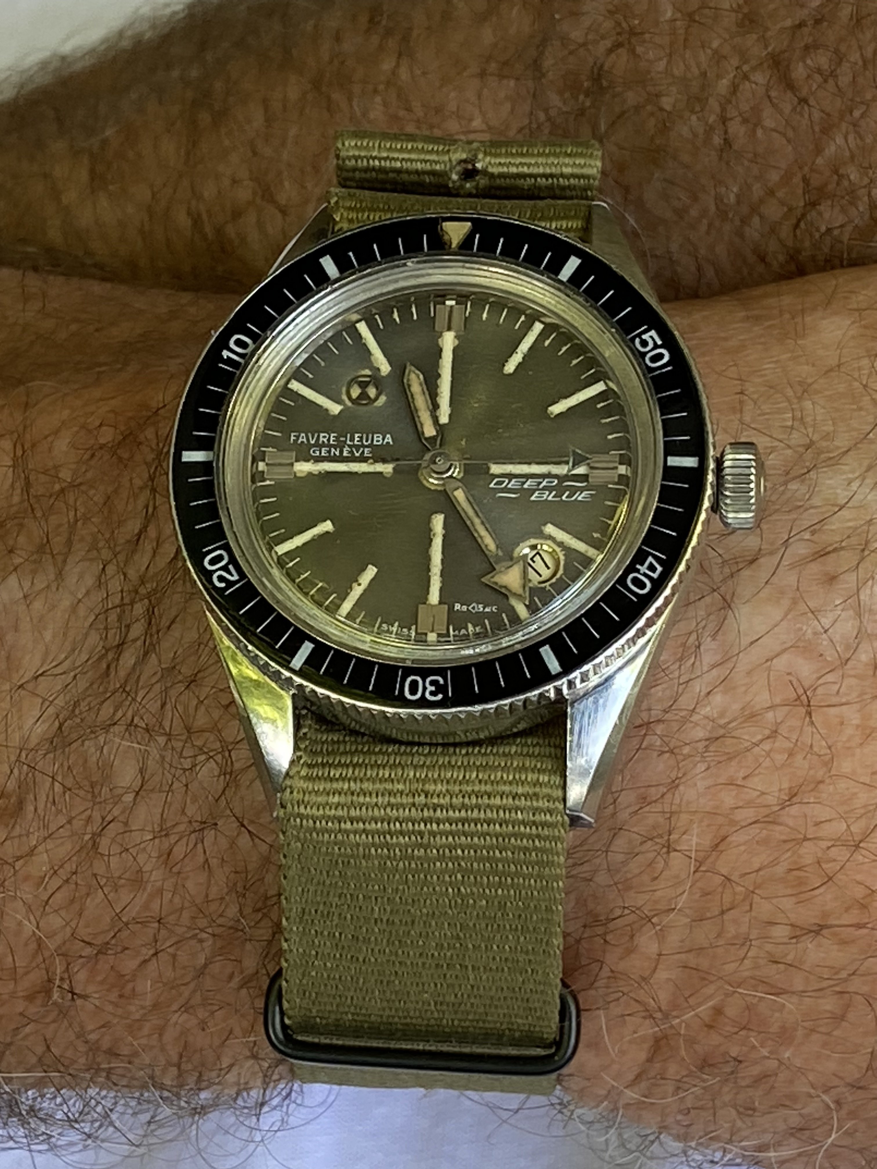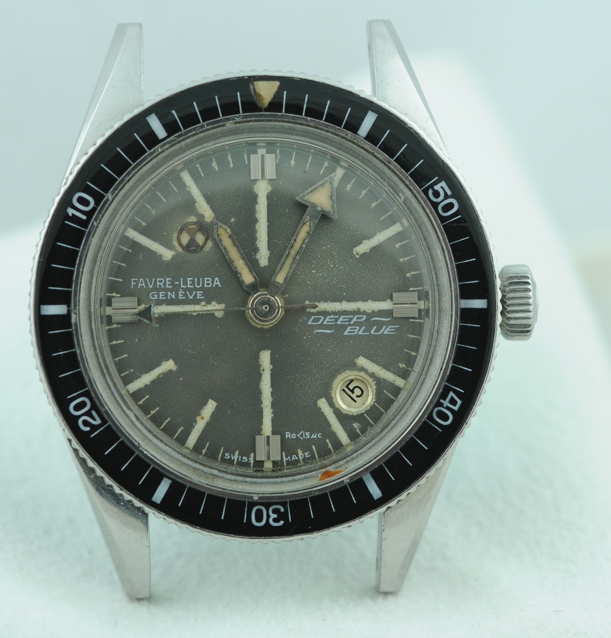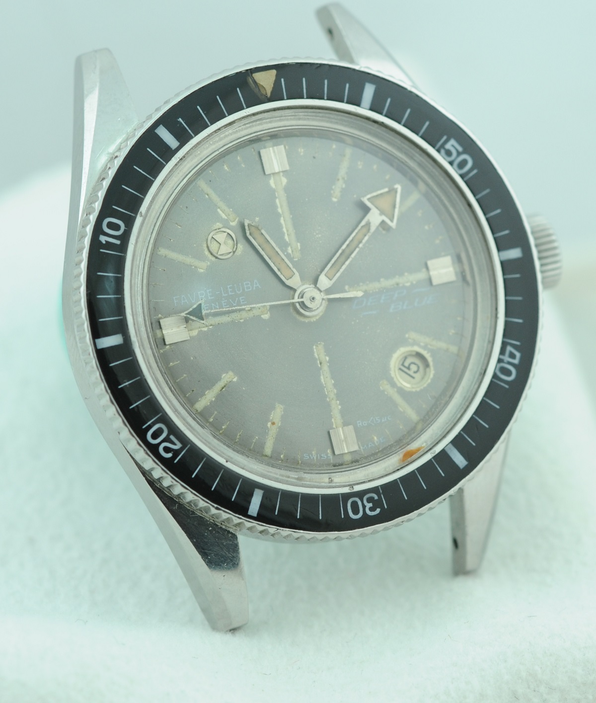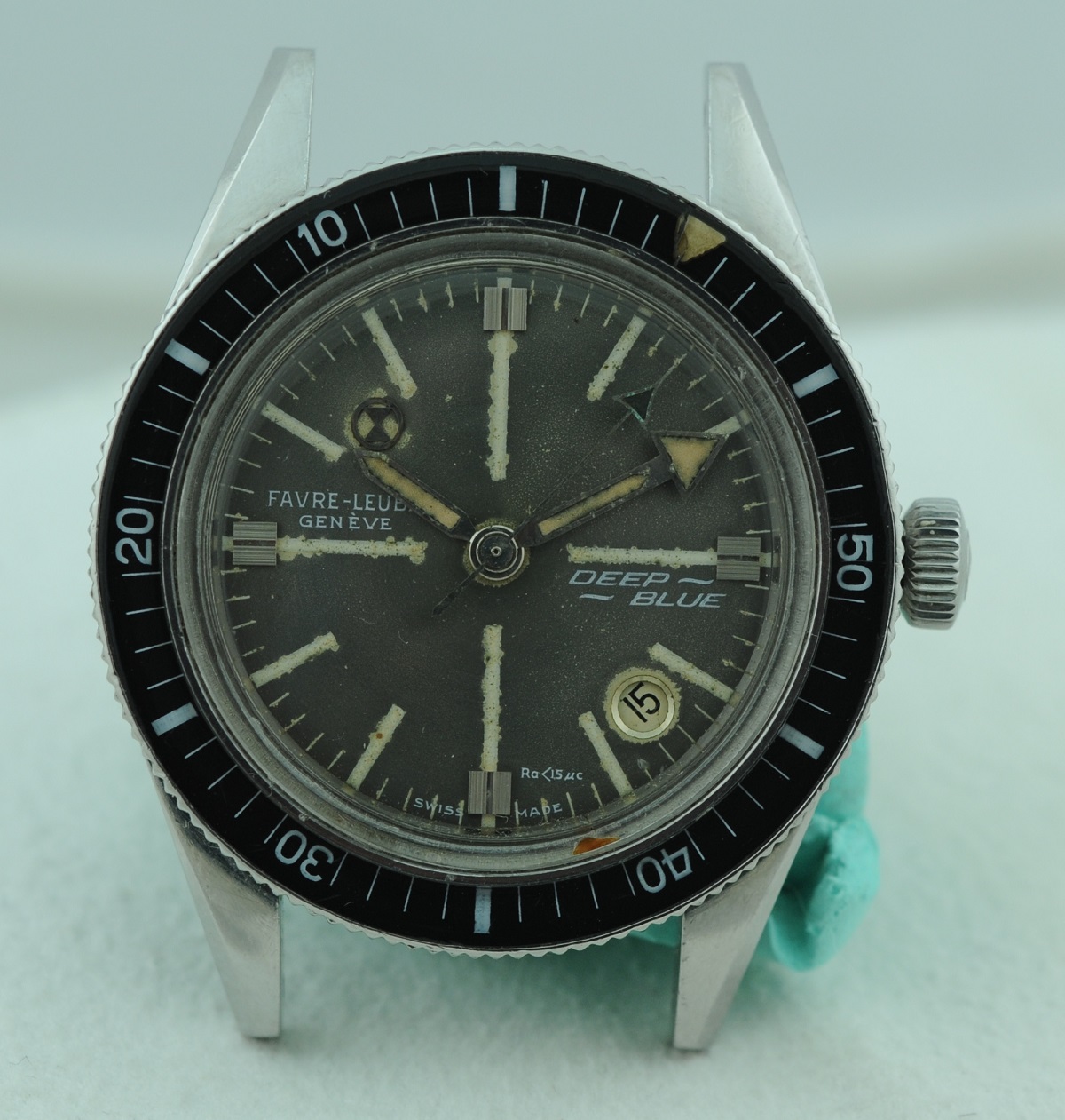 Bezel: Bakelite insert in count-down configuration. Small crack in beige triangular zero marker, otherwise excellent.