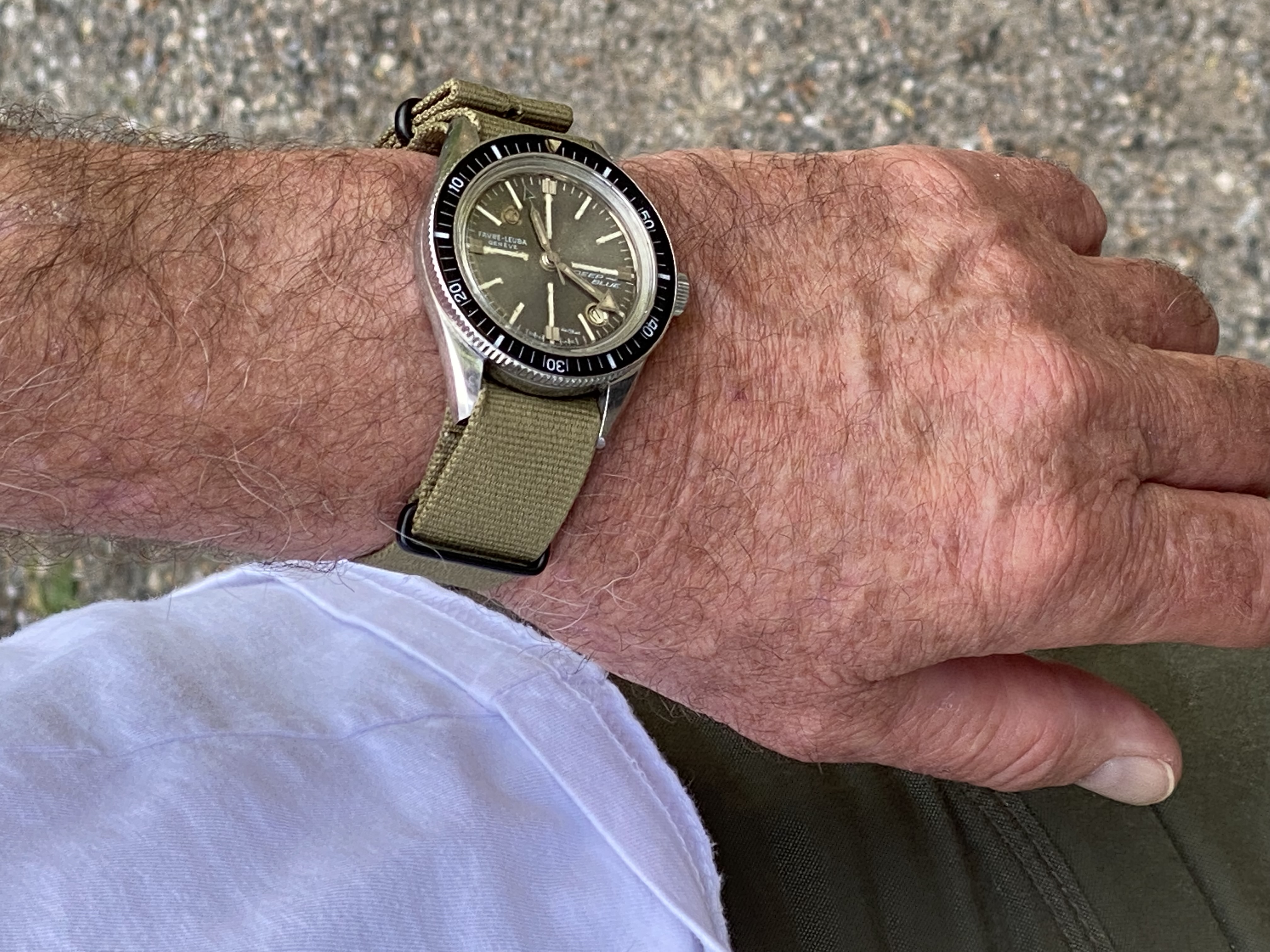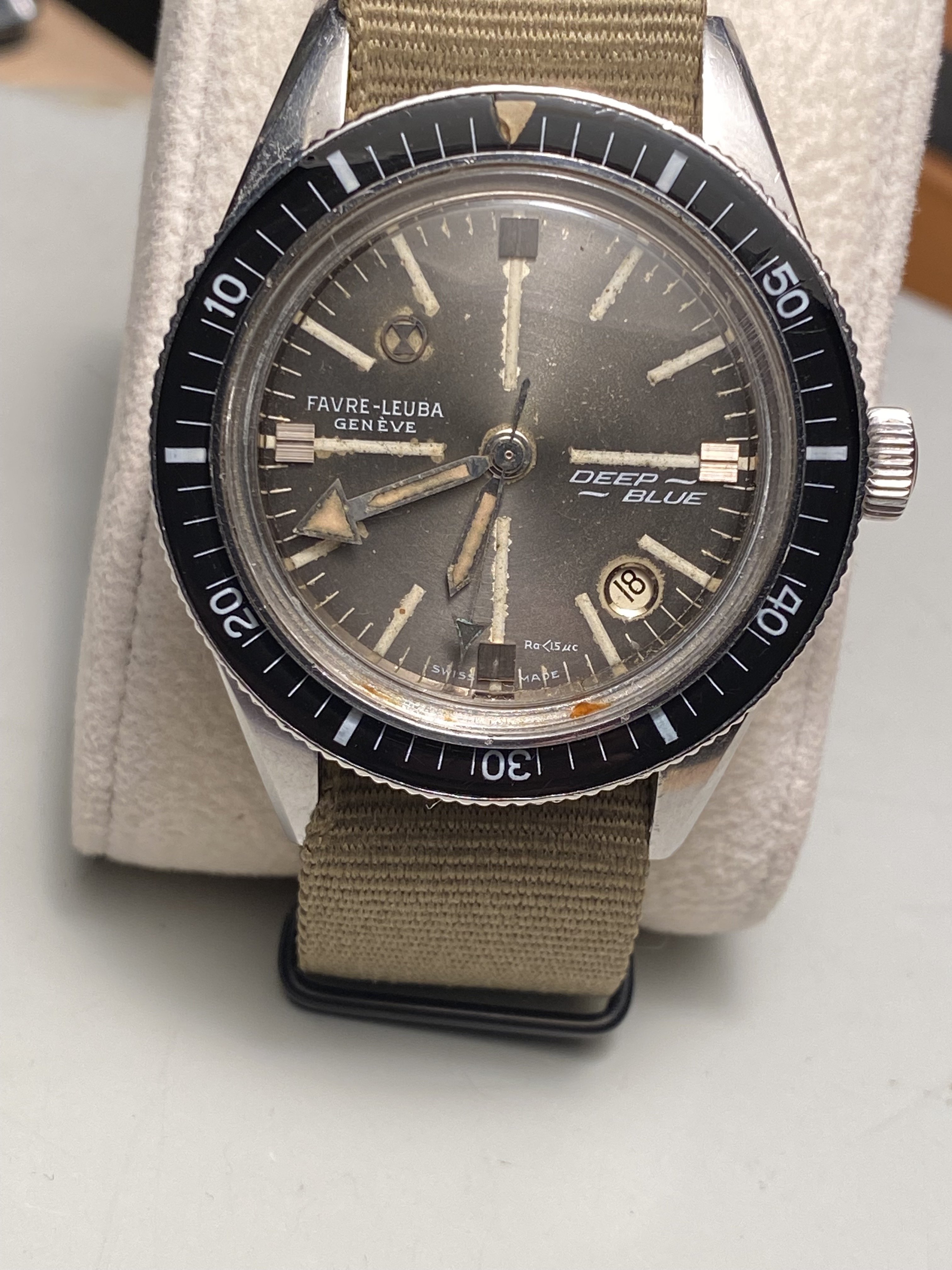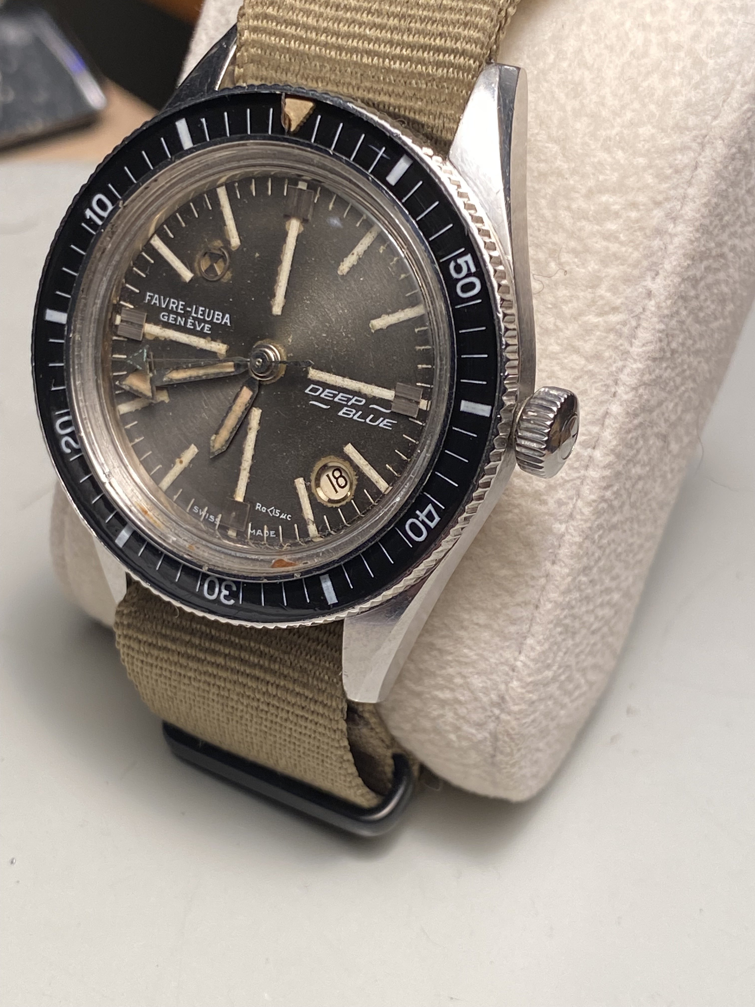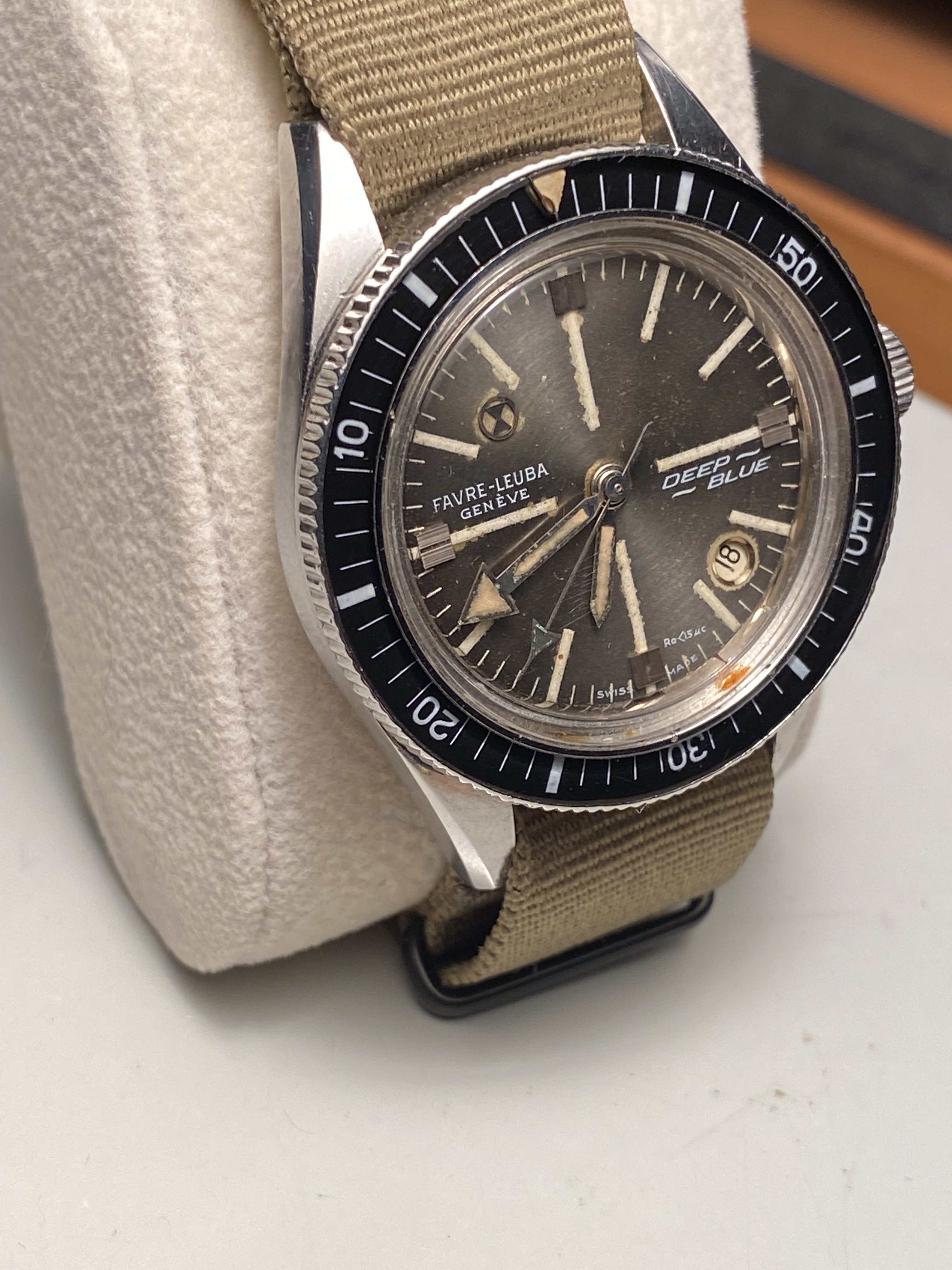 Bezel: Bakelite insert in count-down configuration. Small crack in beige triangular zero marker, otherwise excellent.