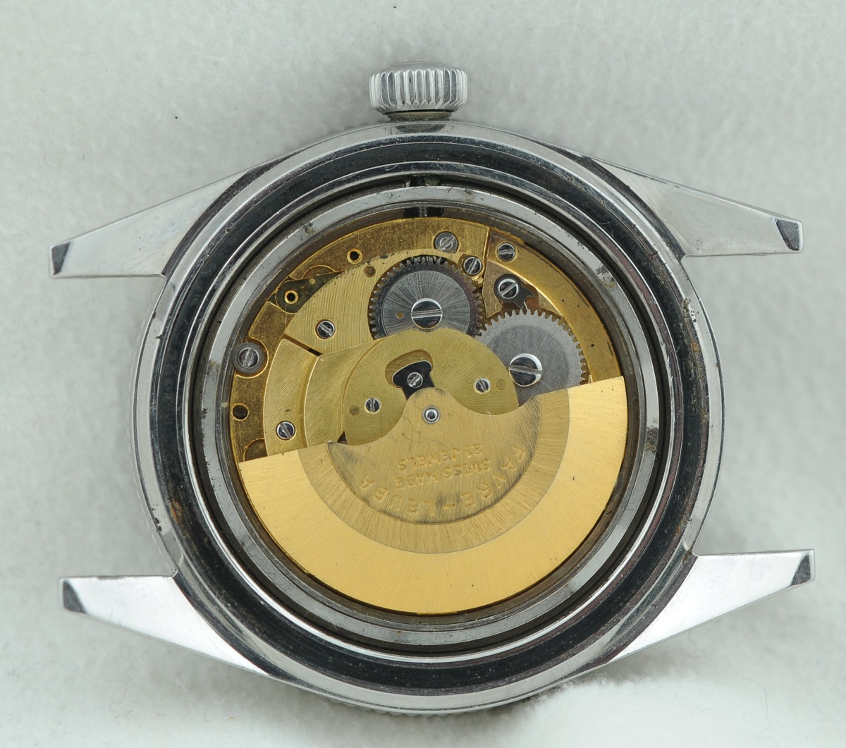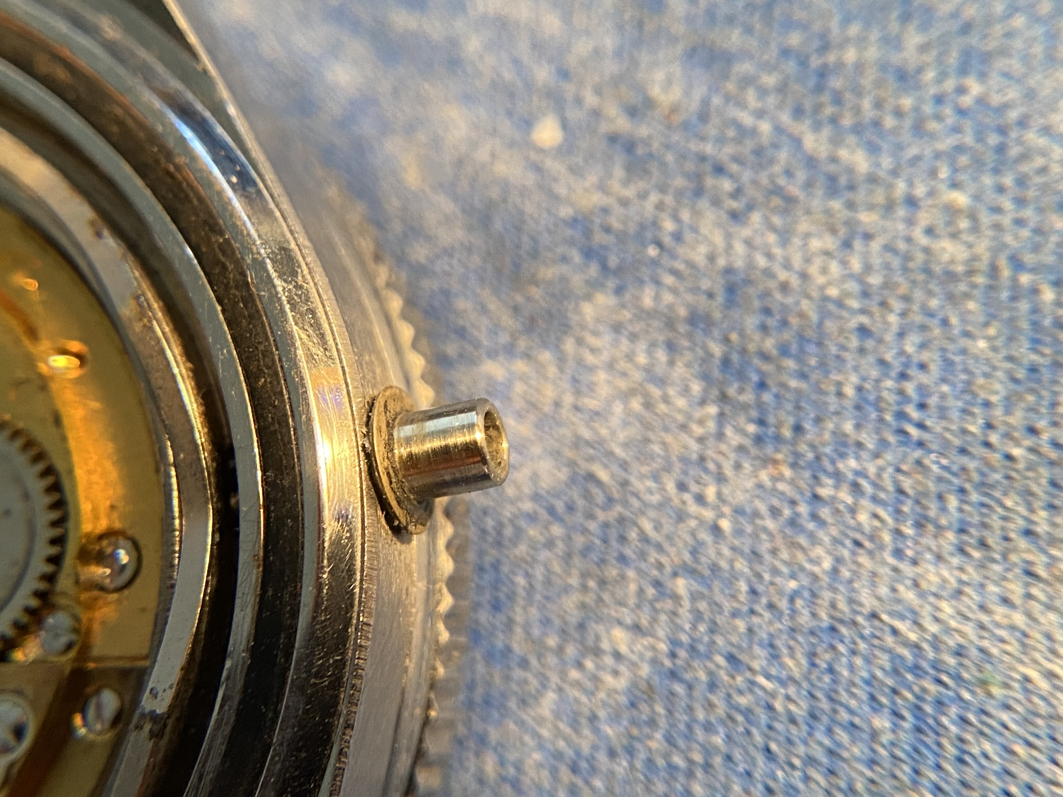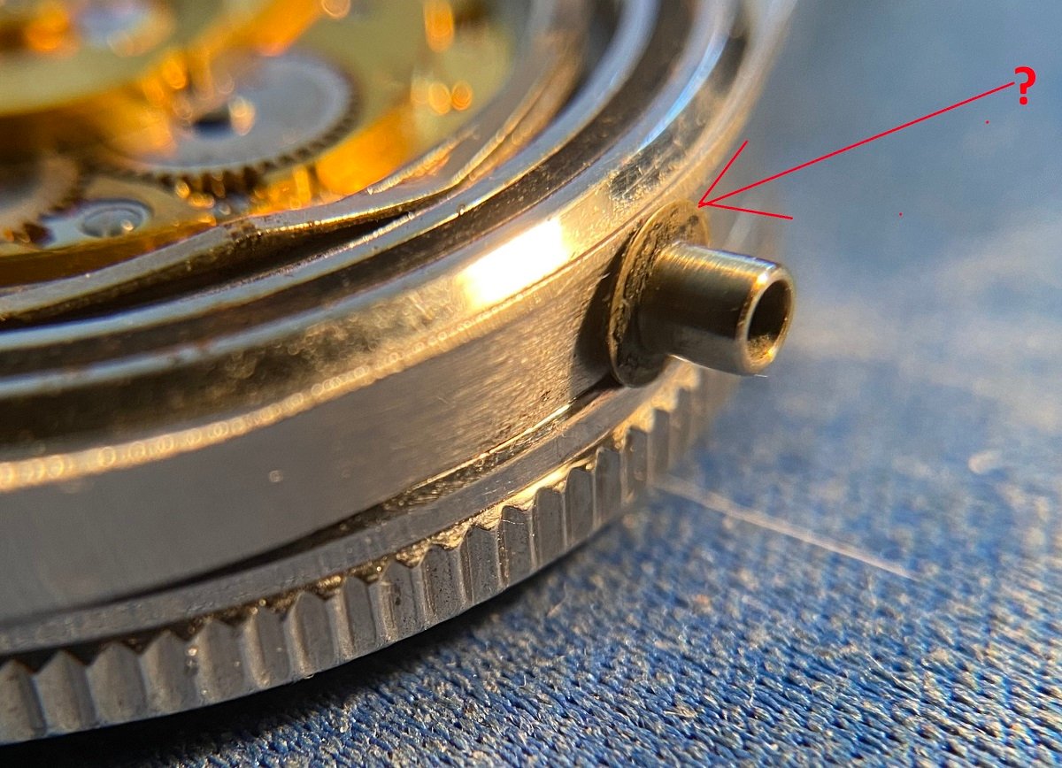 Crown: It is a FL, but an incorrect replacement for this watch. I pulled the stem out for a closer look at the crown tube. It sports a small lip/dish which I believe was placed by the watchmaker to keep the (incorrect) crown from hitting the bezel. Seems plausible to me. See macro pic w/red arrow.