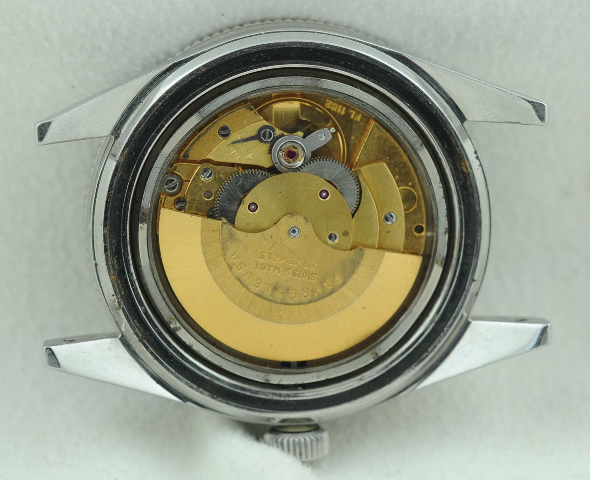 Movement: FL 1152 that looks and is running well. Please assume it needs service as I have no idea if one has ever been done. And it does need the cannon pinion fixed. These 1152 movements can be found all over the place in cheap FL's. So parts, if needed, should not be an issue. Date snaps smartly into place at 12:00