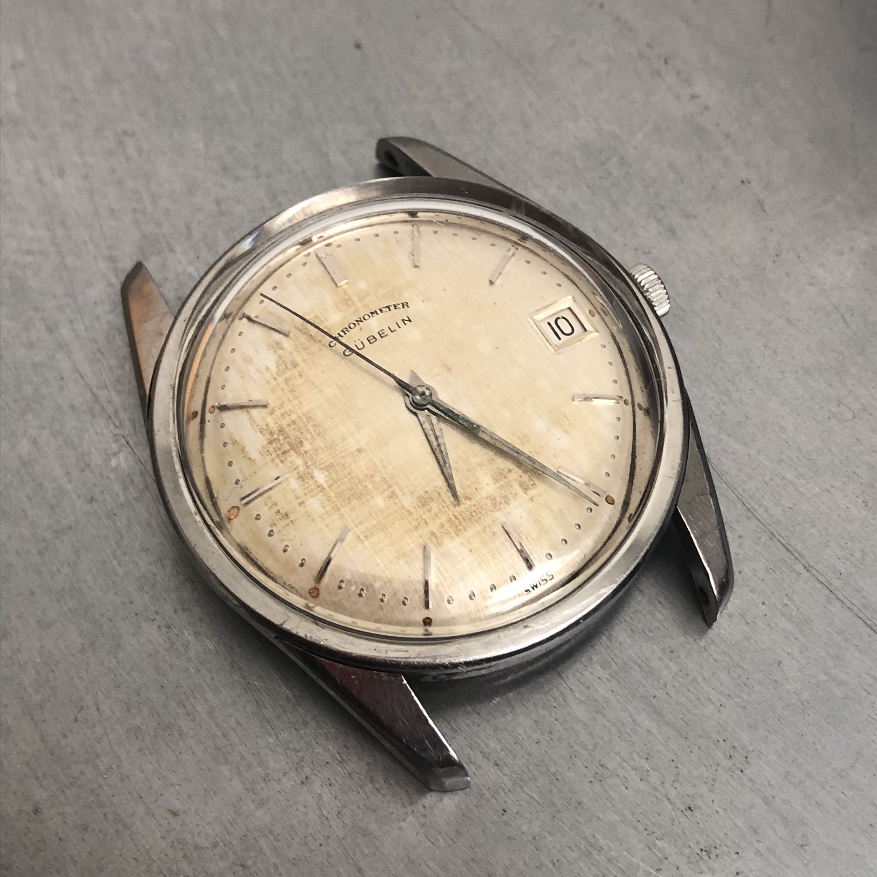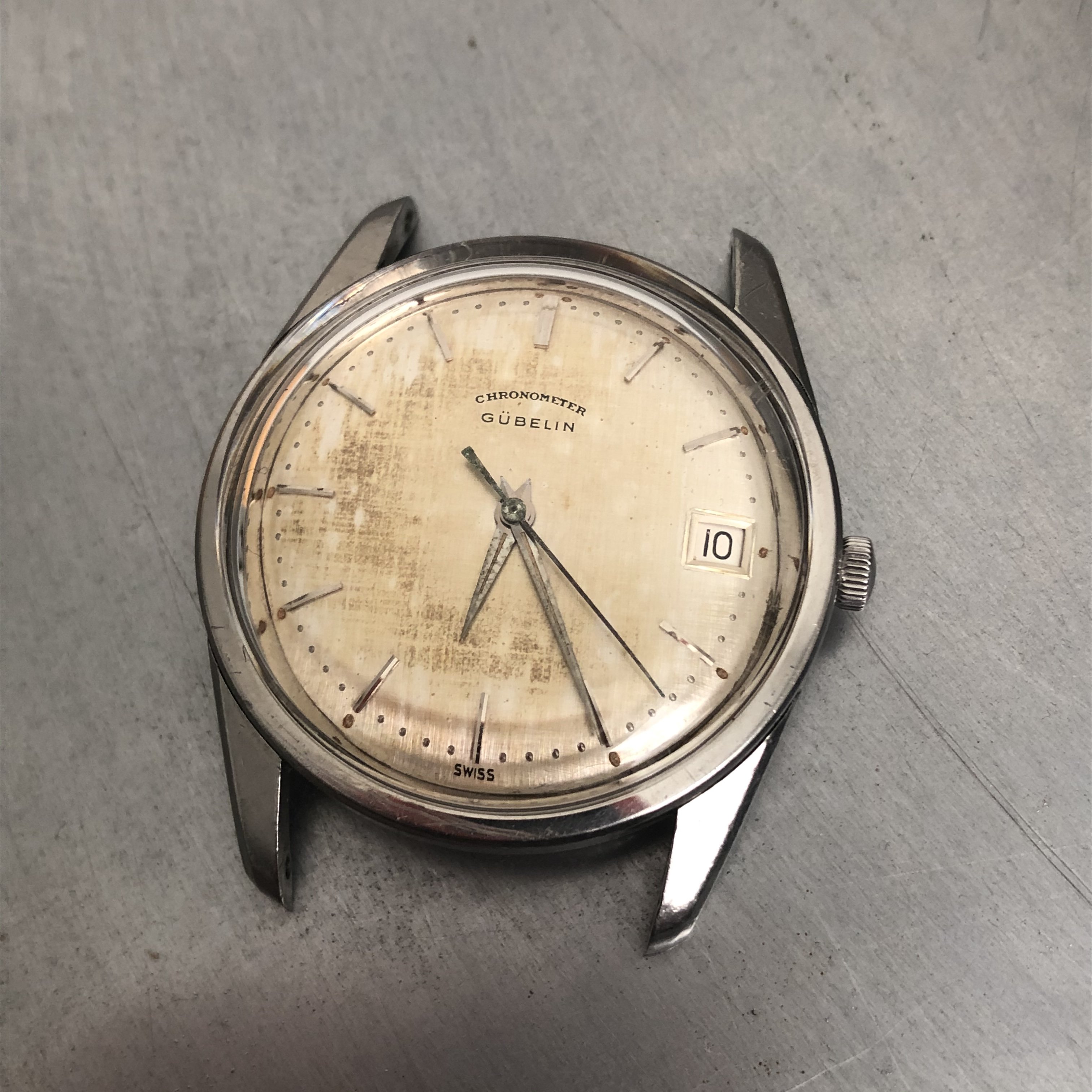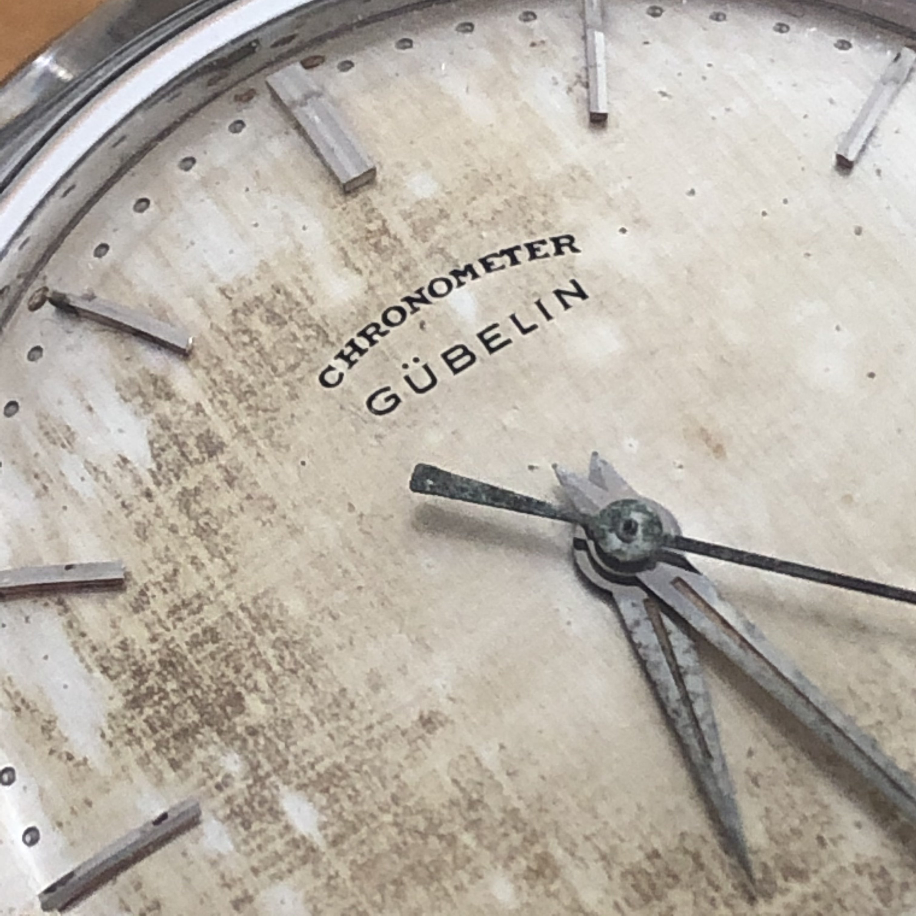·No backstory just a simple sale. Chronometer Gubelin automatic powered by the Eterna 1439U with quick set date. Pull crown out all the way to advance date one day at a time. Light wear to case and patinated dial with shows worse in the pictures than it actually is. No service history but runs well and keeps good time. Sorry no strap with one. I needed it for a Captain. Measures 34.7mm without crown. Please ask questions if necessary. Thanks to OF for the space.