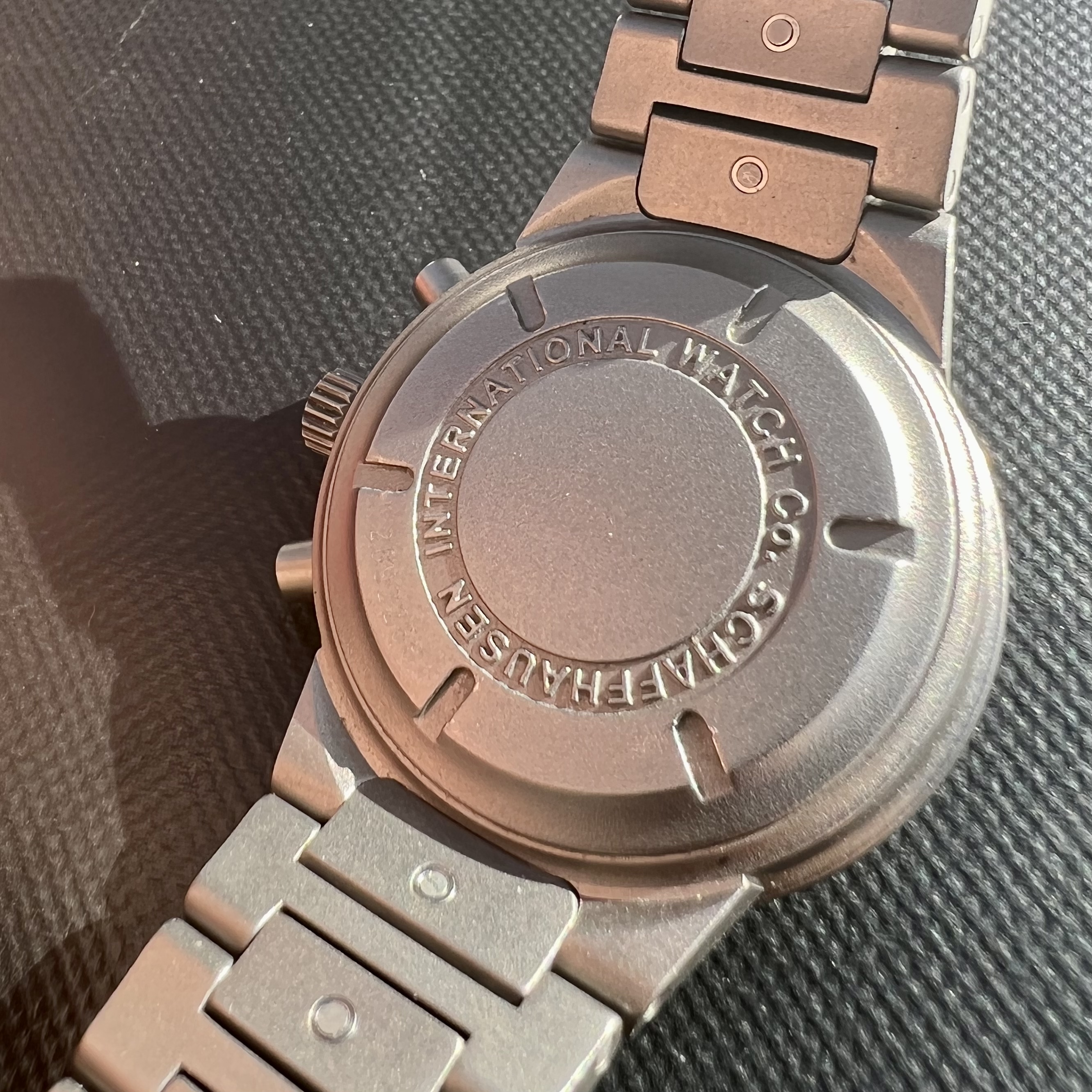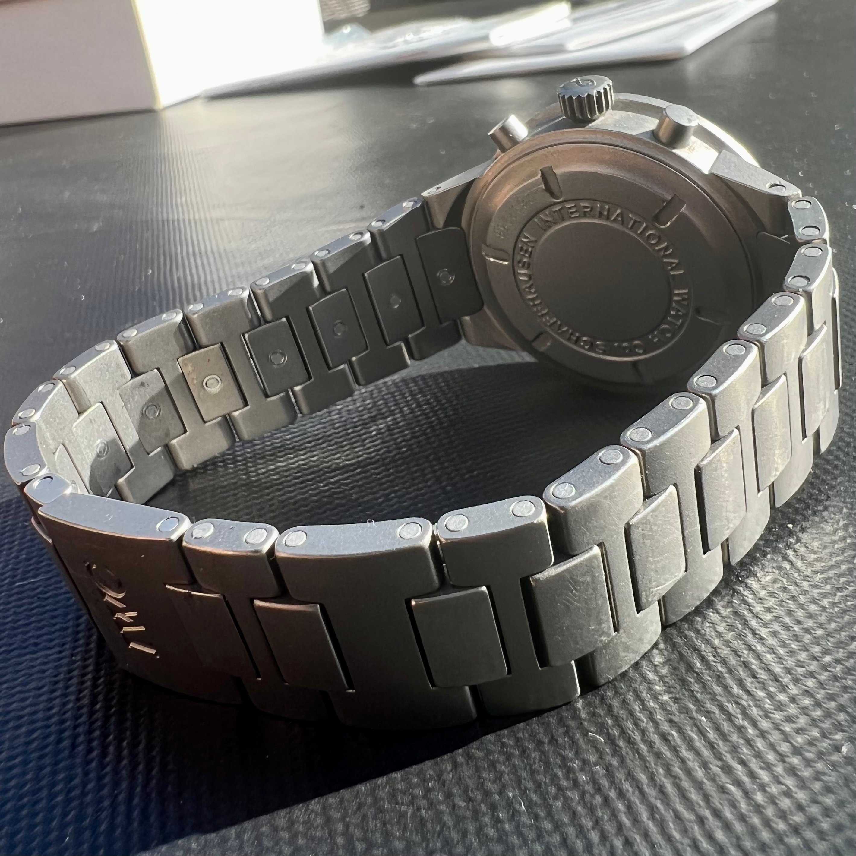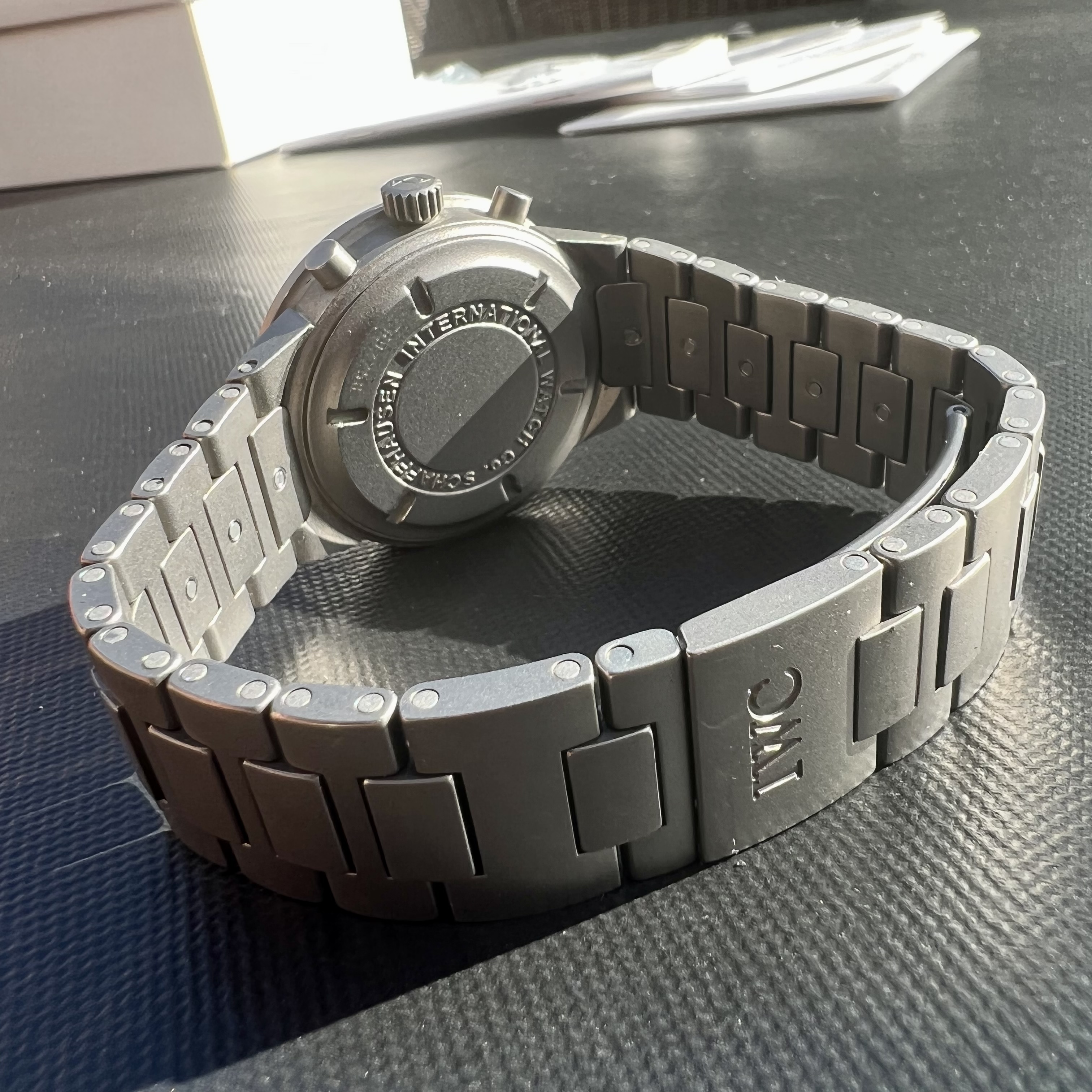 The watch case measures 37mm without the crown, sapphire crystal. The pushers and crown are original. With the pushers it wears a bit bigger, but extremely comfortably. The case back has deep engravings and looks absolutely beautiful. The movement is keeping excellent time, and is the famous mechaquartz made by Jaeger LeCoultre. An IWC sports watch powered by a JLC movement is a really interesting thing indeed. The battery was changed last year by IWC and the watch passed its pressure test. The dial and hands are all original of course. The bracelet contains all of the links, and there are some desk-diving scratches as one would expect.